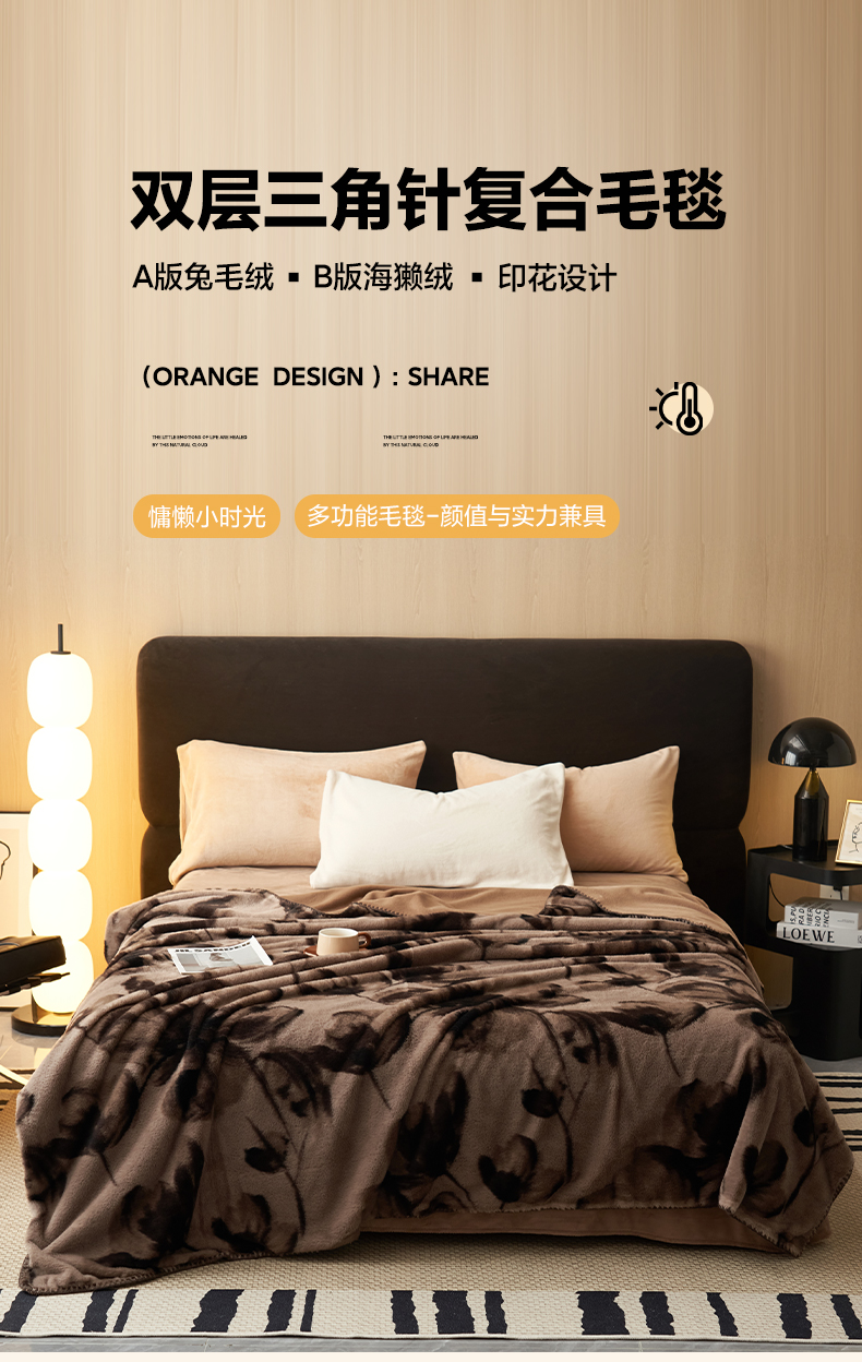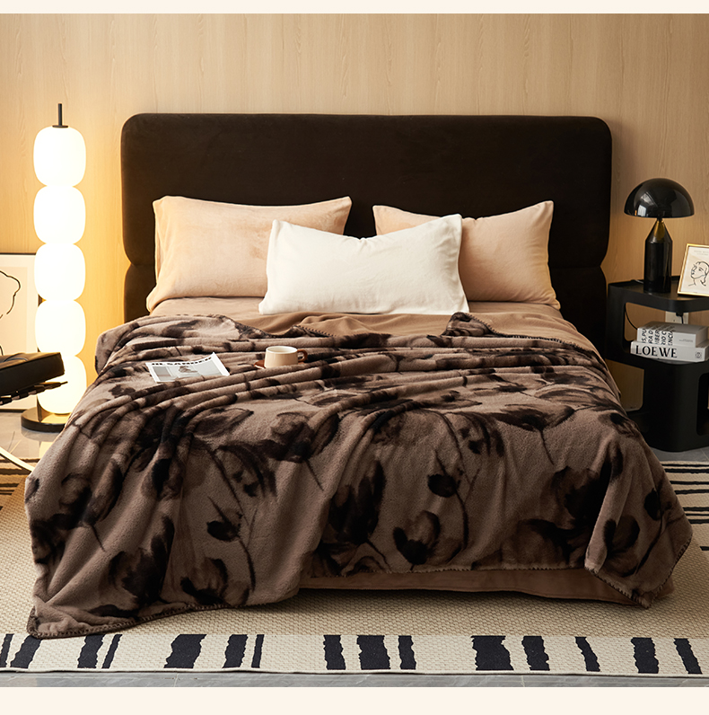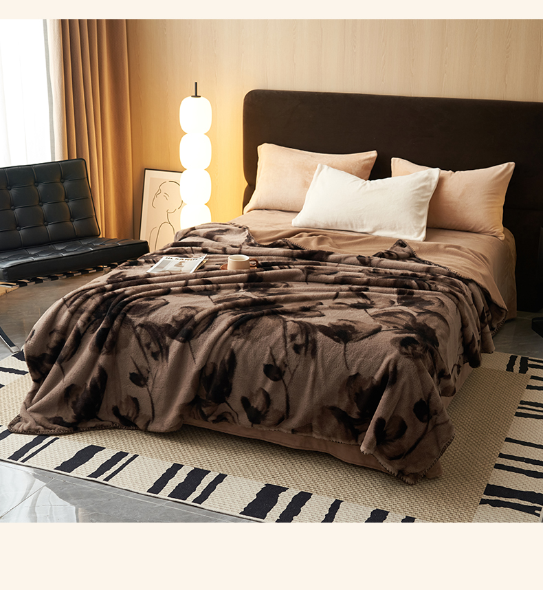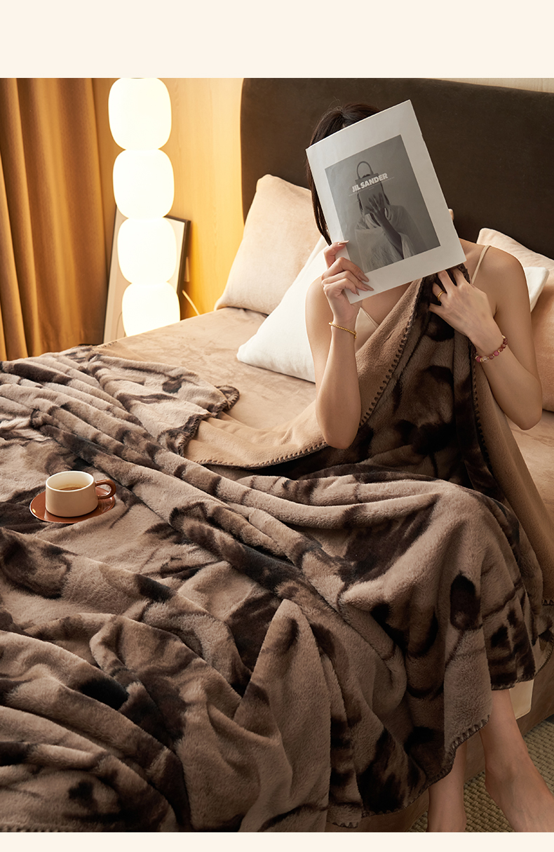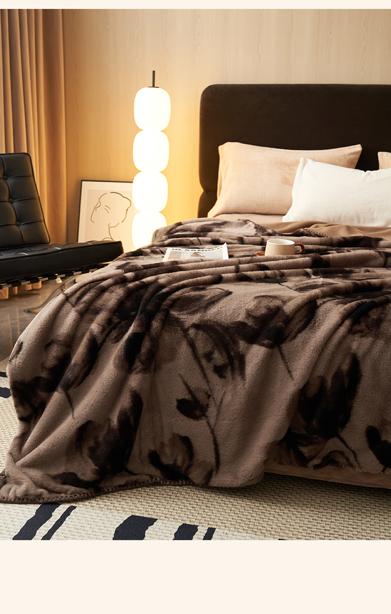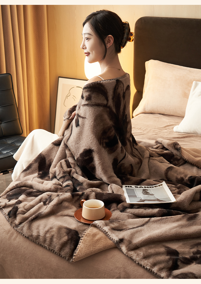 晨曦家纺 2025新款兔毛绒海獭绒双层毛毯三角针复合毛毯 水墨画-深咖