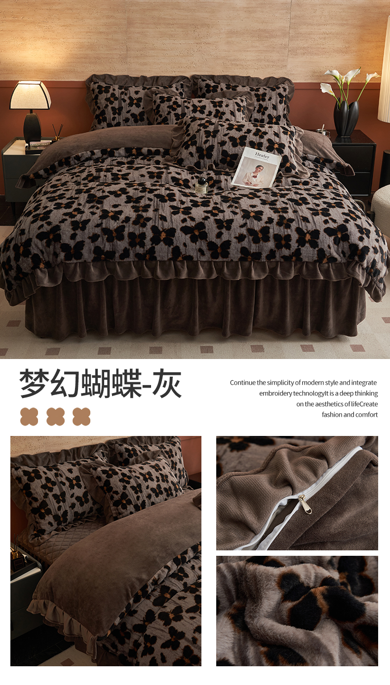 商品名称:金鹰 2025新款A类兔毛绒夹棉床裙四件套加厚牛奶绒四件套 梦幻蝴蝶-灰
