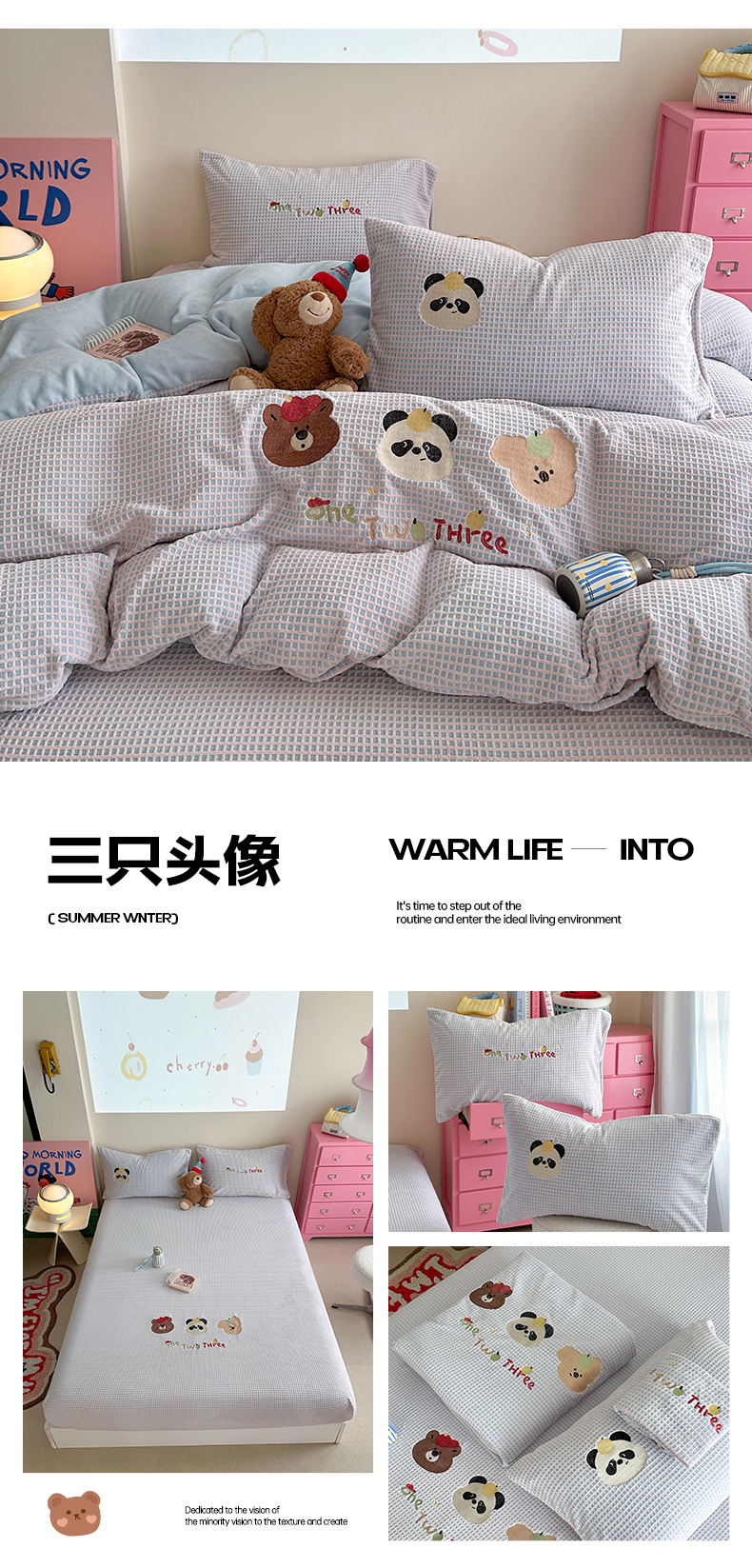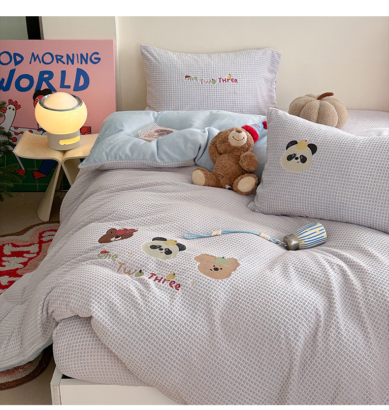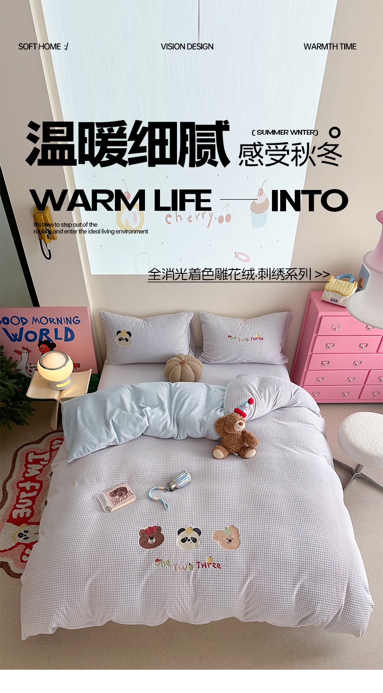 (总)暖生活 2025新款高克重细颗粒羊羔绒牛奶绒毛巾绣四件套,梅梅熊,童年时光-兰,童年时光-米,小短腿