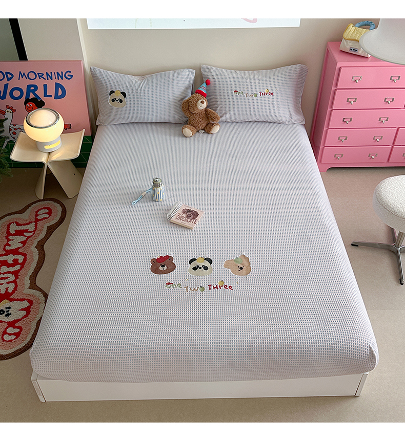 (总)暖生活 2025新款全棉磨毛毛巾绣床笠三件套,组合,山竹小白,黄鸭小兔,蓝帽腊肠狗,手办小熊,蓝格红苹果,红鼻小熊,黑猫蛋糕,糖果熊,推车小熊