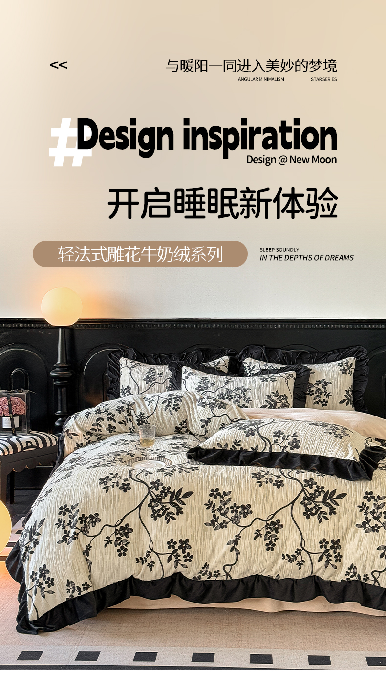 宅家居 2025新款热卖热款轻法式复古赫本风绒高克重浮雕花牛奶绒四件套烂花韩版黑色花边三件套 叶语悠然