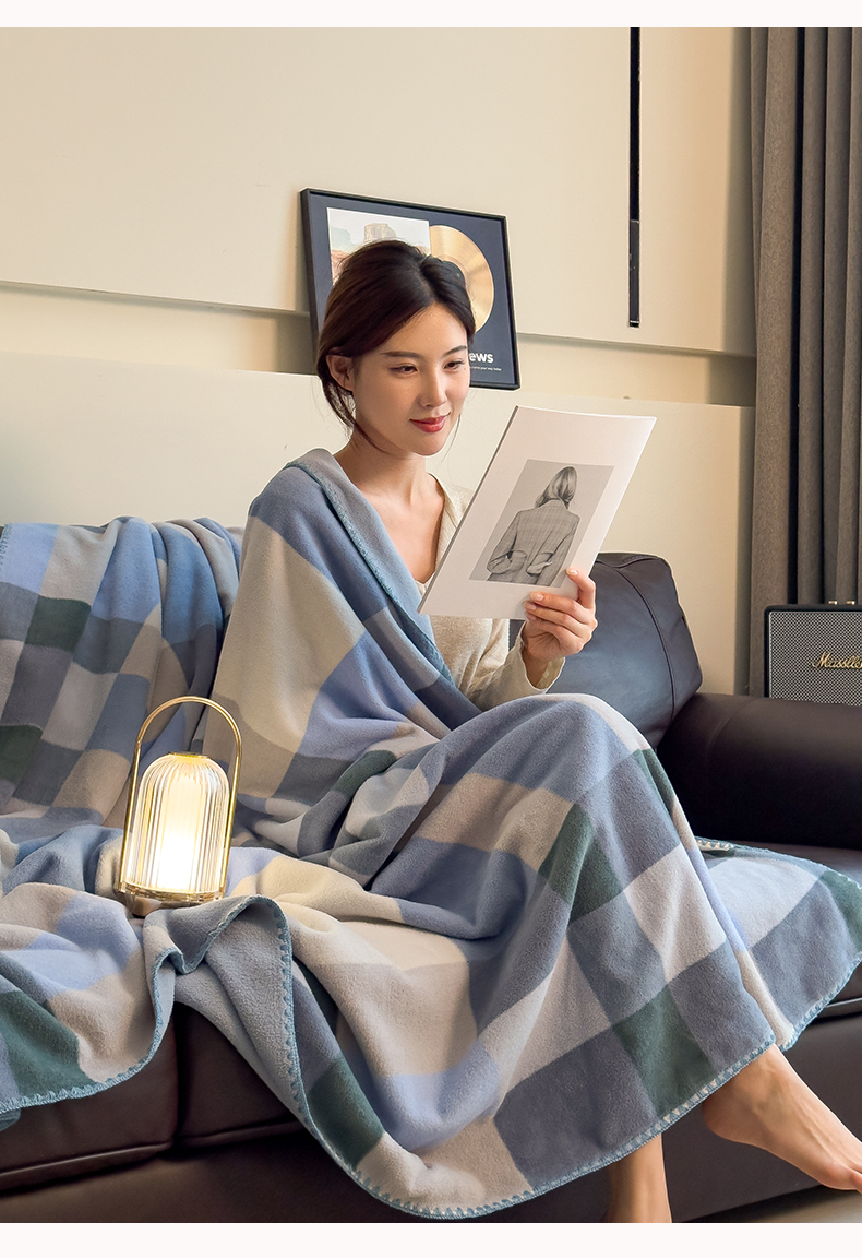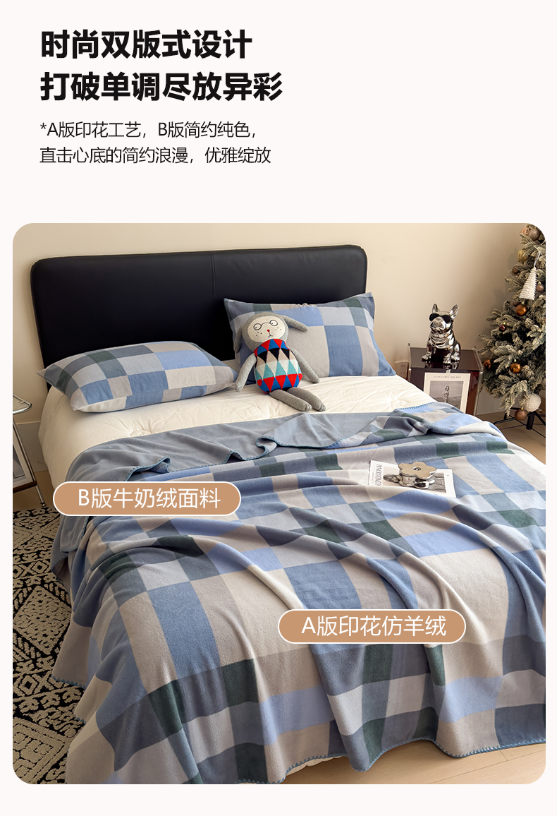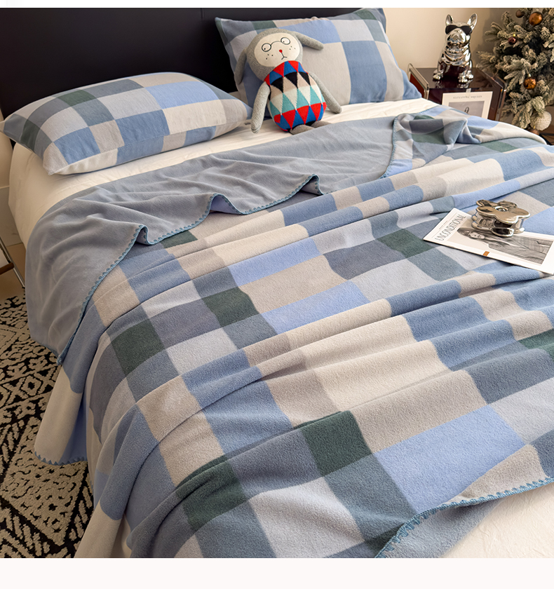 慕木家纺 2025新款高克重印花仿羊绒双层毛毯毛毯毯子(可供跨境提供买家秀) 冰蓝格序-蓝灰