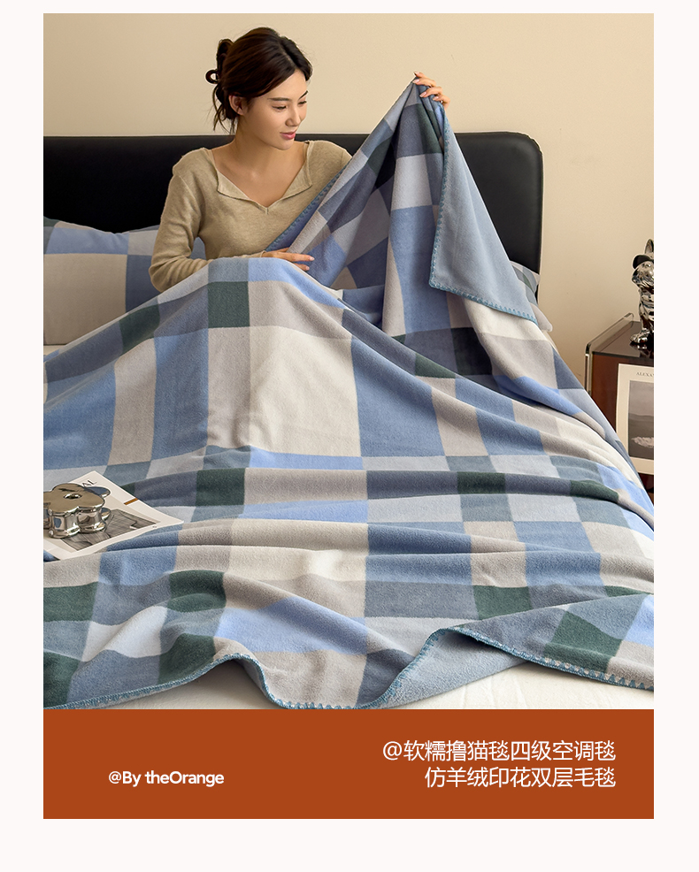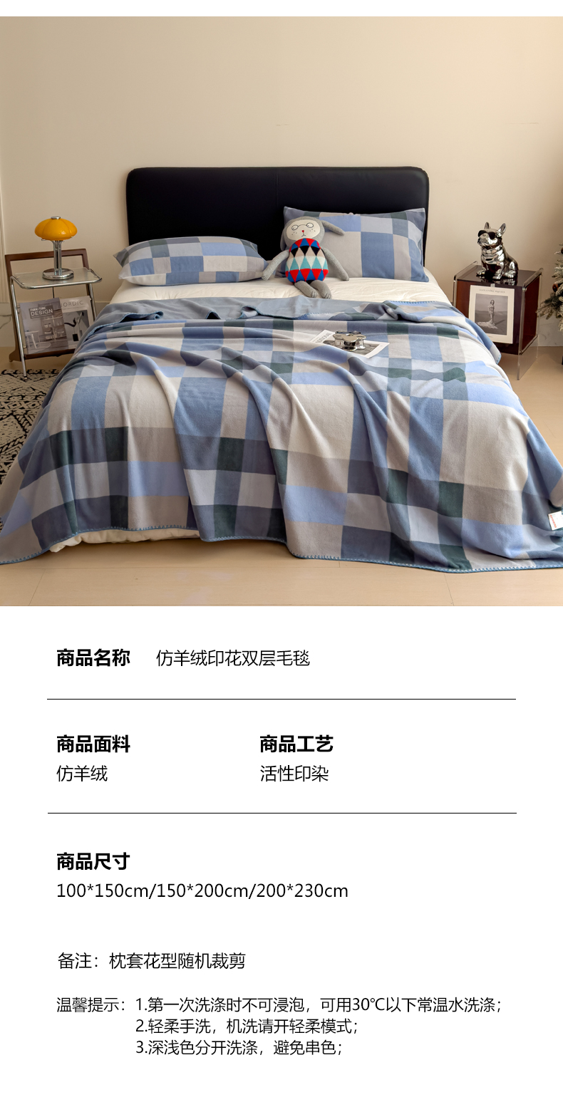 商品名称:慕木家纺 2025新款高克重印花仿羊绒双层毛毯毛毯毯子(可供跨境提供买家秀) 冰蓝格序-蓝灰