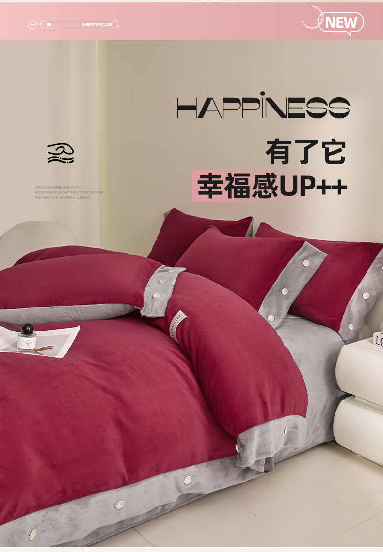 商品名称:吾诺家居 吾诺 2025 双拼色牛奶绒四件套纽扣四件套钮扣牛奶绒四件套 - 纽扣系列 钮扣-酒红色