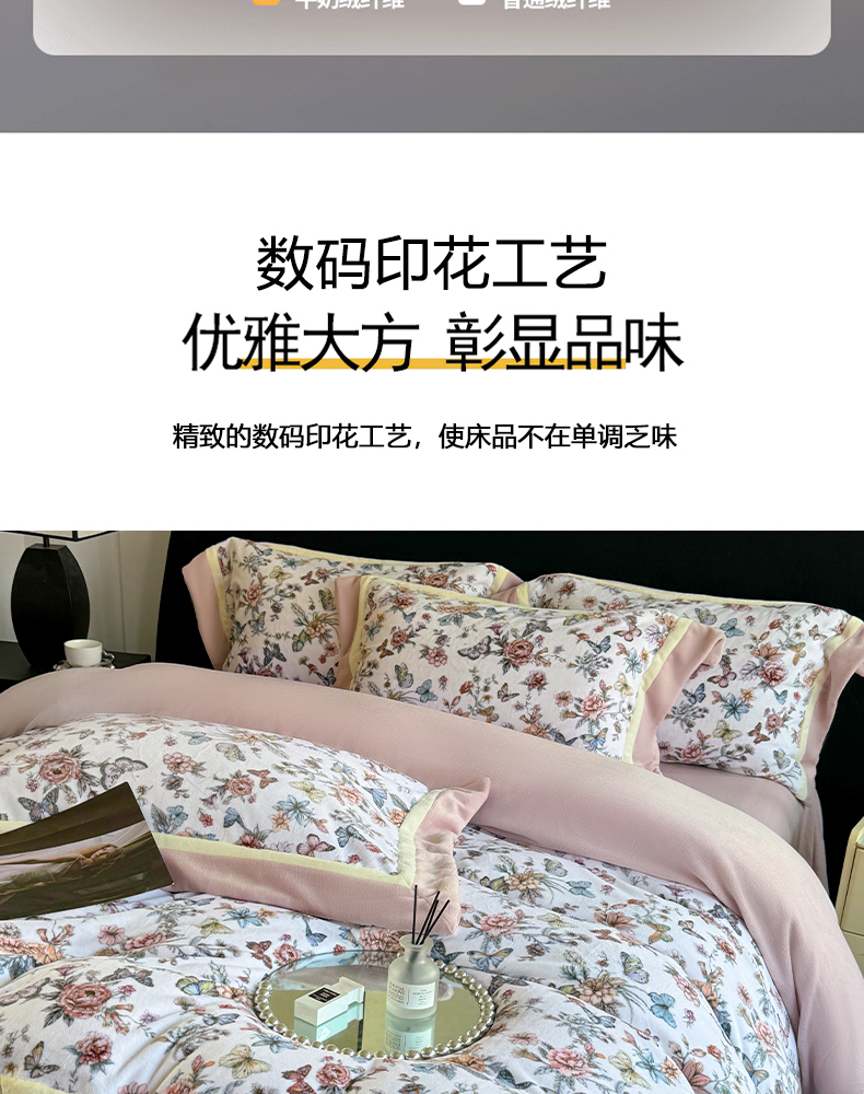 商品名称:娇逸家居 2025新款高克重A类数码印花牛奶绒双拼边款四件套 秋灵粉