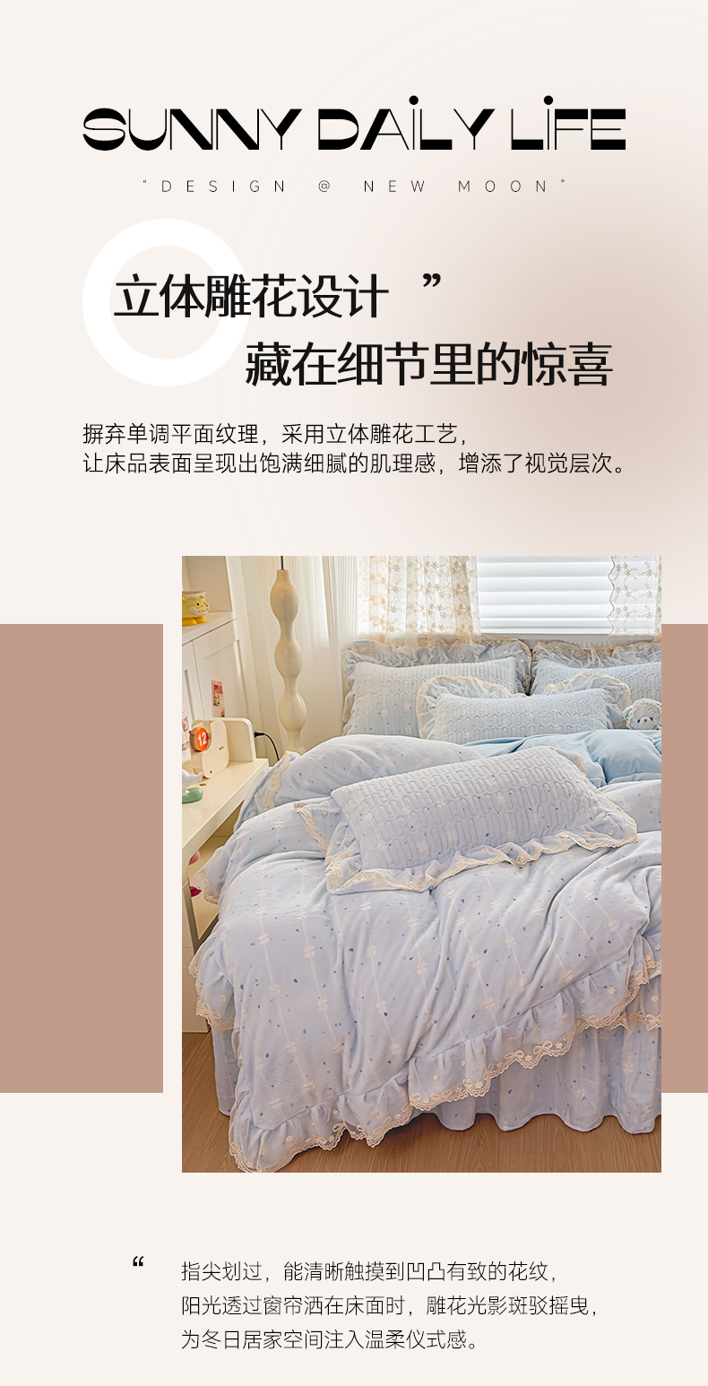 (总)家之硕家纺 2025新款立体雕花可拆洗牛奶绒床裙四件套,爱莎粉,安妮绿,彩虹糖-浅蓝,花韵,秘密花园,田园生活