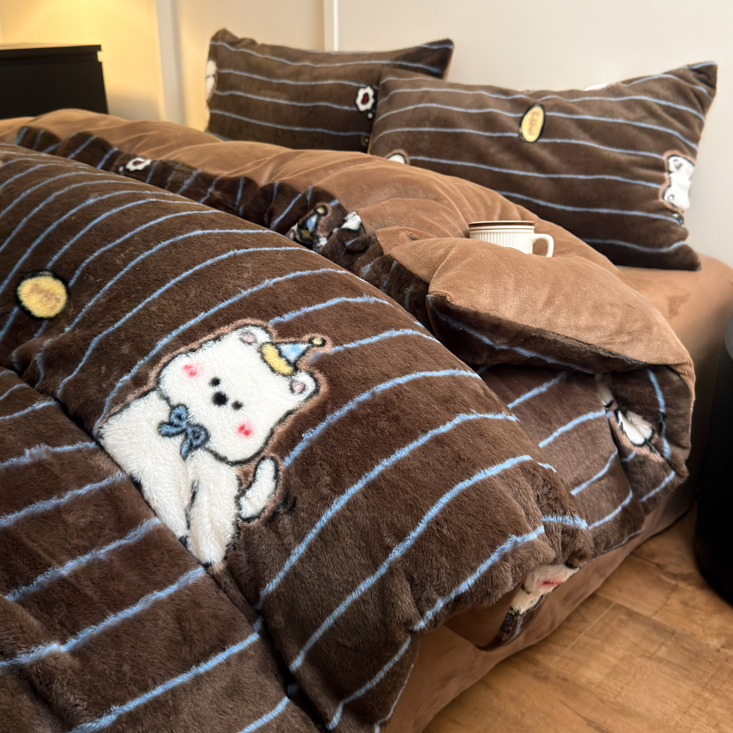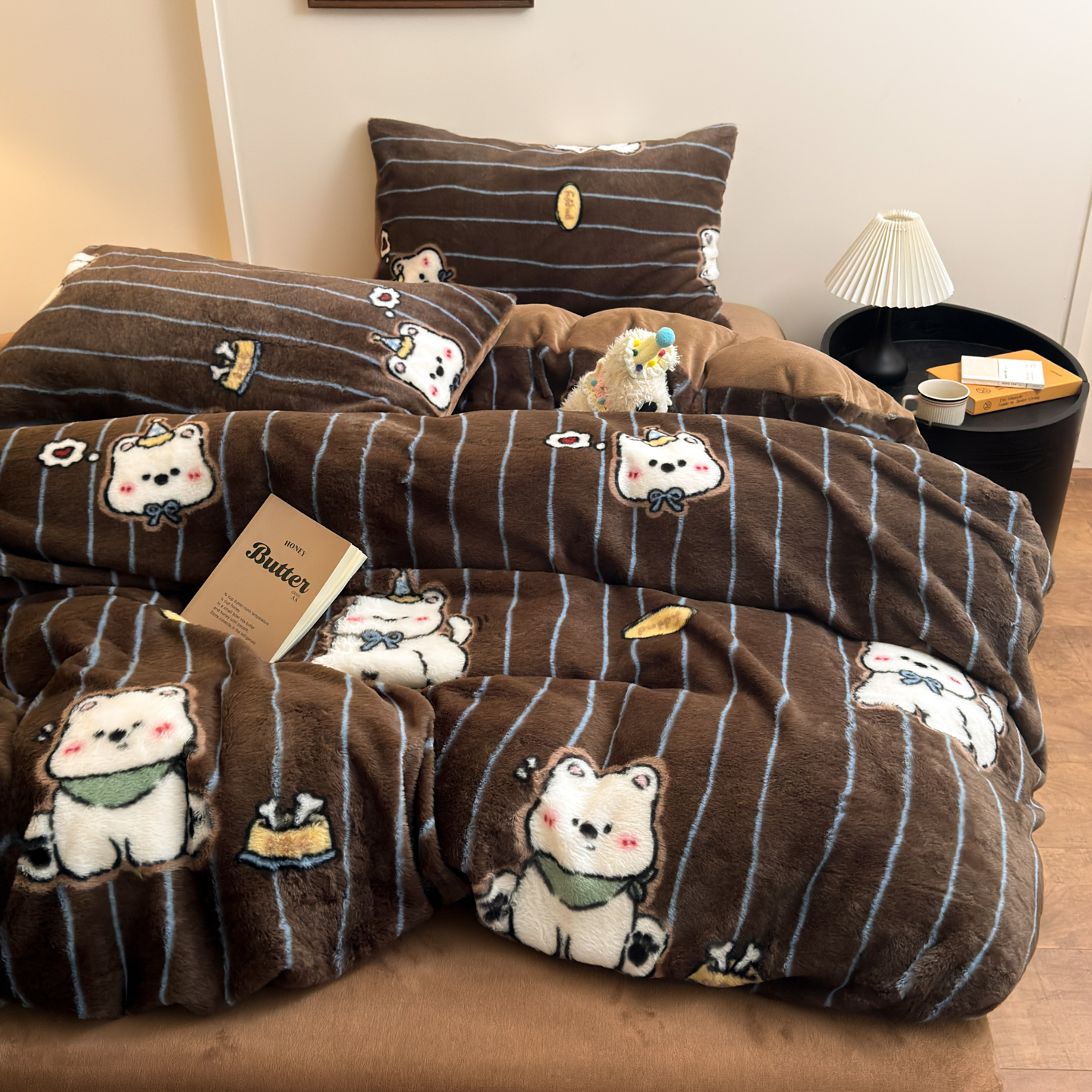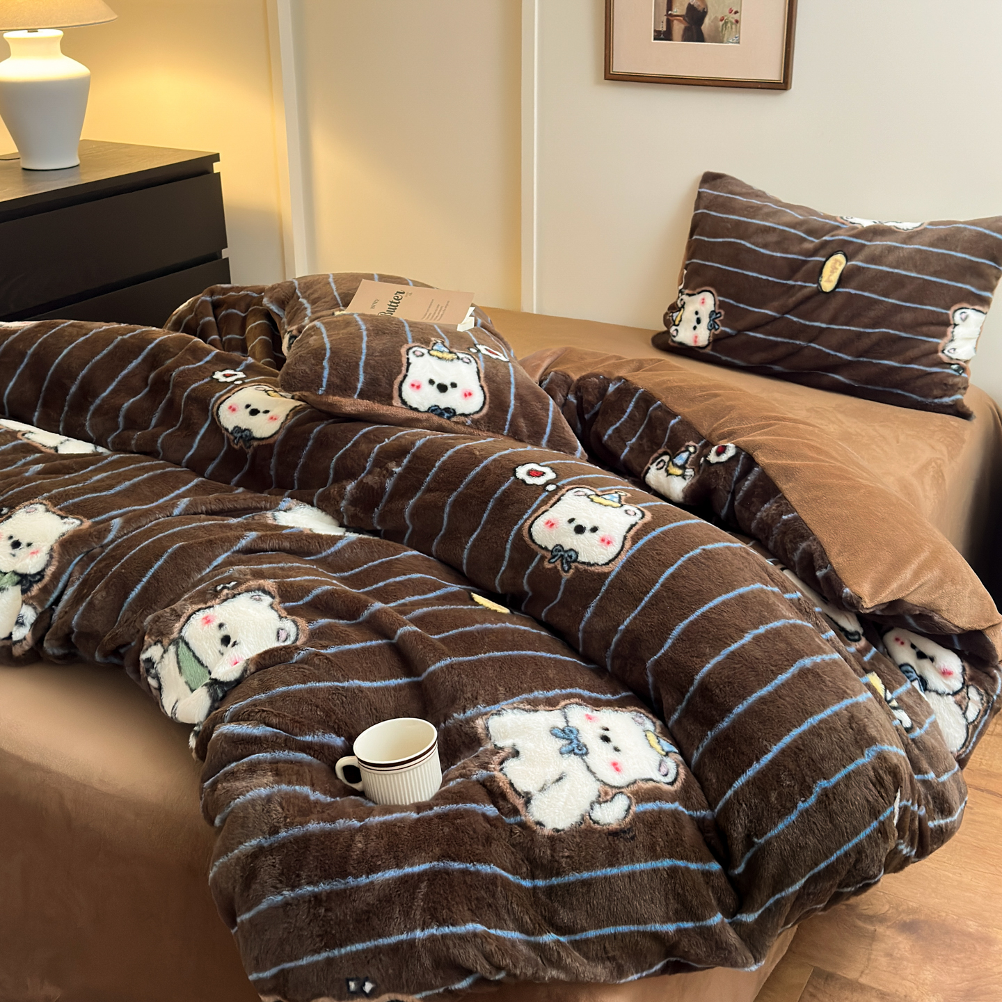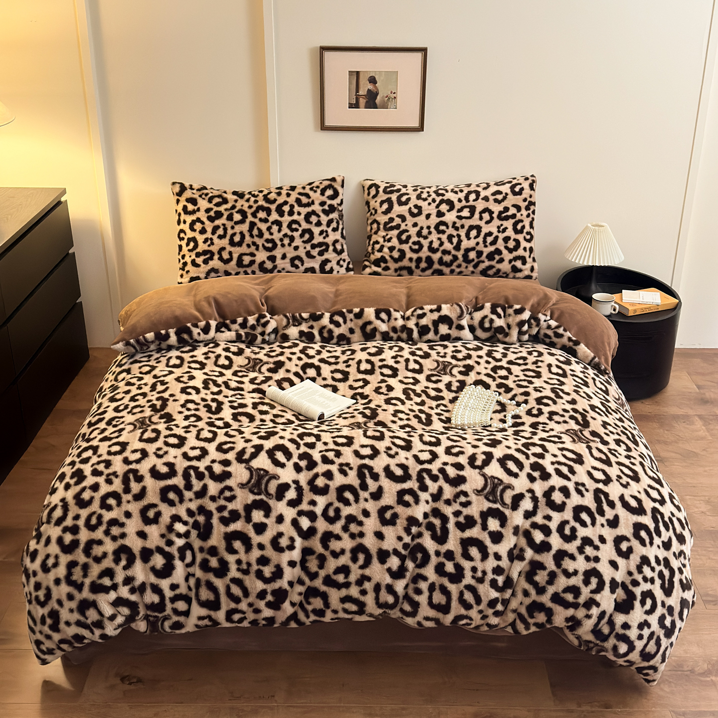 商品名称:乐童家纺 2025新款高克重兔毛牛奶绒四件套 兔毛豹纹咖