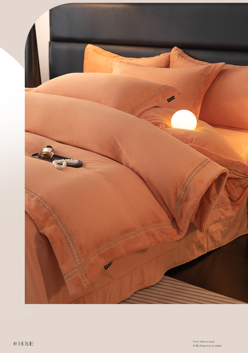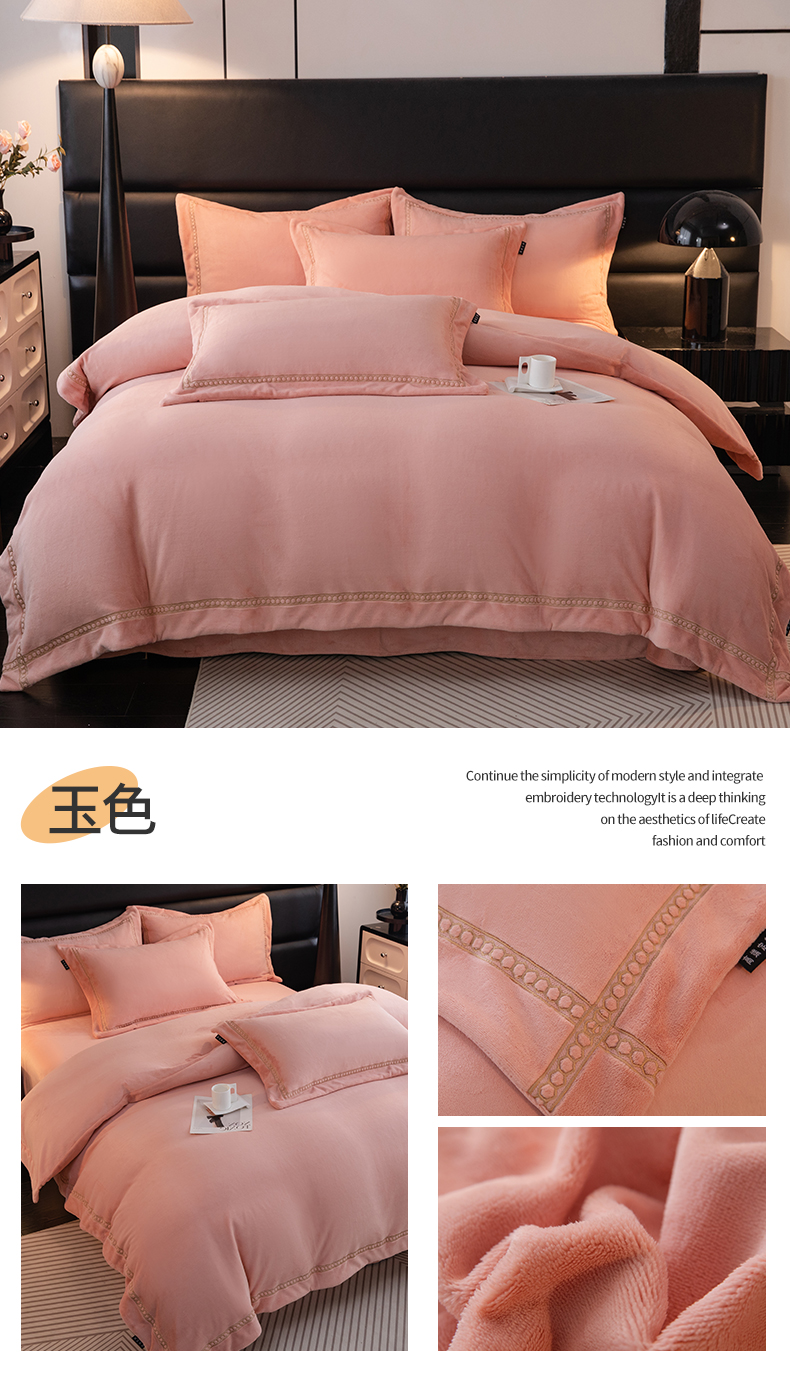 (总)暖洋 2024新款A类暖芙绒纯色刺绣工艺款牛奶绒四件套,爱码橙,湖绿色,蓝灰,藕粉,香槟色,杏仁,银灰色,玉色,富贵,血青,胭脂红