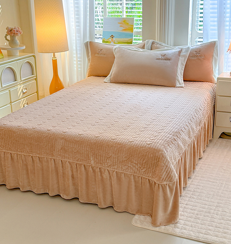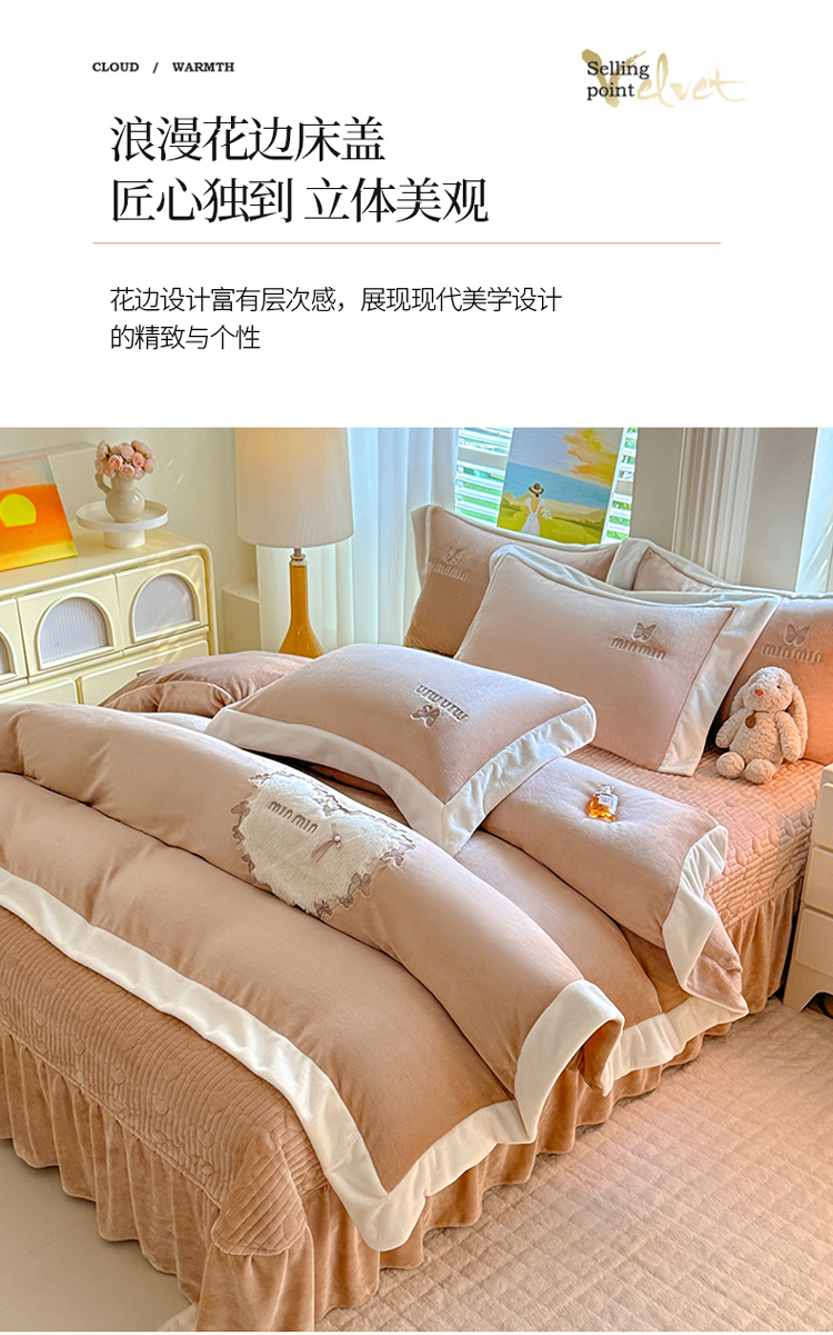 漫布云2025秋冬简约轻奢款230g全消光牛奶绒兔毛绒贴布绣花夹棉床盖款四件套纯色蕾丝花边刺绣床裙款床盖--心愿系列 心愿—香槟金