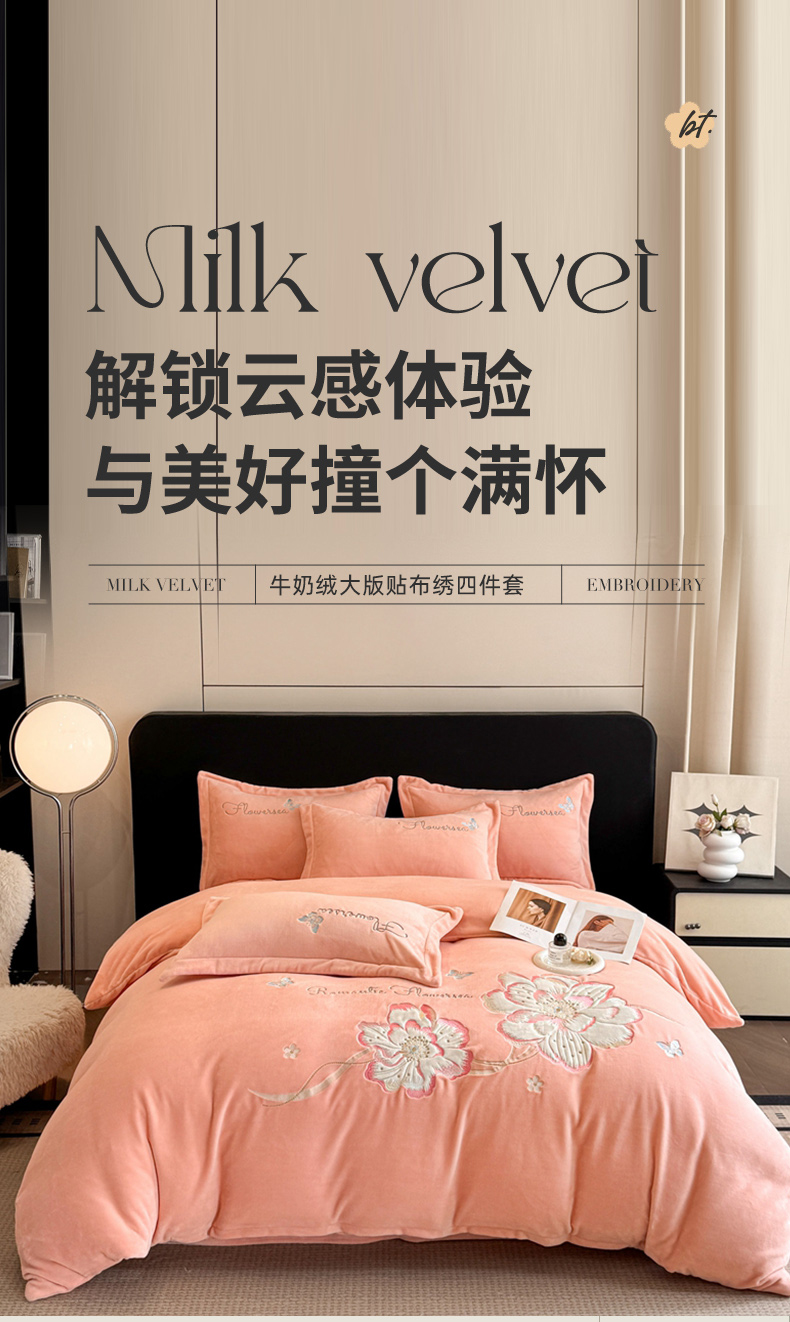(总)畅畅家纺 2025新款牛奶绒大版贴布绣四件套,富贵花开-粉色,富贵花开-红豆沙,富贵花开-灰,富贵花开-橘色,富贵花开-麦黄,富贵花开-米杏,富贵花开-天空蓝,富贵花开-熏衣紫,富贵花开-玉色