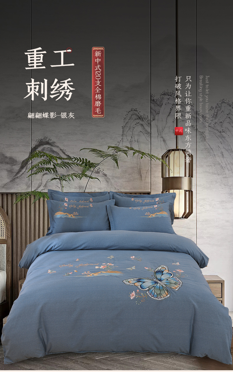 浩情国际婚庆供货中心 2026新款秋冬60S高端全棉刺绣磨毛系列 翩翩蝶影-银灰