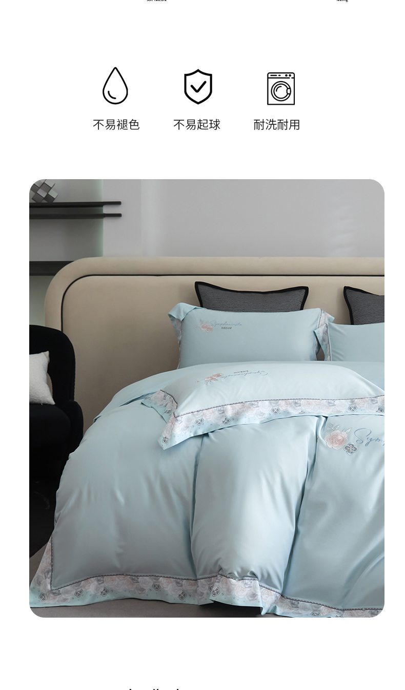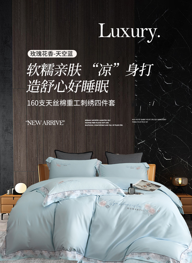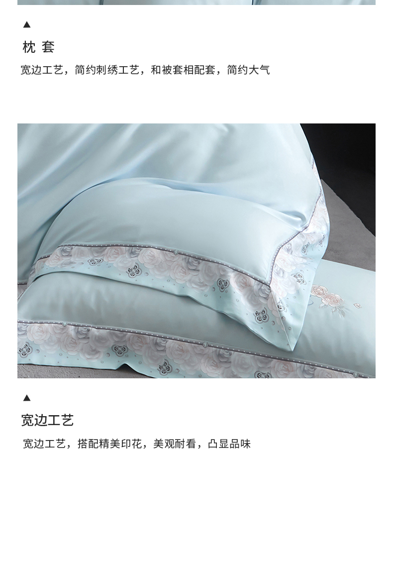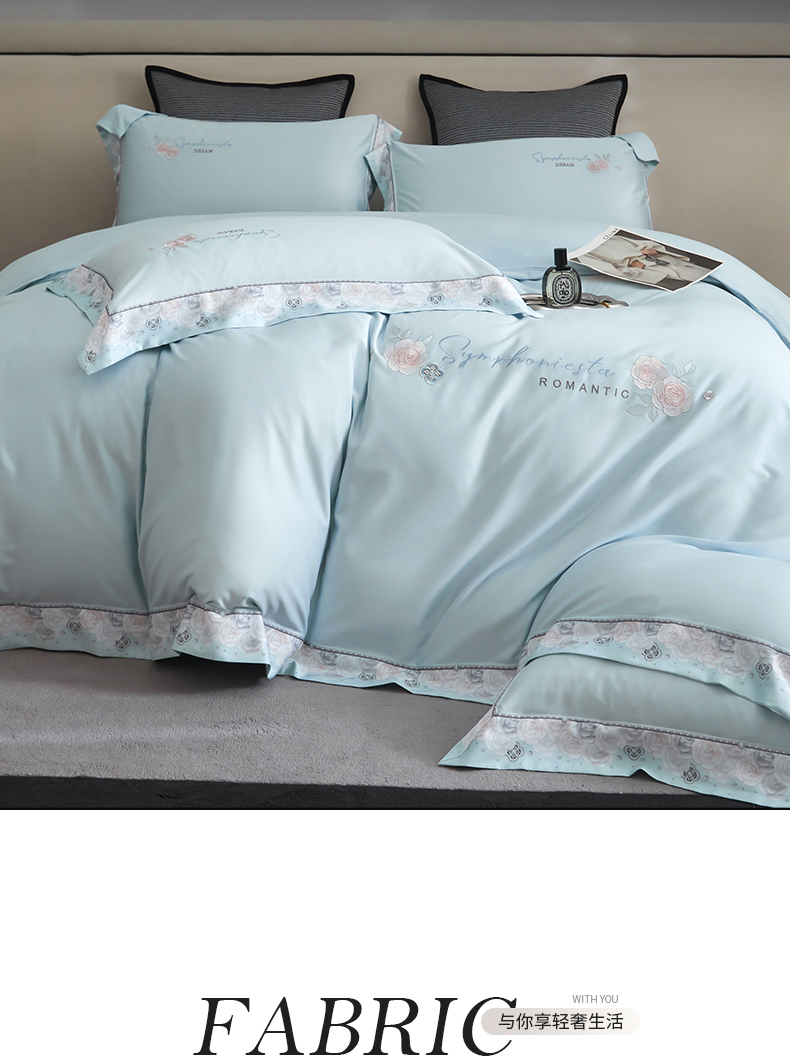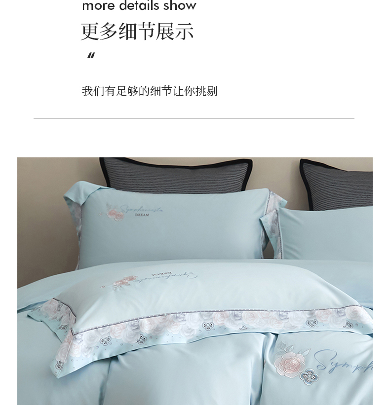 商品名称:浩情国际婚庆供货中心 2026新款160S春夏天丝棉高端刺绣系列四件套 玫瑰花香-天空蓝