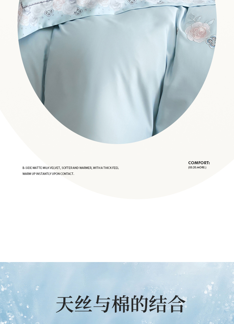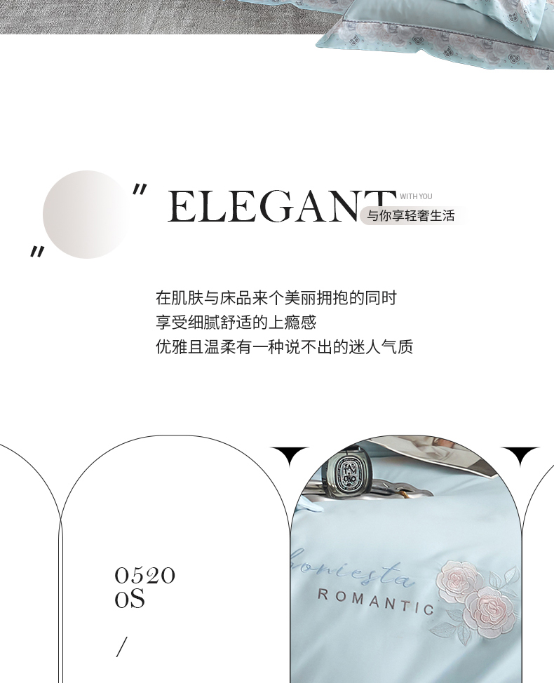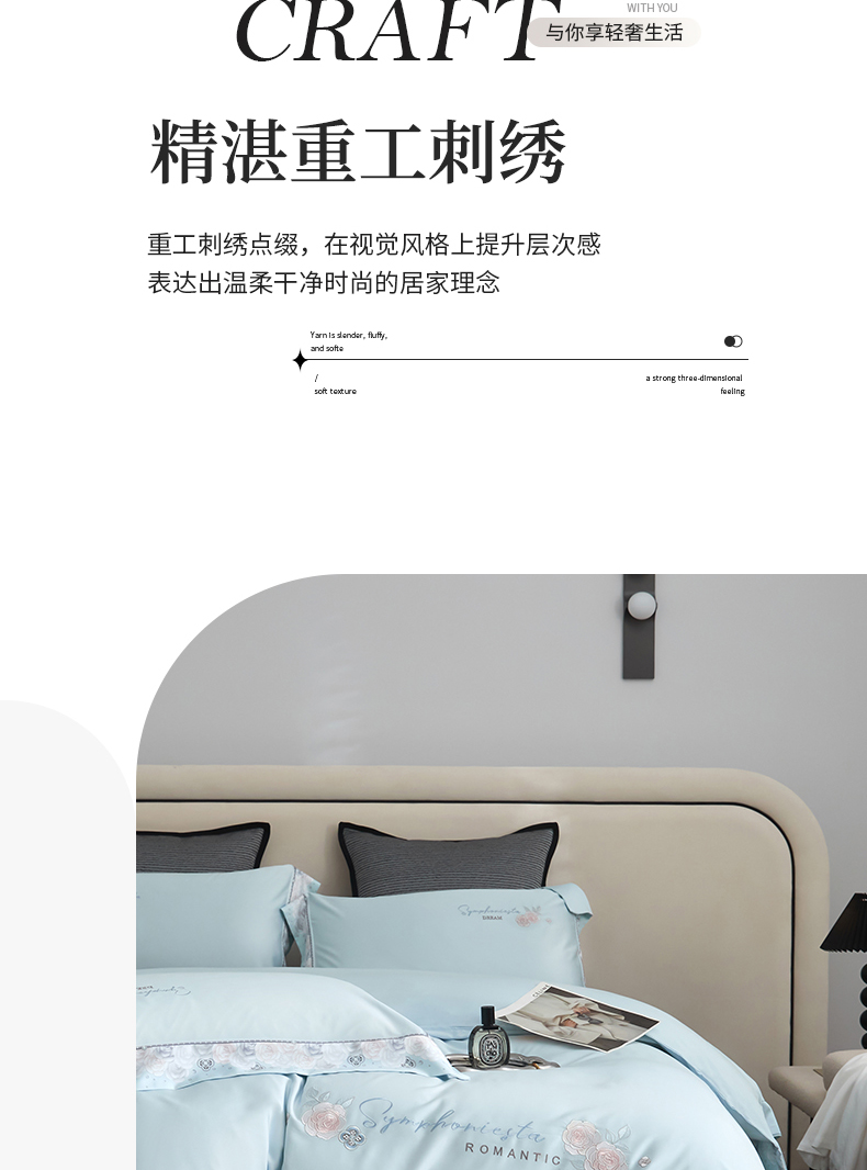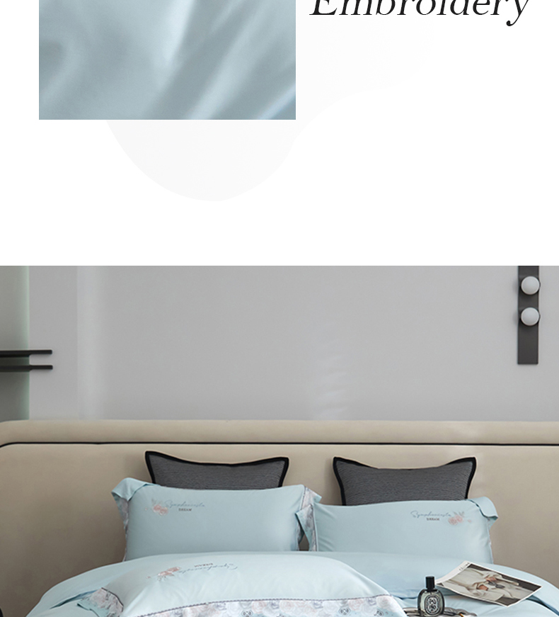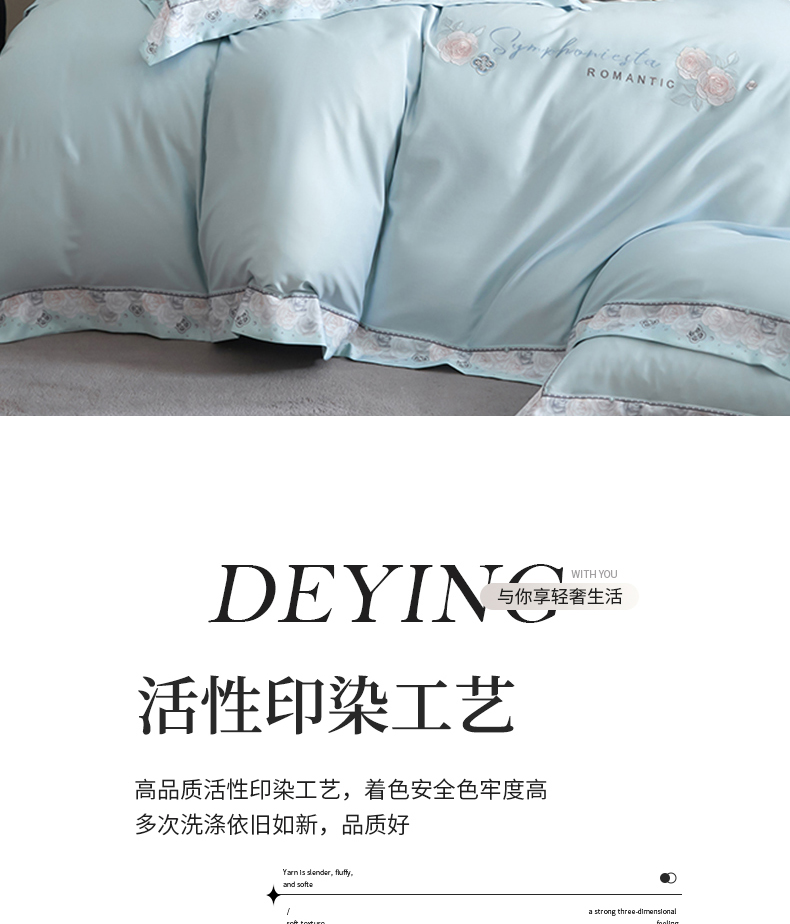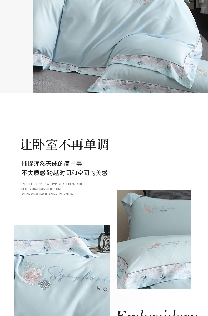 商品名称:浩情国际婚庆供货中心 2026新款160S春夏天丝棉高端刺绣系列四件套 玫瑰花香-天空蓝