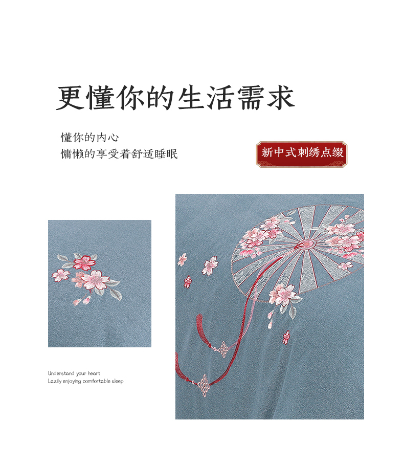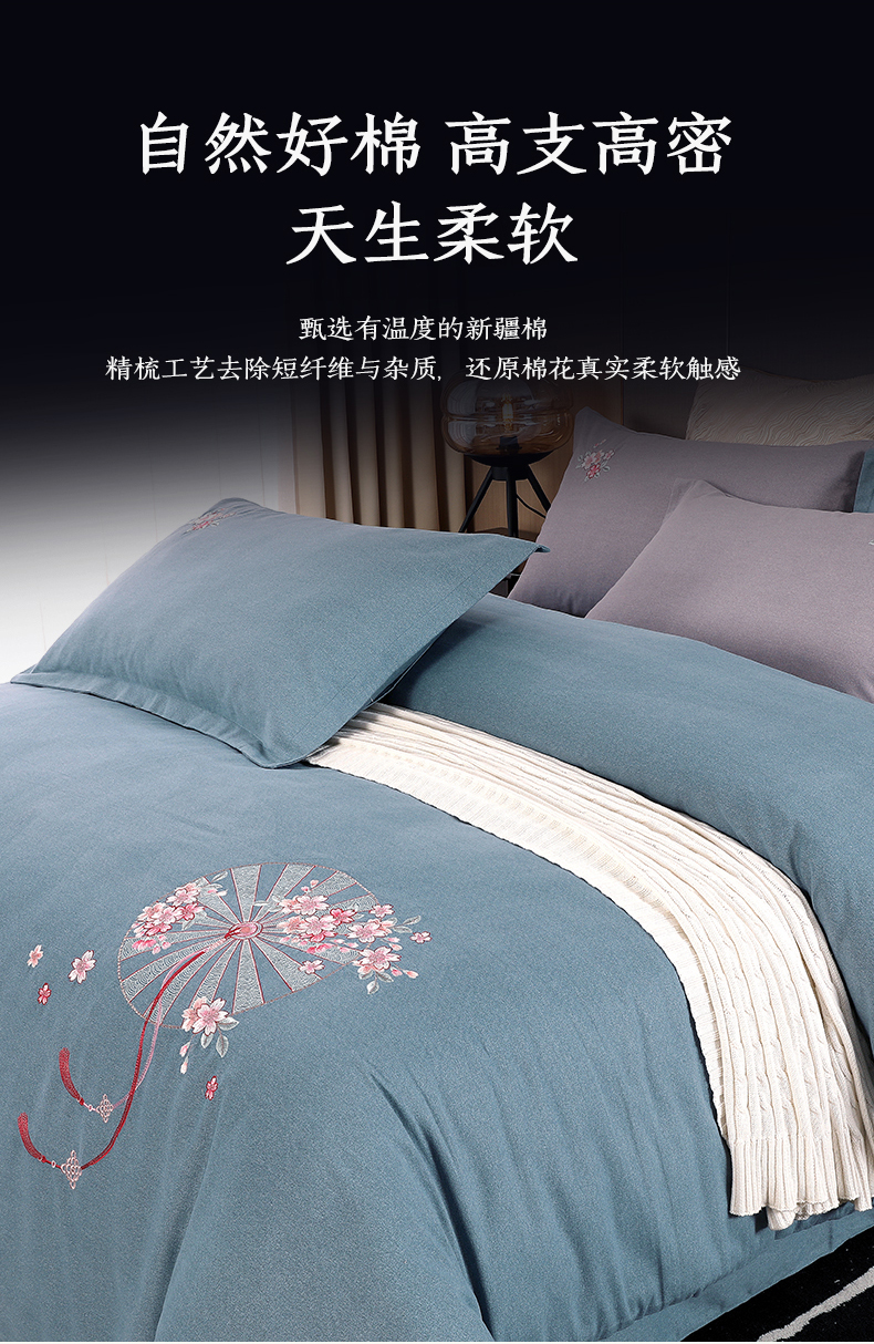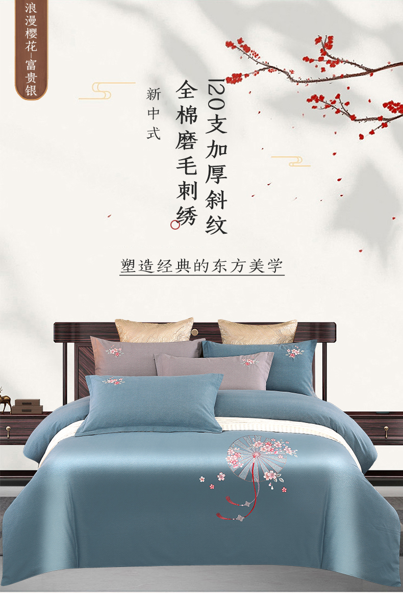 浩情国际婚庆供货中心 2026四季新品120S全棉斜纹加厚磨毛高端刺绣四件套 浪漫樱花-富贵银