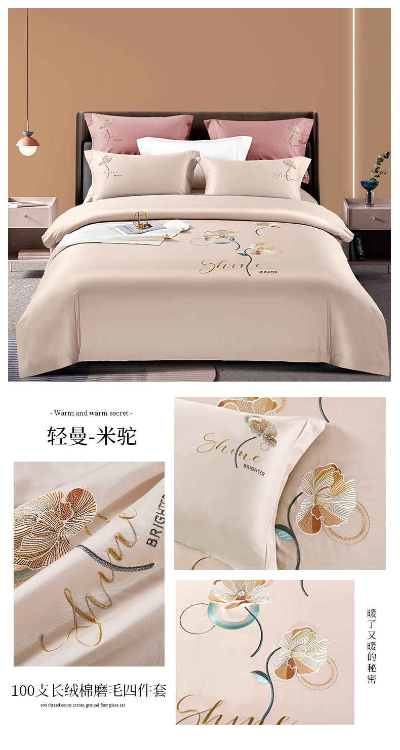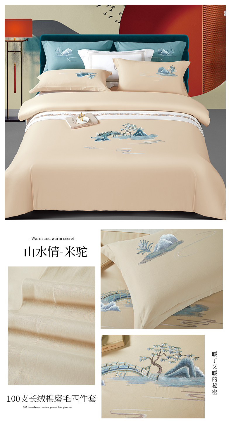 (总)浩情国际婚庆供货中心 2026新品-100支全棉长绒棉磨毛高端刺绣系列四件套,轻曼-豆沙,轻曼-湖兰,轻曼-米驼,轻曼-浅绿,轻曼-浅玉,轻曼-银灰,山水情-豆沙,山水情-粉玉,山水情-湖兰,山水情-米驼,山水情-浅灰,山水情-水兰