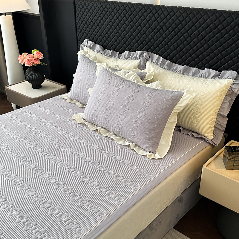 (总)紫碧螺家纺 2025新款牛奶绒绗绣裙式床盖三件套,暖黄,银灰,绿色,粉色,奶白,浅紫