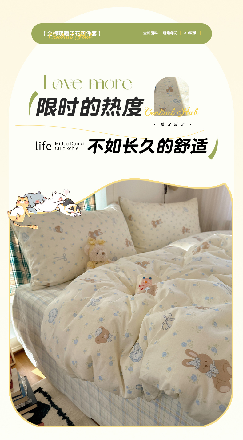 当前位置: 91家纺网 > 商品网购 > 床品套件 > 四件套 > 全棉普通四件套 > 瑞莱 2026春季新款全棉纯棉印花小清新萌趣系列四件套 蓝花兔