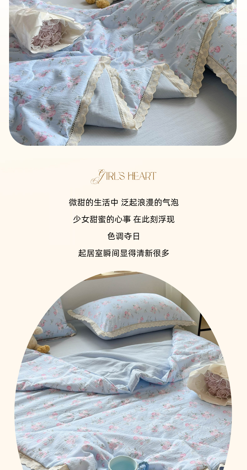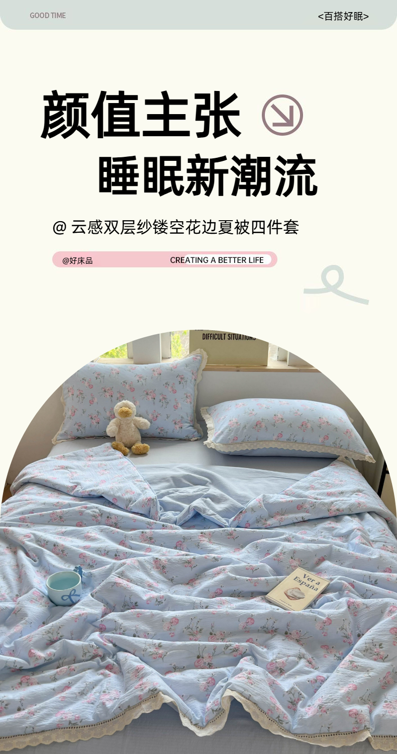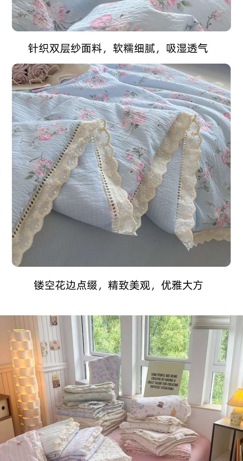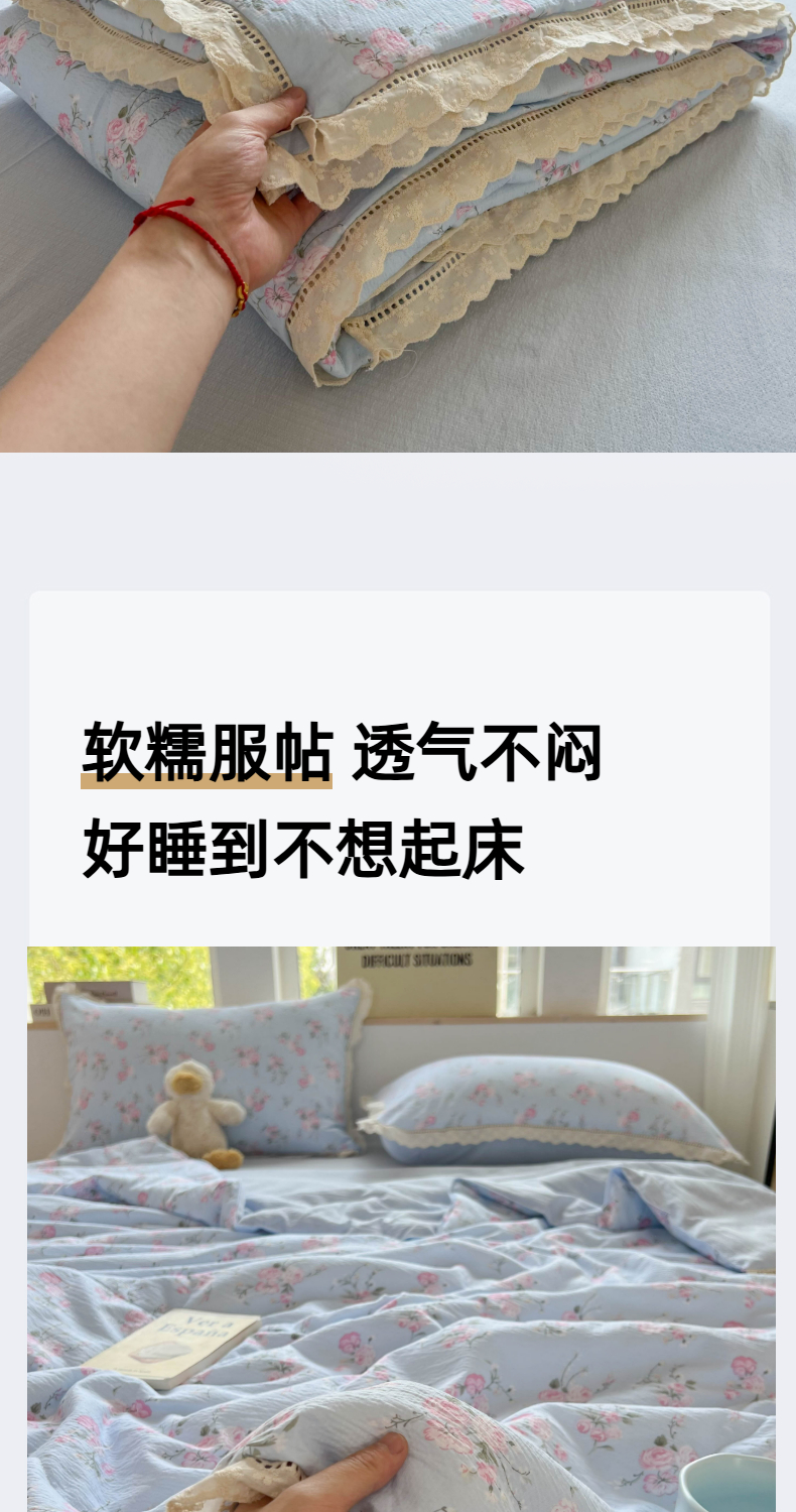 商品名称:温眠家纺 2025新款云感双层纱镂空花边夏被四件套 蓝溪