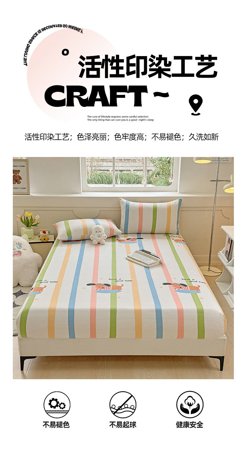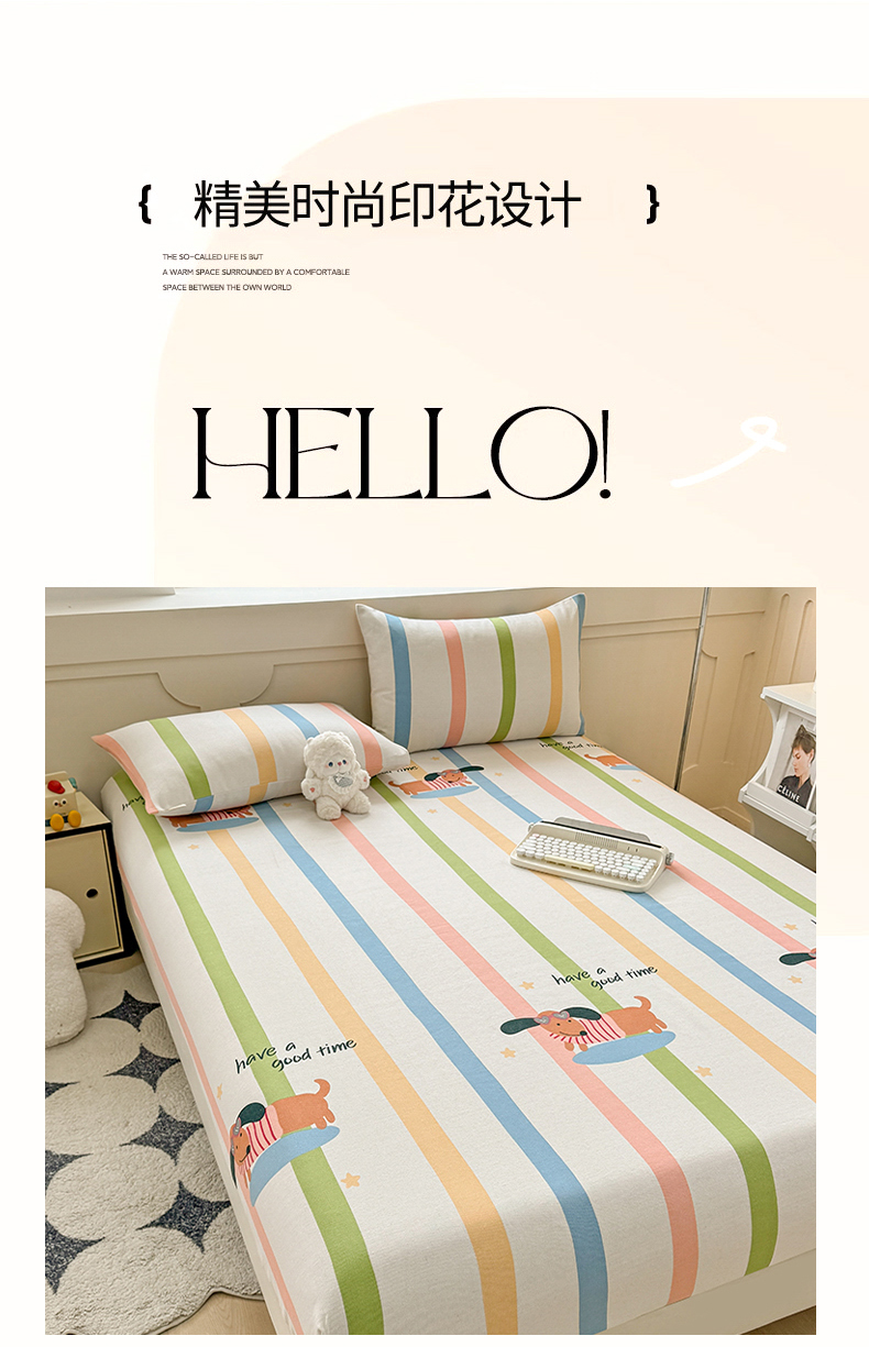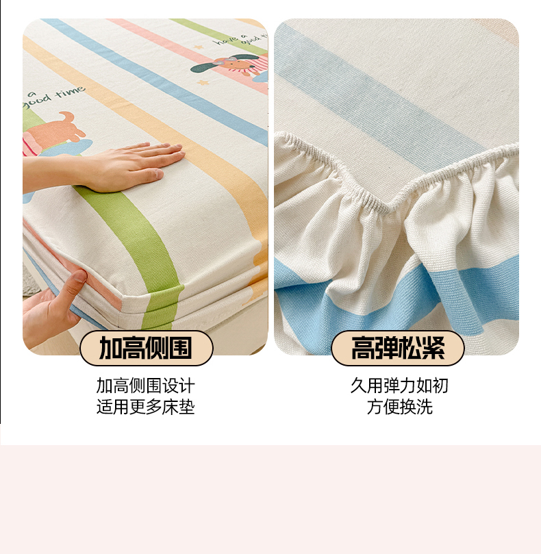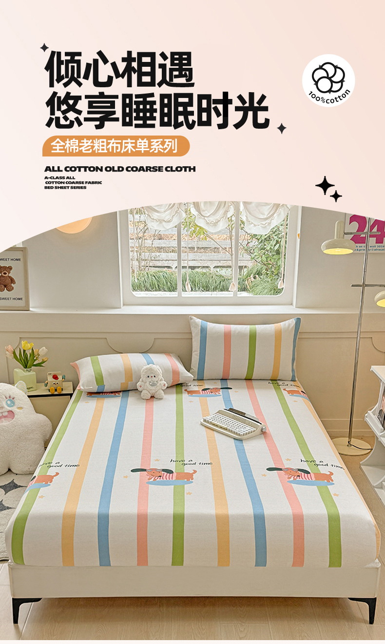 爱彼家纺 2026新款舒适透气老粗布凉席印花床笠单件-床笠三件套 老粗布床笠-彩虹小狗