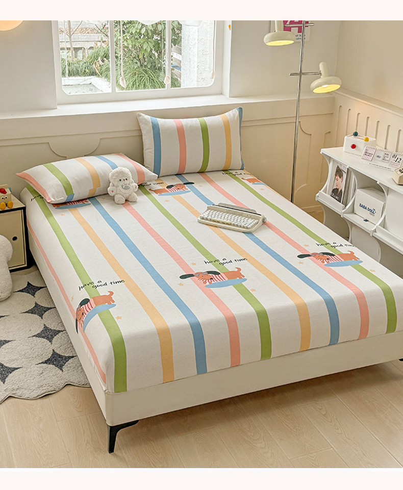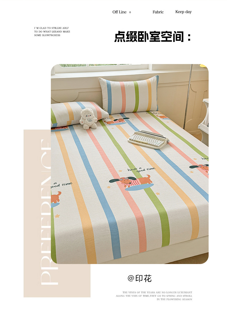 • 91家纺网 家纺一手货源 找家纺 爱彼家纺 2026新款舒适透气老粗布凉席印花床笠单件-床笠三件套 老粗布床笠-彩虹小狗