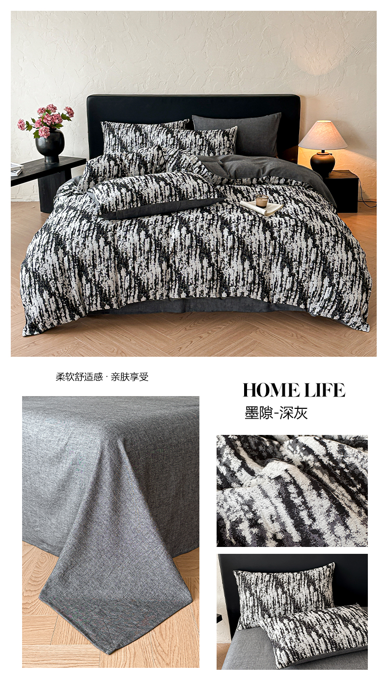 莱茵家居 2026新款A类60支全棉纯棉复古侘寂风色织提花四件套-墨隙系列 斑斓-深灰