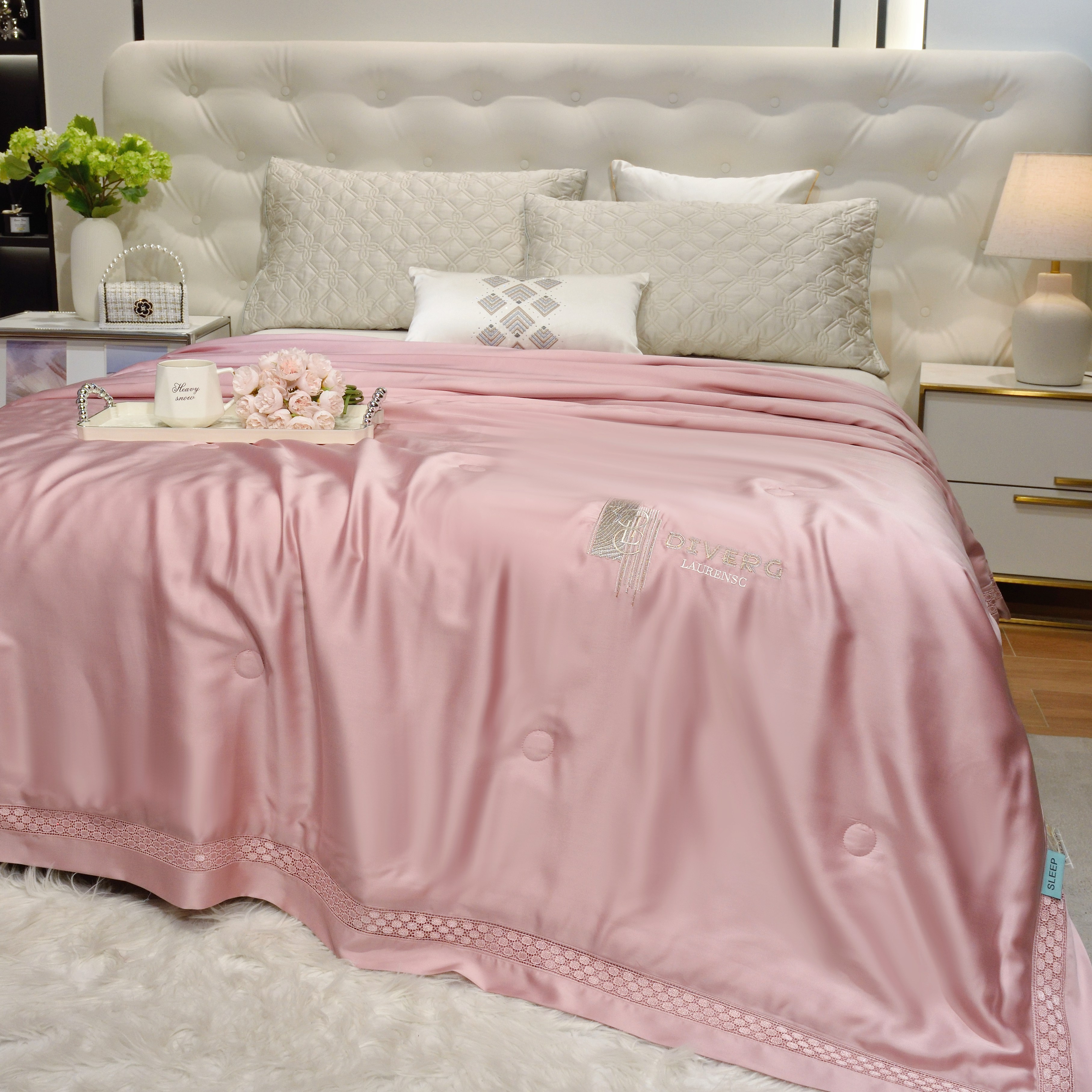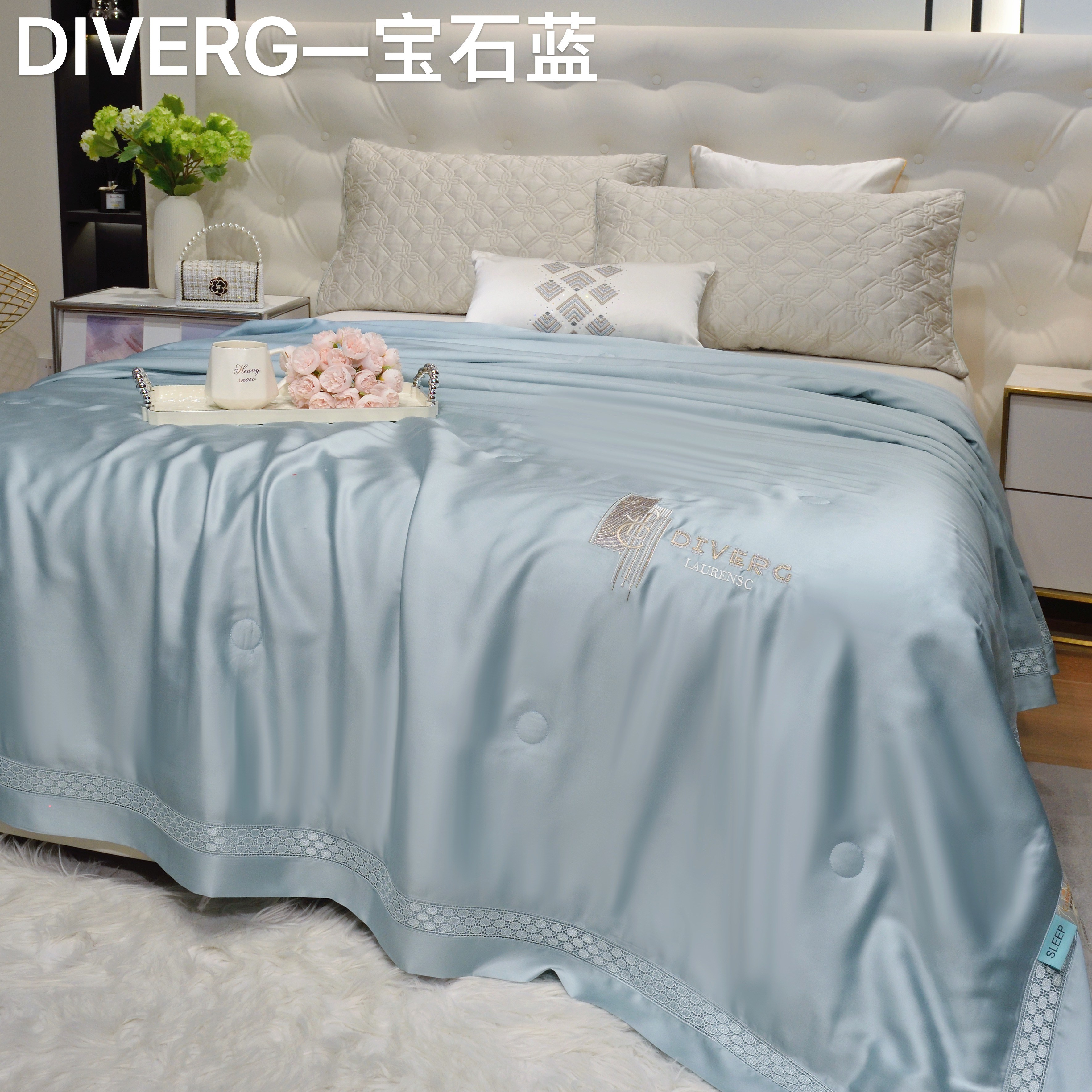 (总)博尔菲 2026新款半镂空蕾丝宽边绗缝夏被夏凉被空调被,宝石蓝,豆沙,高级灰,香槟金