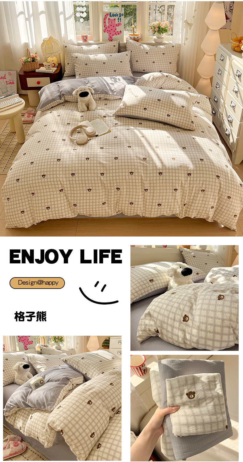 当前位置: 91家纺网 > 商品网购 > 床品套件 > 四件套 > 双层纱四件套 > 水木坊 2026春夏新款云感双层纱可爱系列四件套格子熊