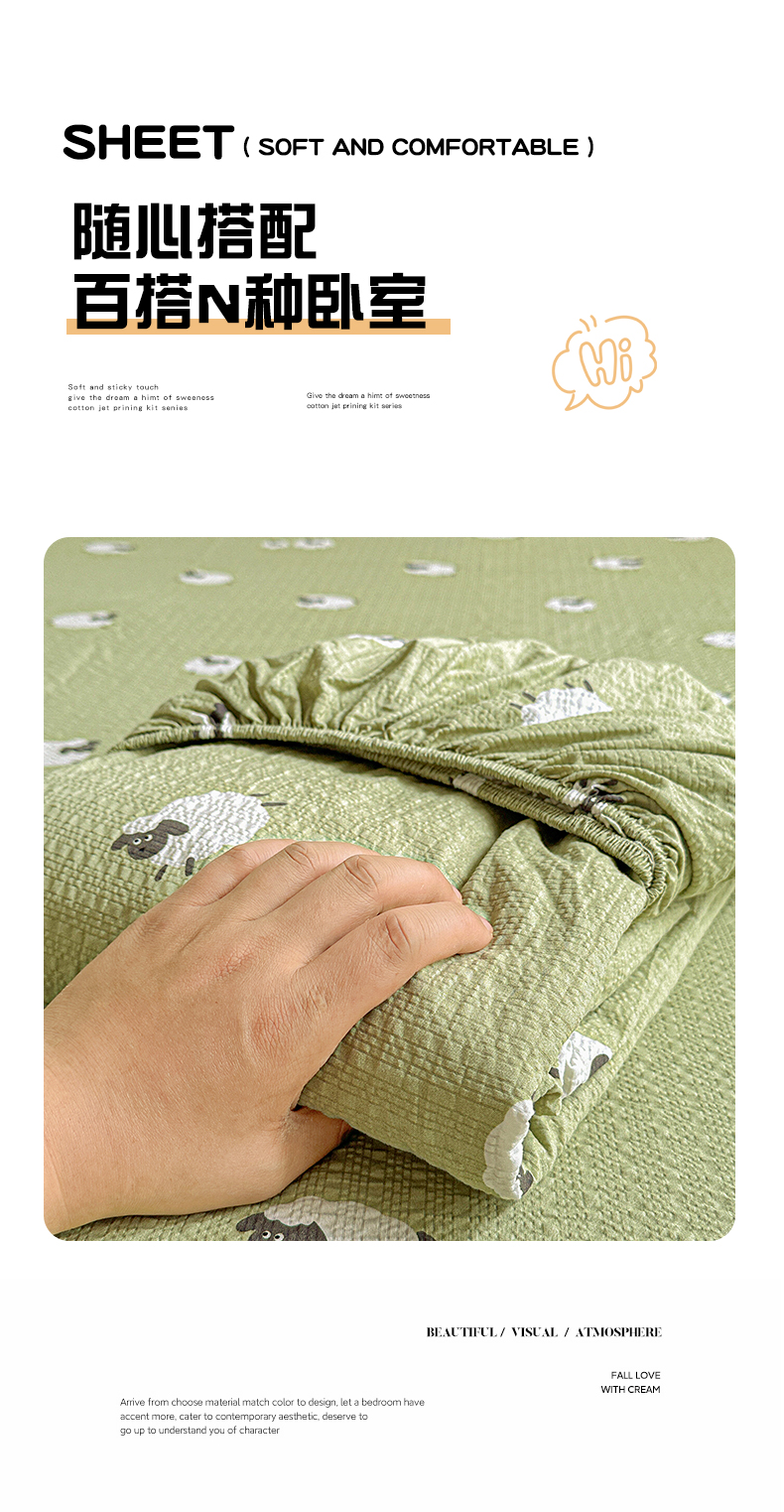 • 91家纺网 家纺一手货源 找家纺 悦织湾家纺 2026新款老粗布印花床单床笠床笠三两件套春秋学生宿舍单双人床笠 羊羊牧场