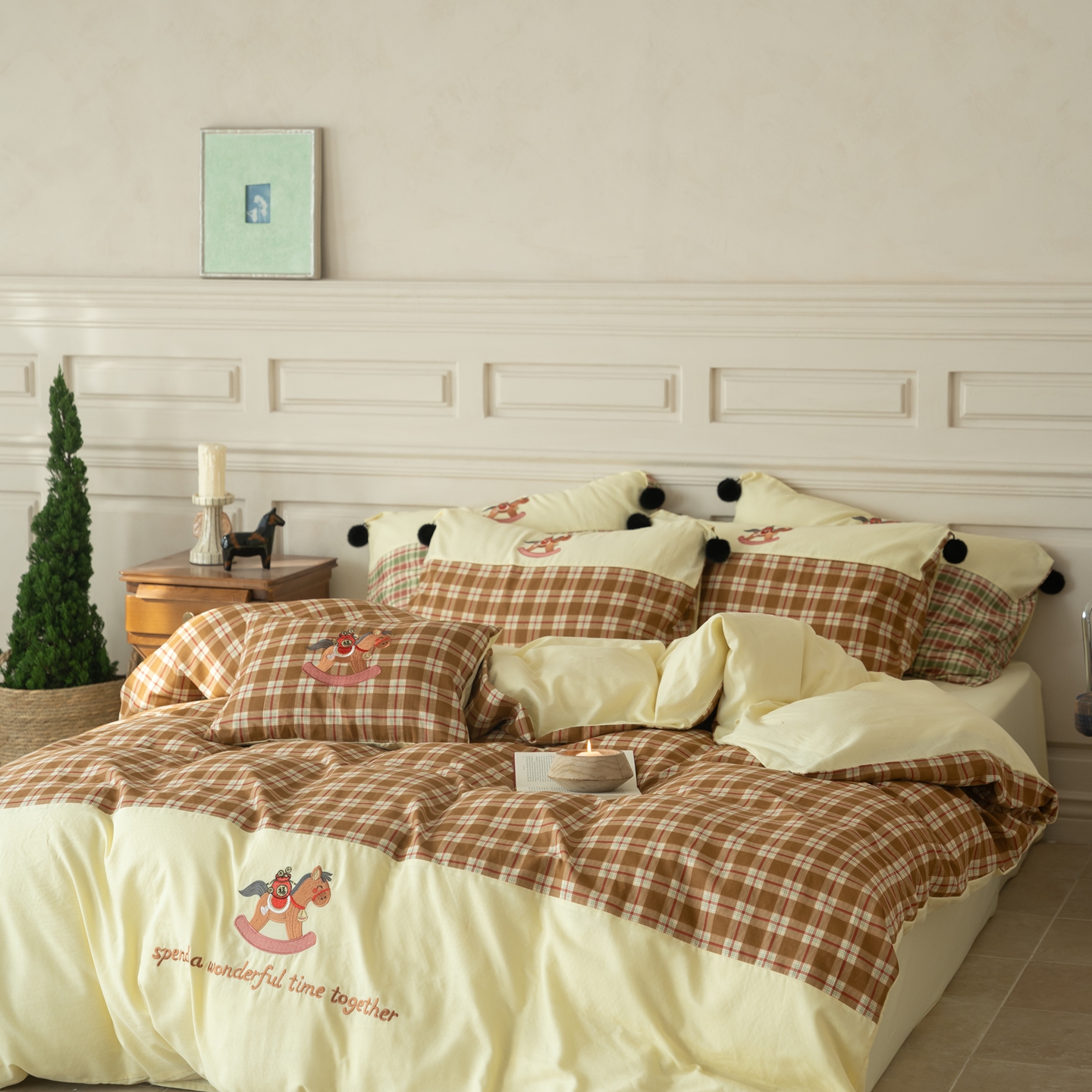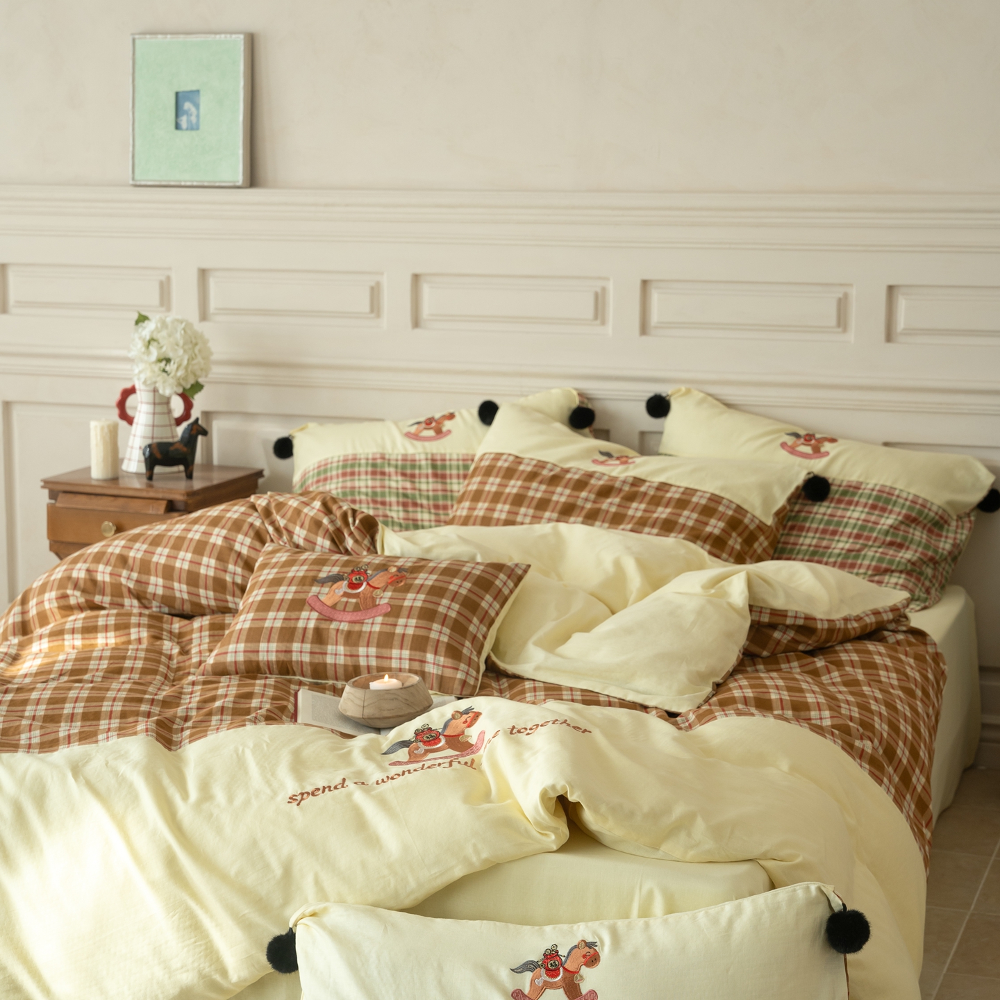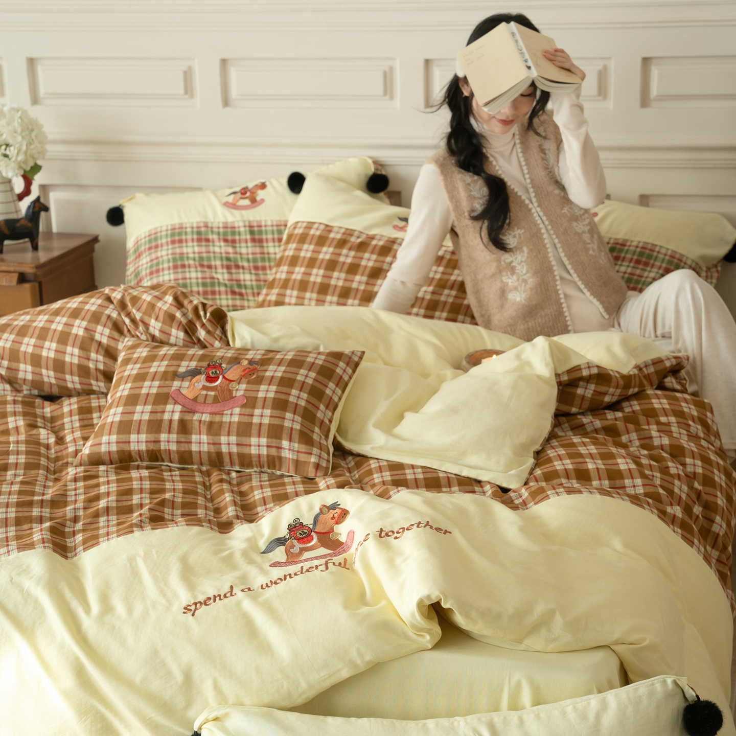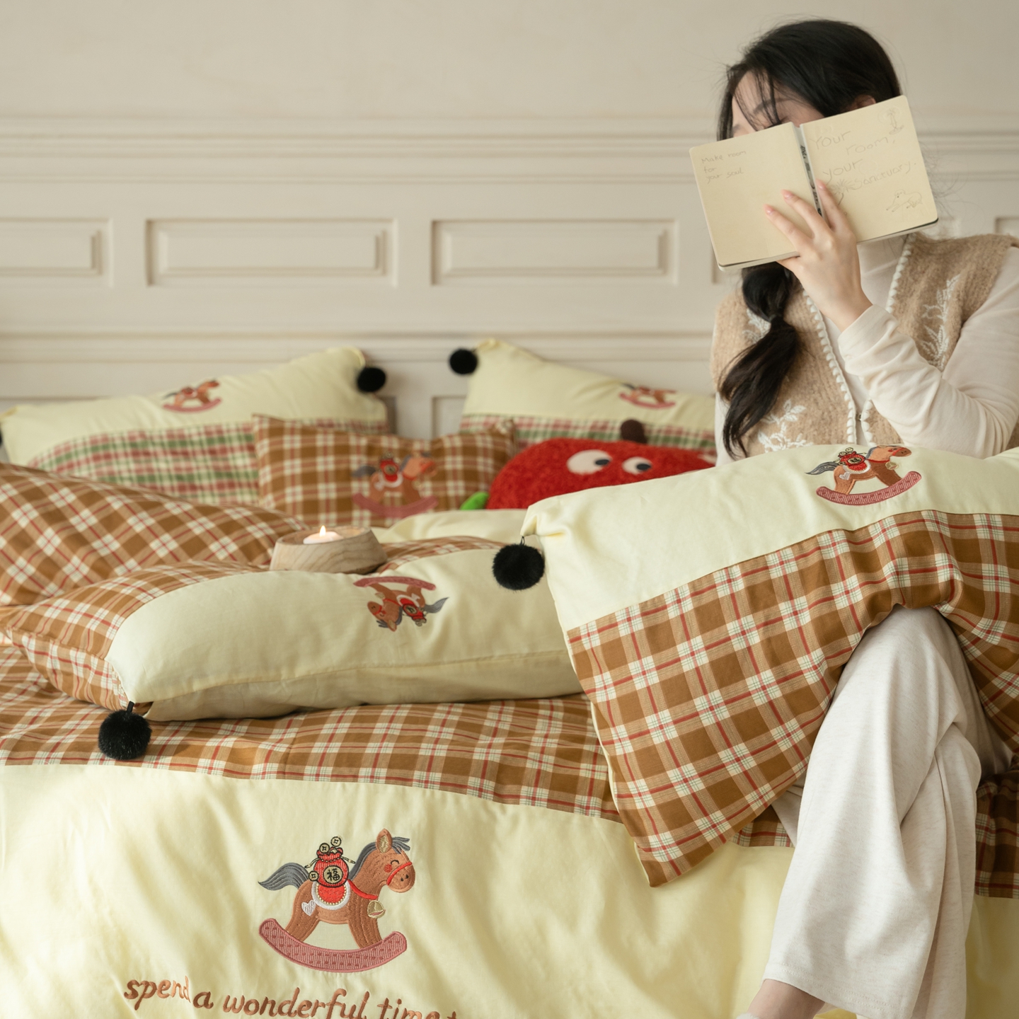 (总)优然居家纺 2026新款全棉双层纱刺绣四件套-马上有钱(控价260/328/348),马上有钱-黑格,马上有钱-黄格,马上有钱-绿格
