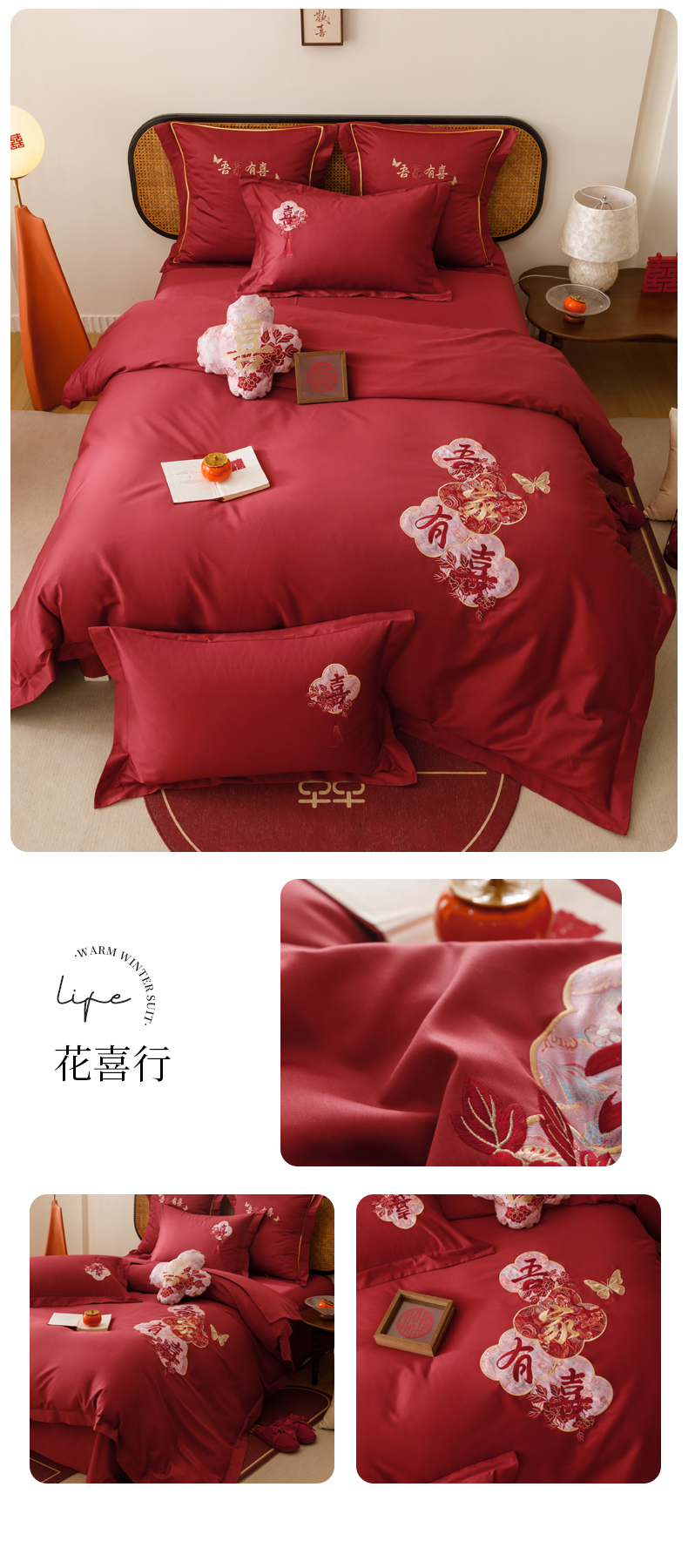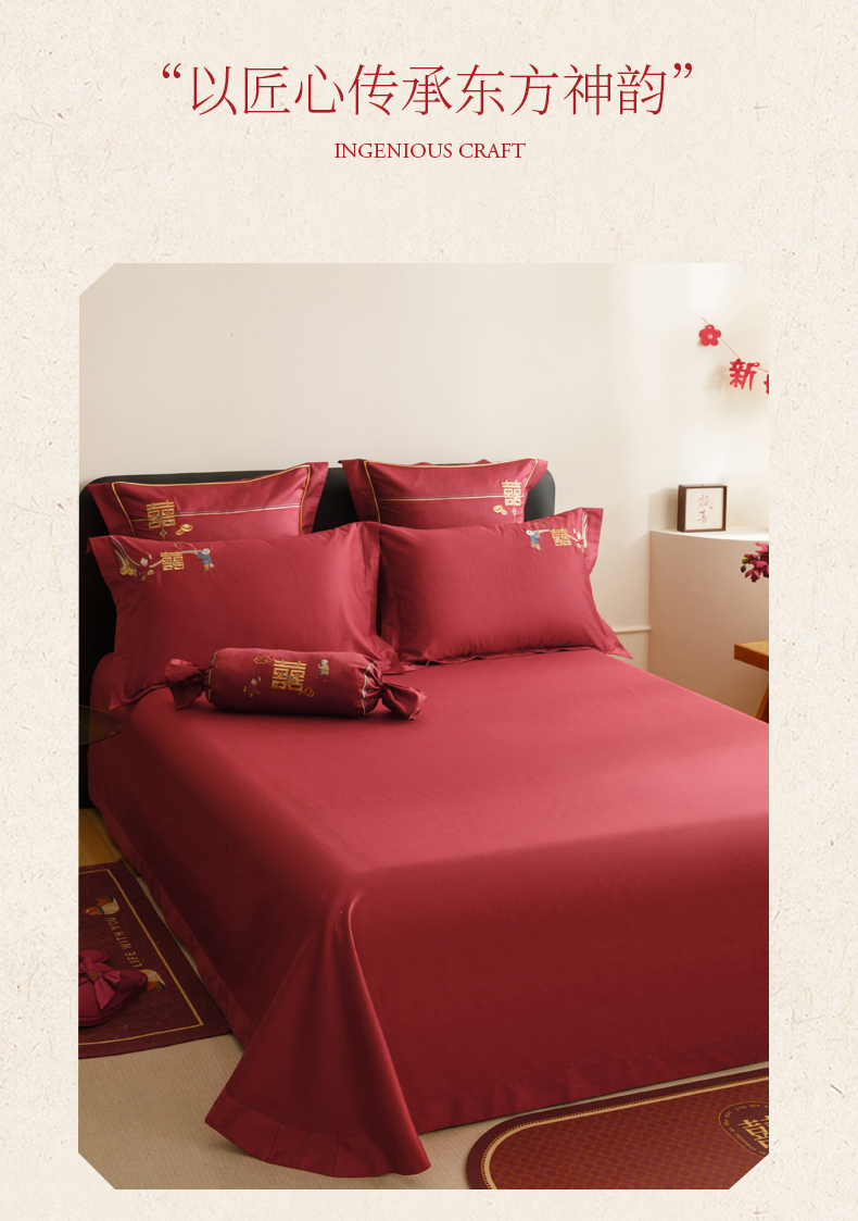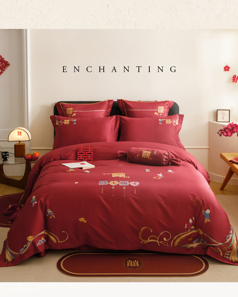 当前位置: 91家纺网 > 商品网购 > 床品套件 > 四件套 > 婚庆四件套 > 慕晨 2026新款50支澳棉全棉纯棉贡缎婚庆绣花贴布绣四件套热款 花喜行