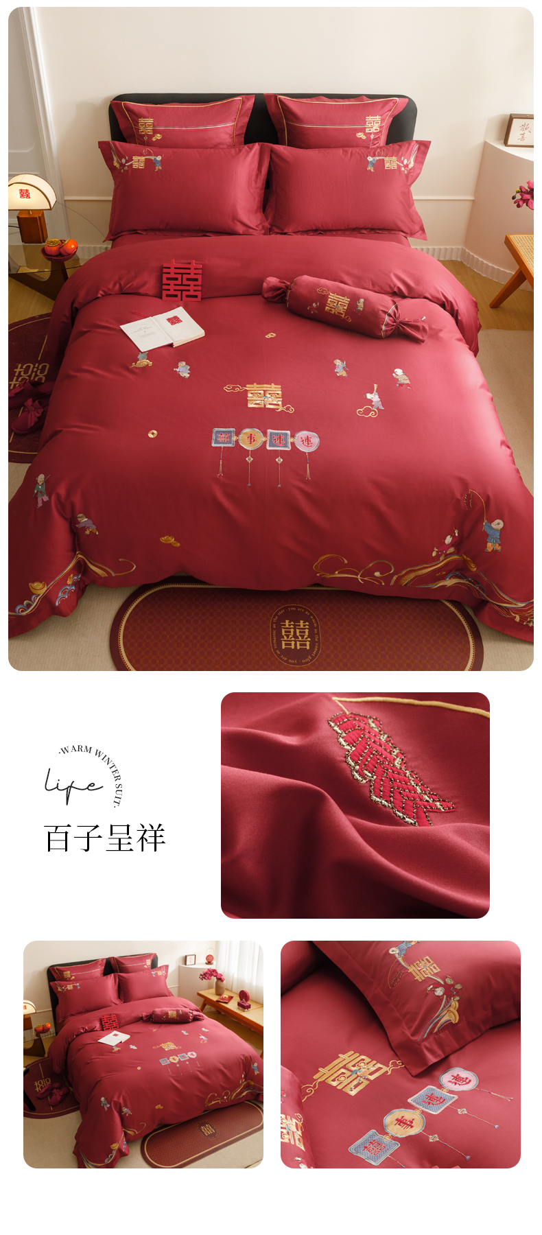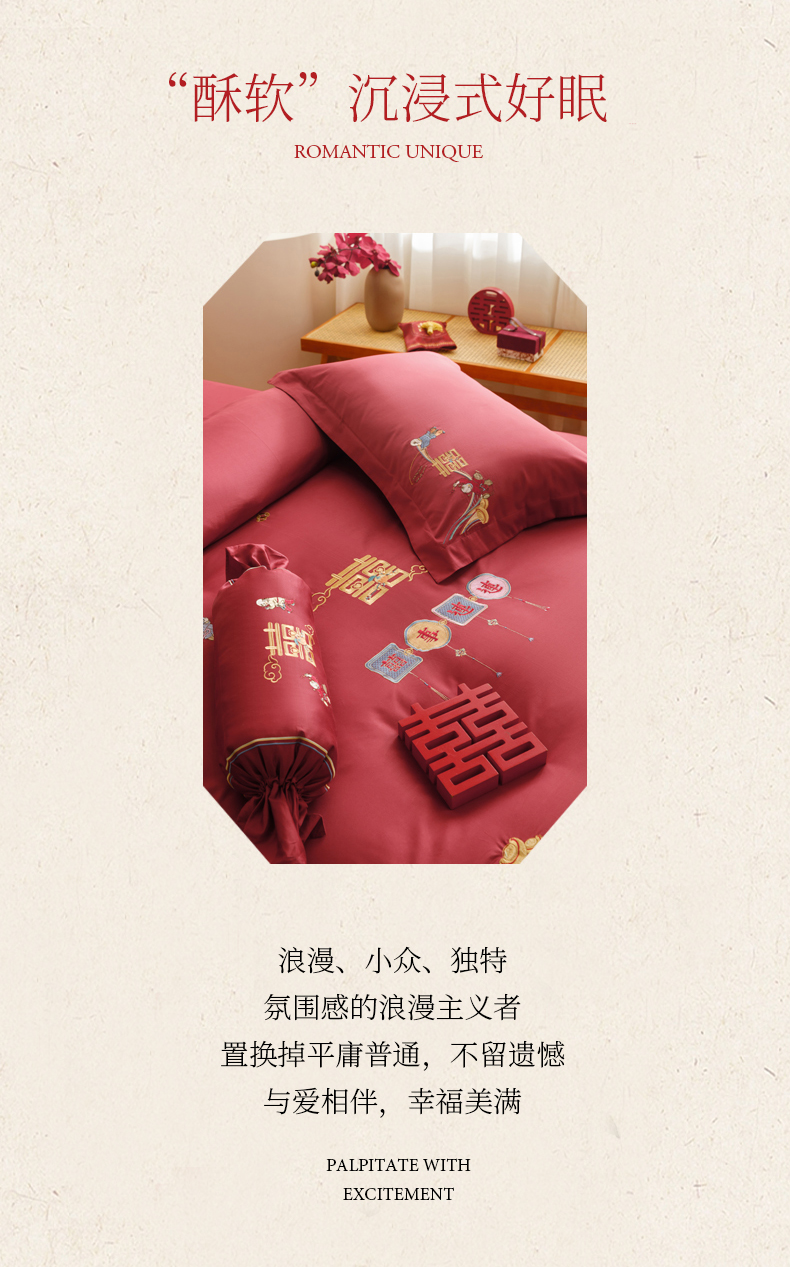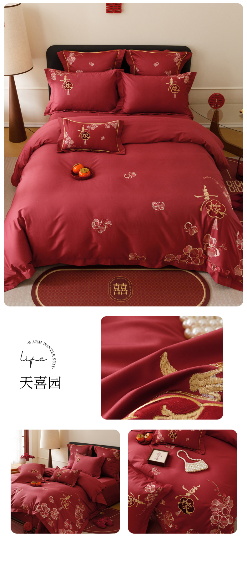 当前位置: 91家纺网 > 商品网购 > 床品套件 > 四件套 > 婚庆四件套 > 慕晨 2026新款50支澳棉全棉纯棉贡缎婚庆绣花贴布绣四件套热款 花喜行