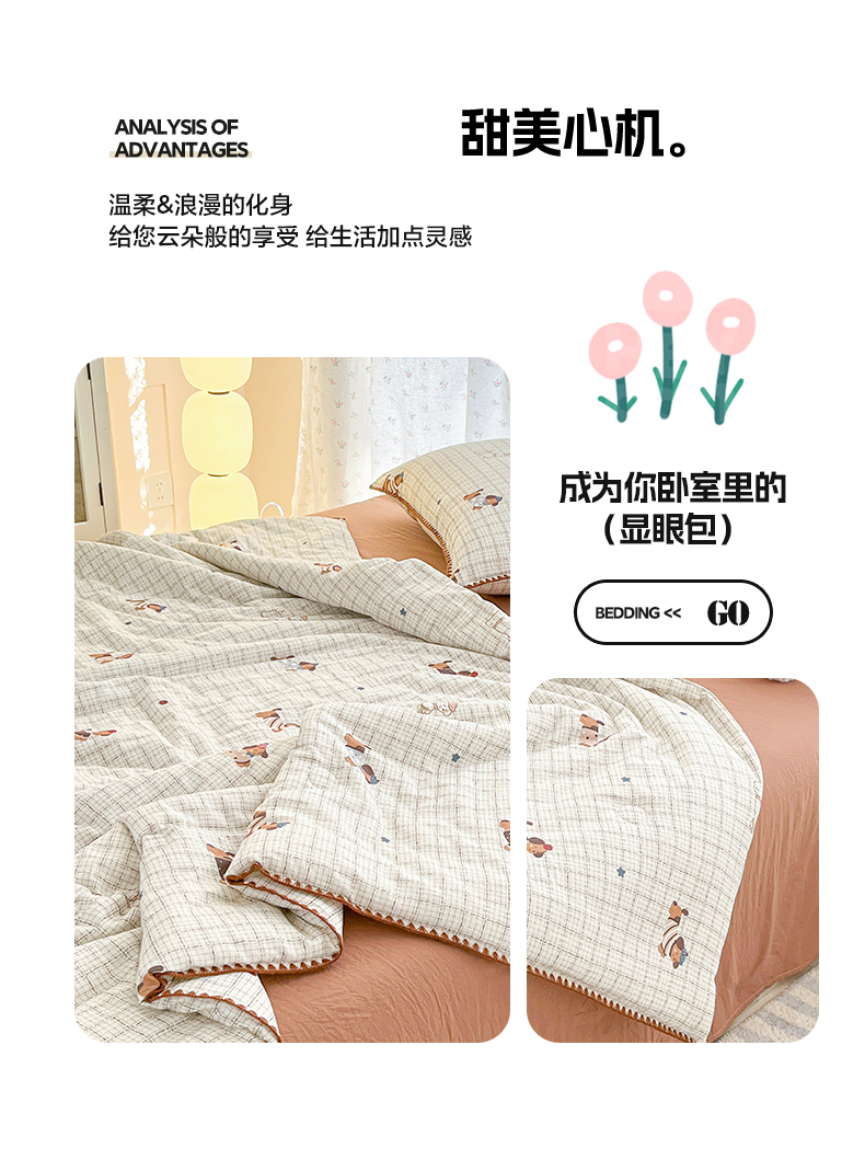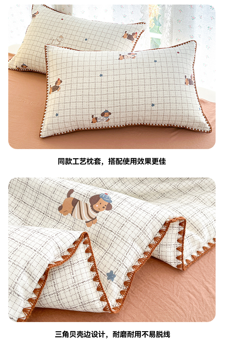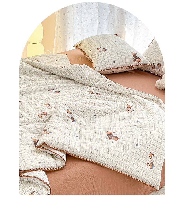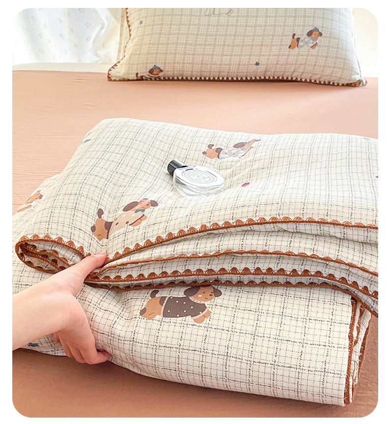 • 91家纺网 家纺一手货源 找家纺 盛秋家纺 2026新款三角针水洗棉贝壳边印花夏被系列 格子小狗+太妃糖