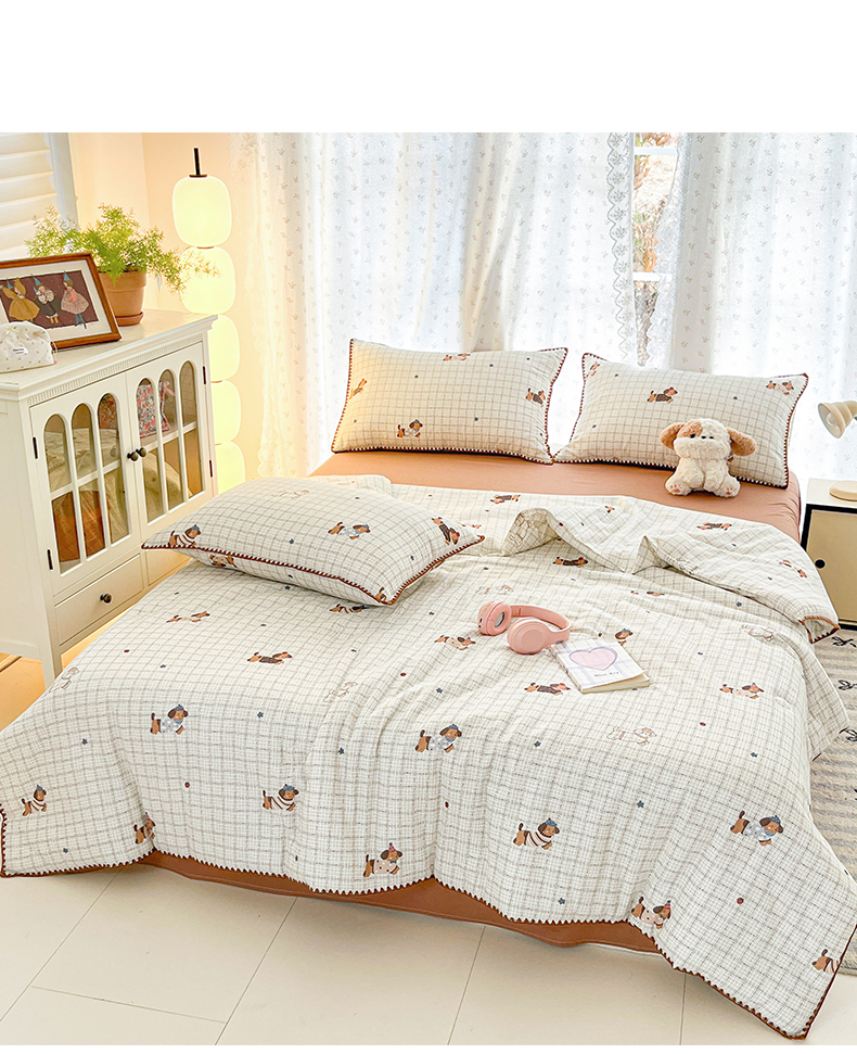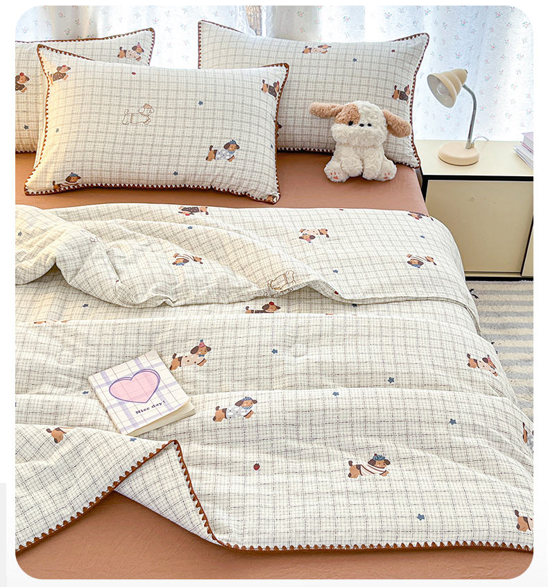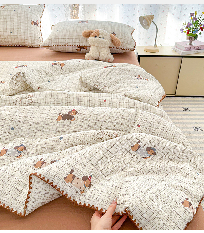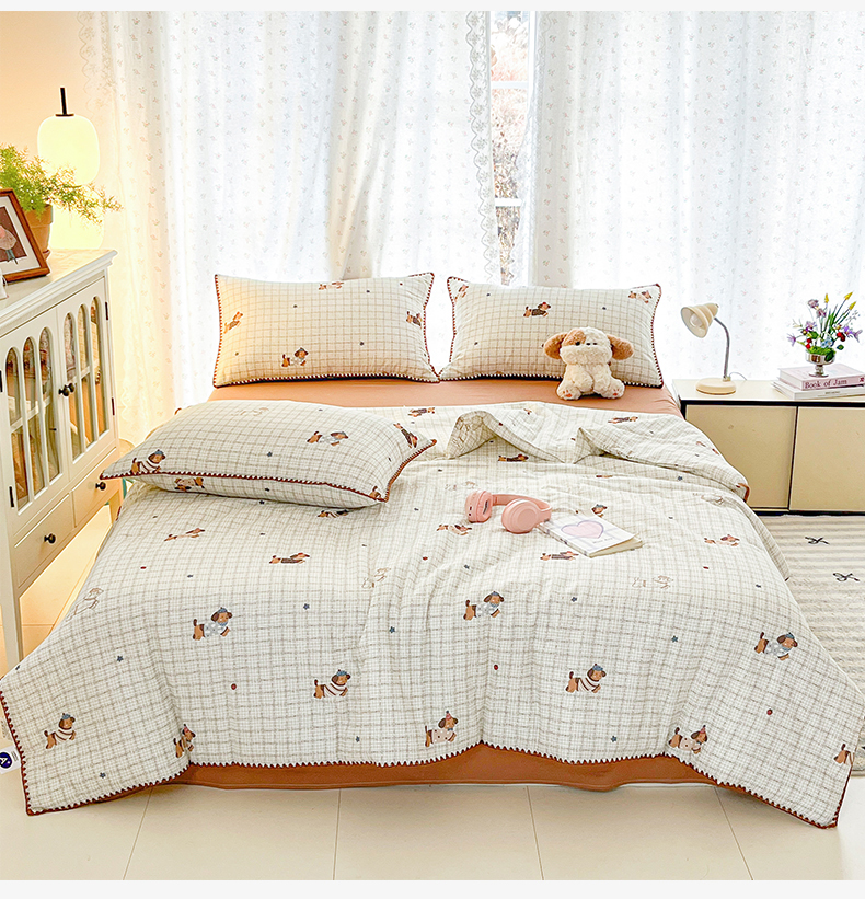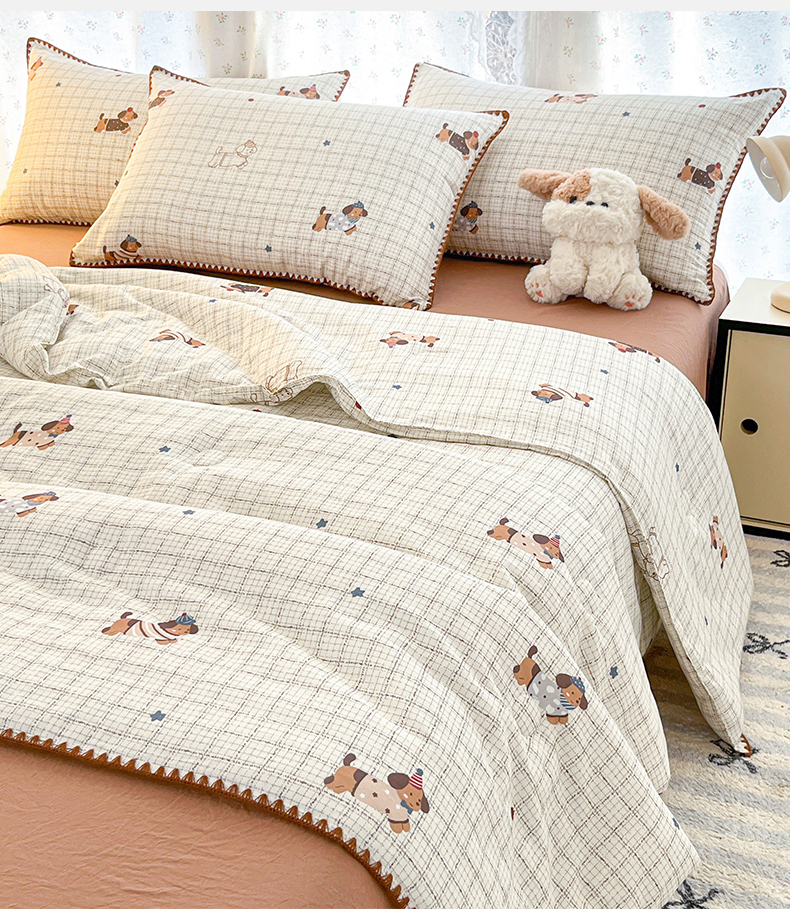 盛秋家纺 2026新款三角针水洗棉贝壳边印花夏被系列 格子小狗+太妃糖