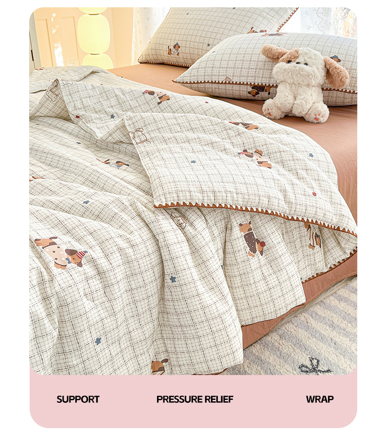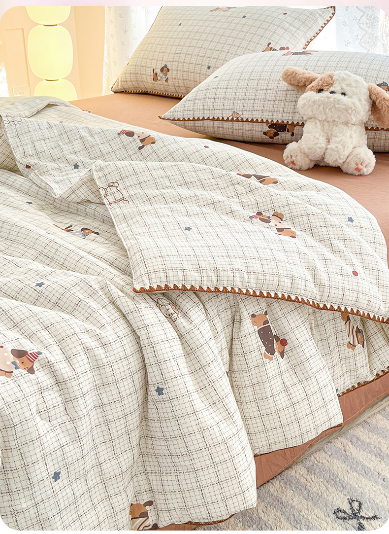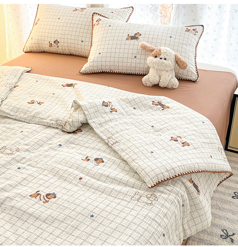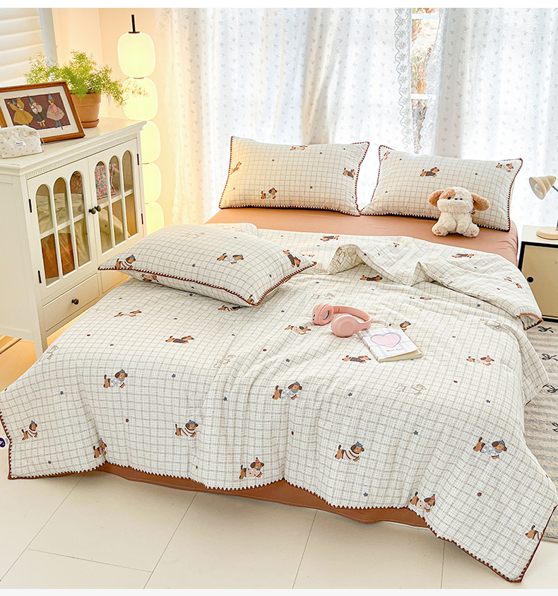 盛秋家纺 2026新款三角针水洗棉贝壳边印花夏被系列 格子小狗+太妃糖