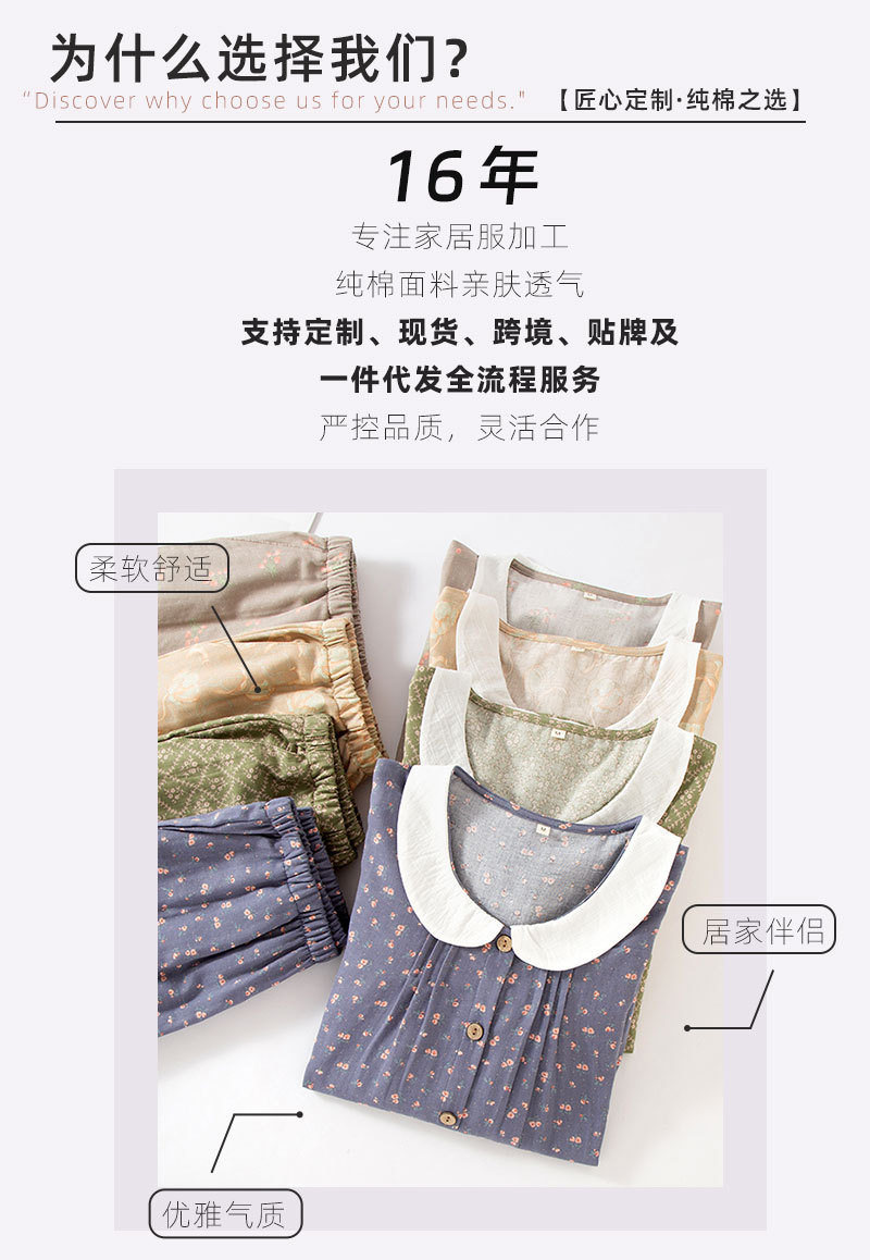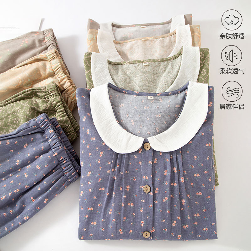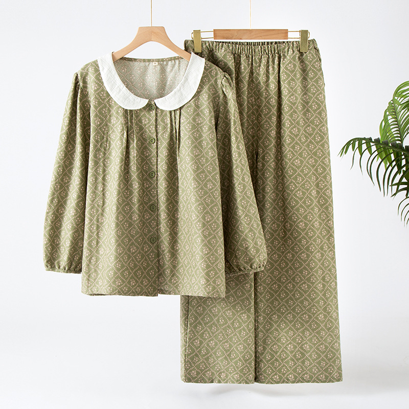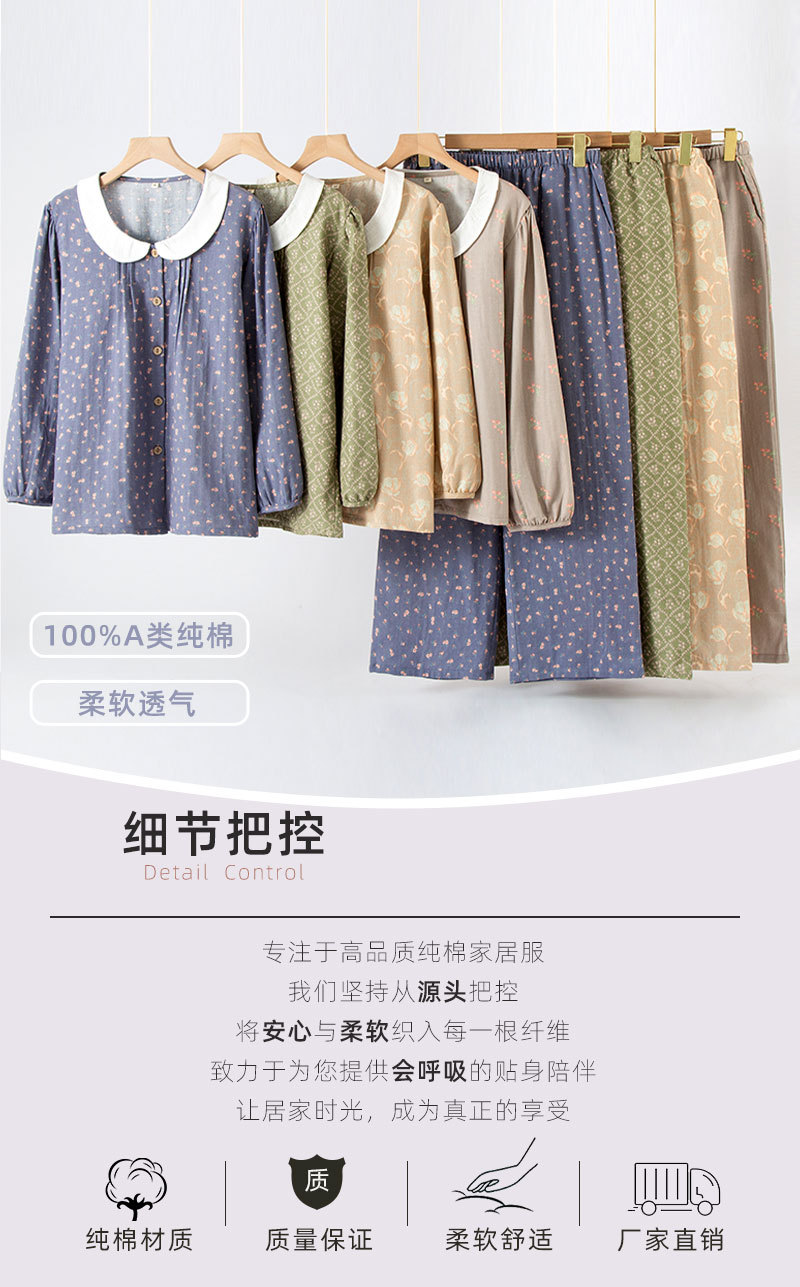 (总)洛兰沙家居馆 日式纯棉情侣睡衣春秋夏季无印风男女纱布长袖长裤家居服套装,女款粉格,女款绿格,男款咖格