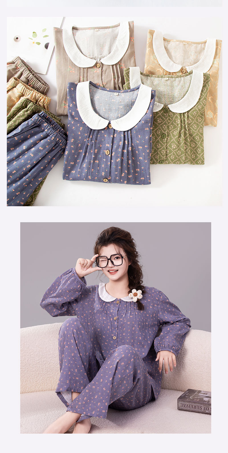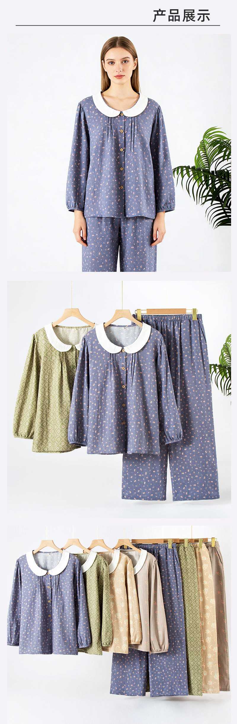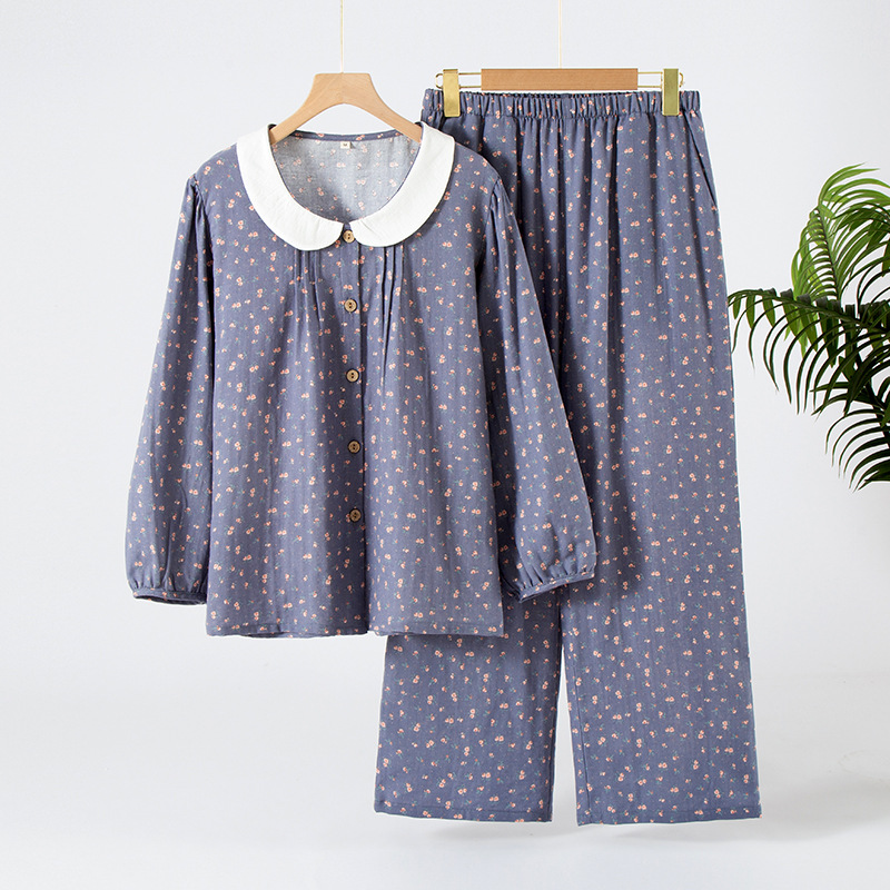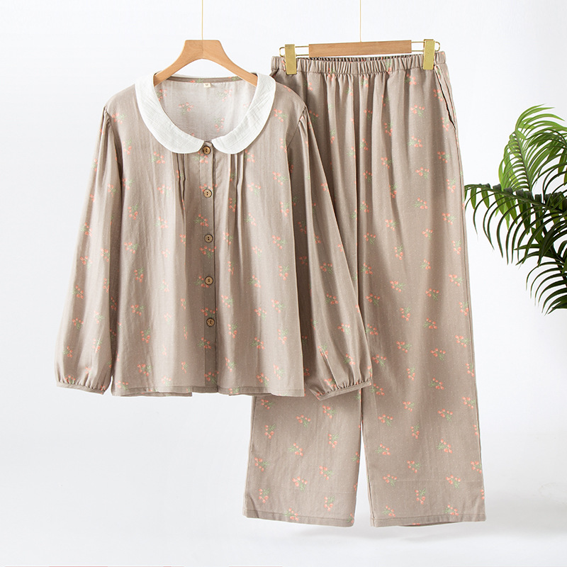 (总)洛兰沙家居馆 日式纯棉情侣睡衣春秋夏季无印风男女纱布长袖长裤家居服套装,女款粉格,女款绿格,男款咖格