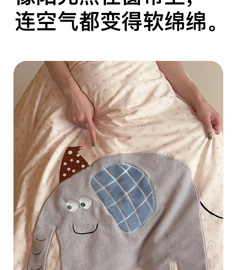 (总)卡姿家纺 2026春夏全棉萌趣气质大贴布系列四件套— 第一季,大鹅,卡皮巴拉,小粉象-卡其格,小粉象-蓝格