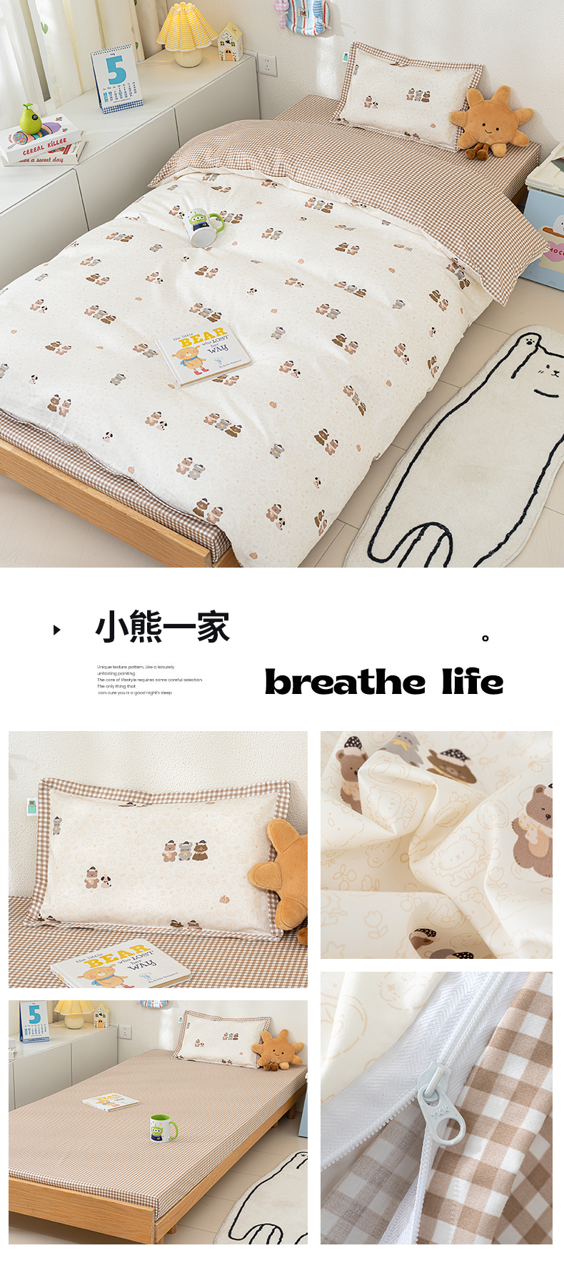 (总)良佐生活 2026新款A类铂金精梳全棉学生三件套,初遇-灰,贝里斯,云川,柚子小西,溪言-兰,格纹萌熊,溪言-粉,青格萌喵,莉亚,初遇-绿