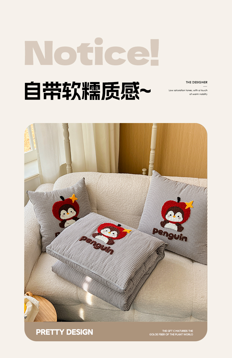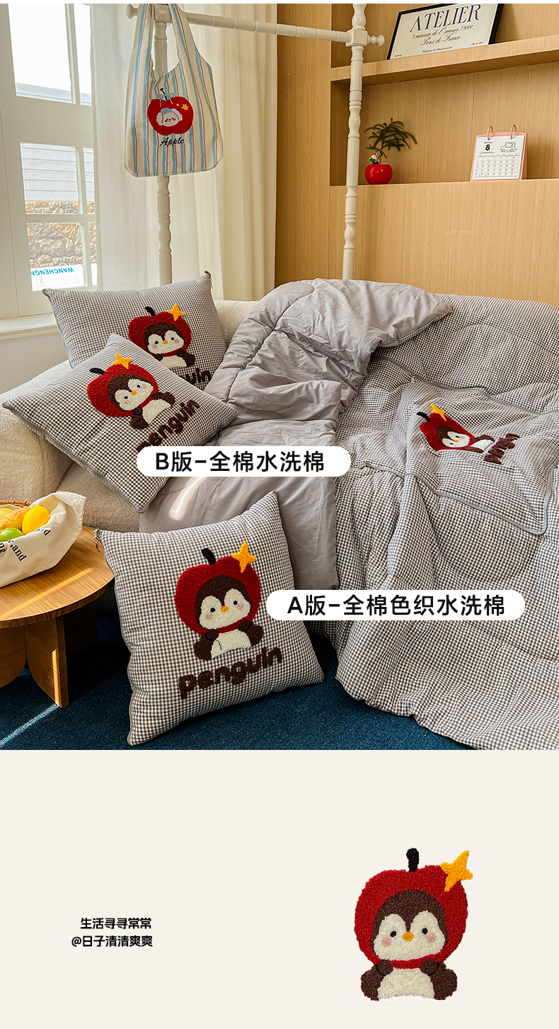 商品名称:番茄+ 2026春夏新款色织全棉纯棉水洗棉毛巾绣抱枕被 苹果企鹅-黑格
