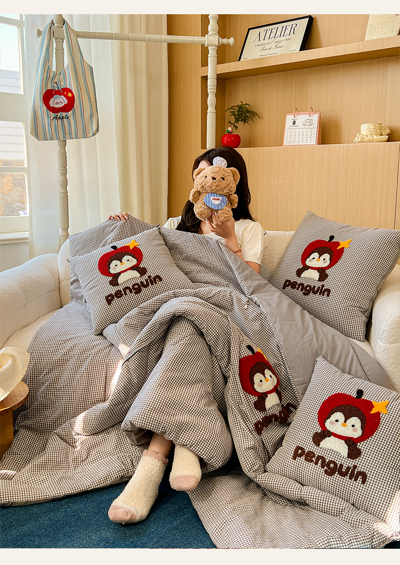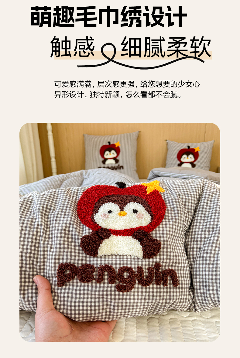 番茄+ 2026春夏新款色织全棉纯棉水洗棉毛巾绣抱枕被 苹果企鹅-黑格