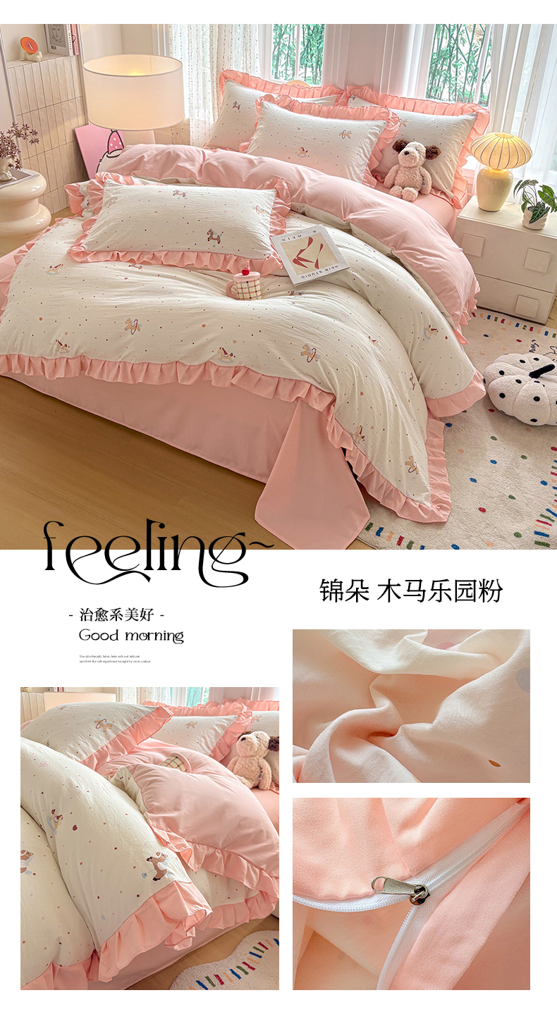 当前位置: 91家纺网 > 商品网购 > 床品套件 > 四件套 > 其它四件套 > 铠畅 2026春夏新款锦朵系列 韩版水洗棉小清新古棉床单床笠四件套 锦朵 木马乐园粉