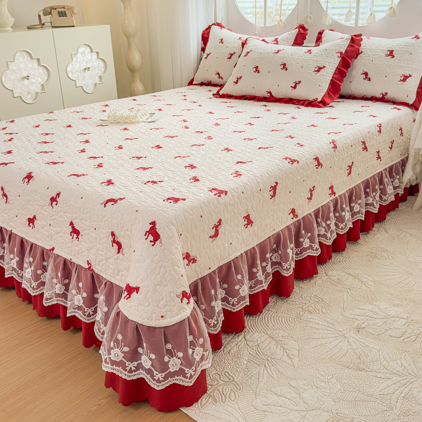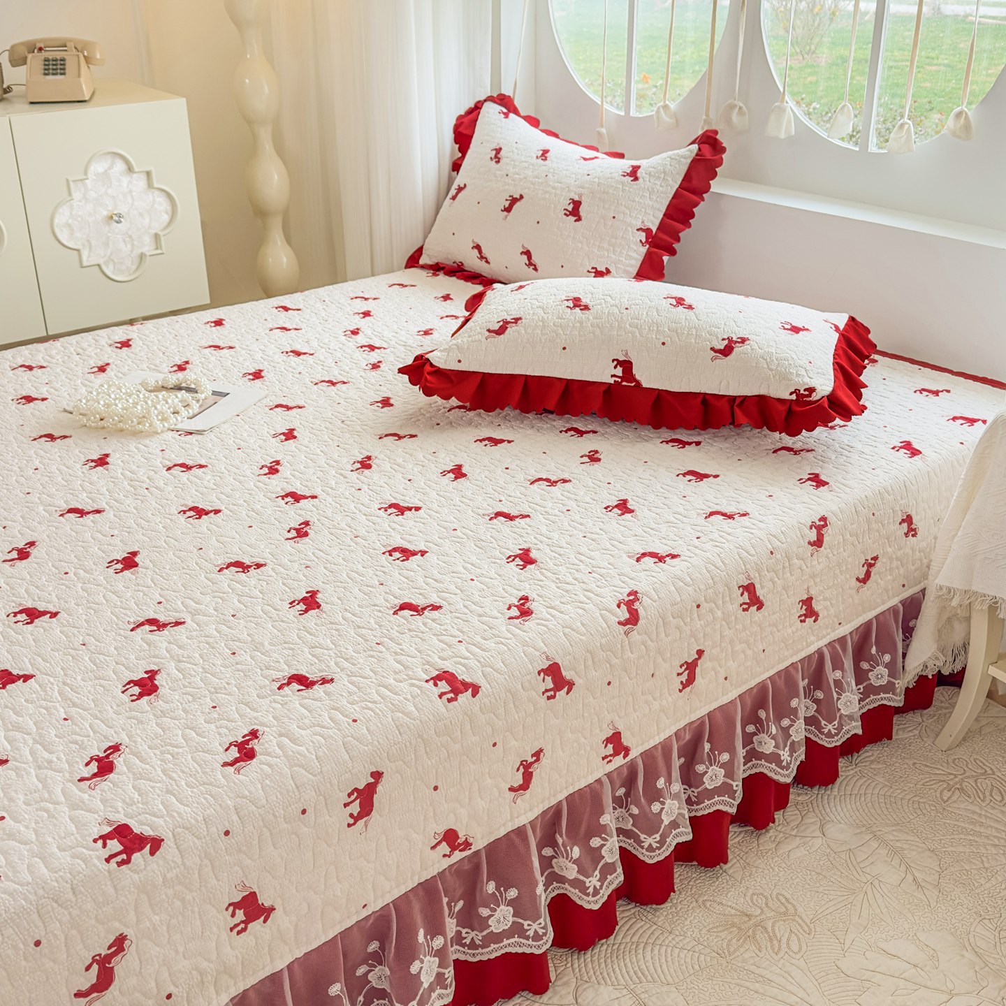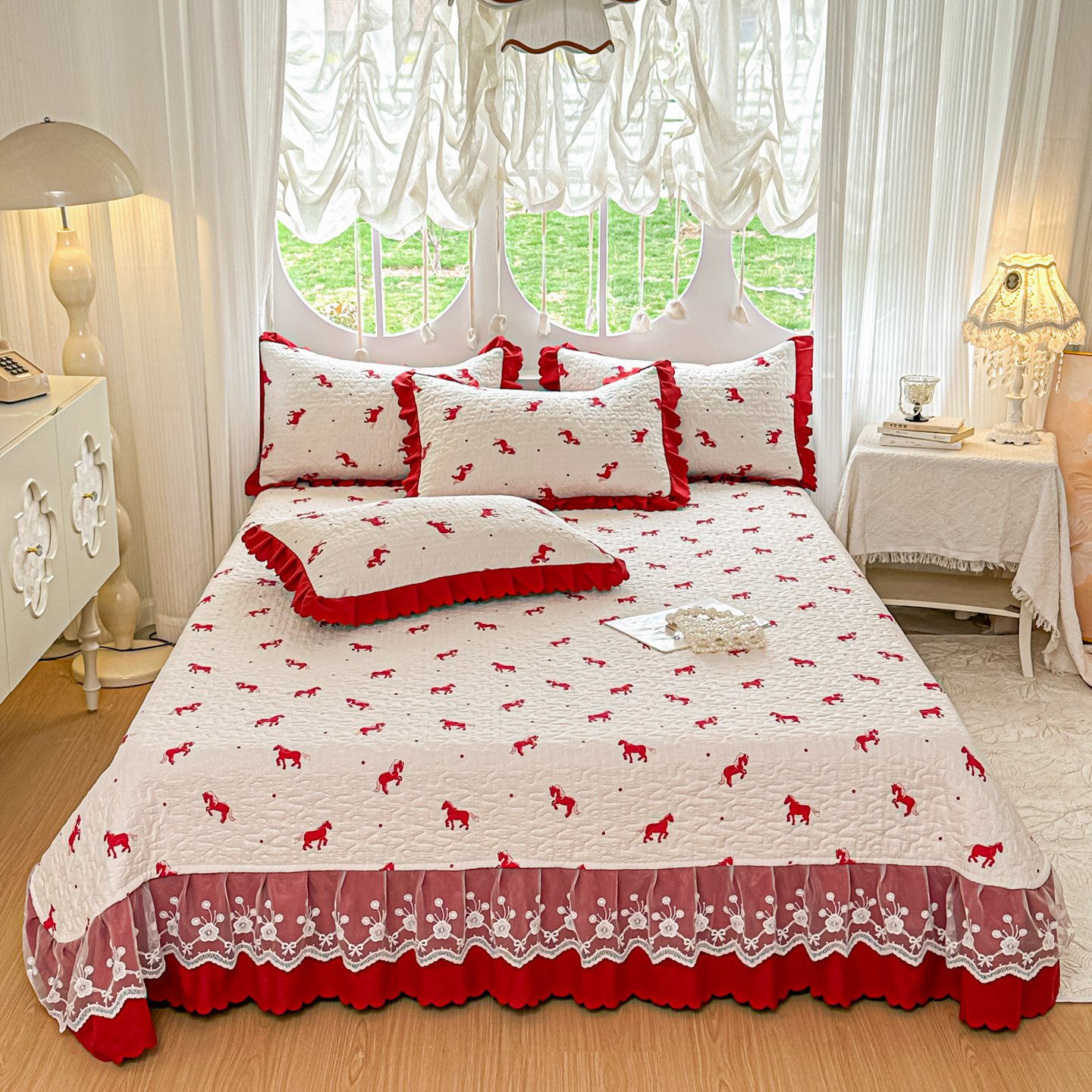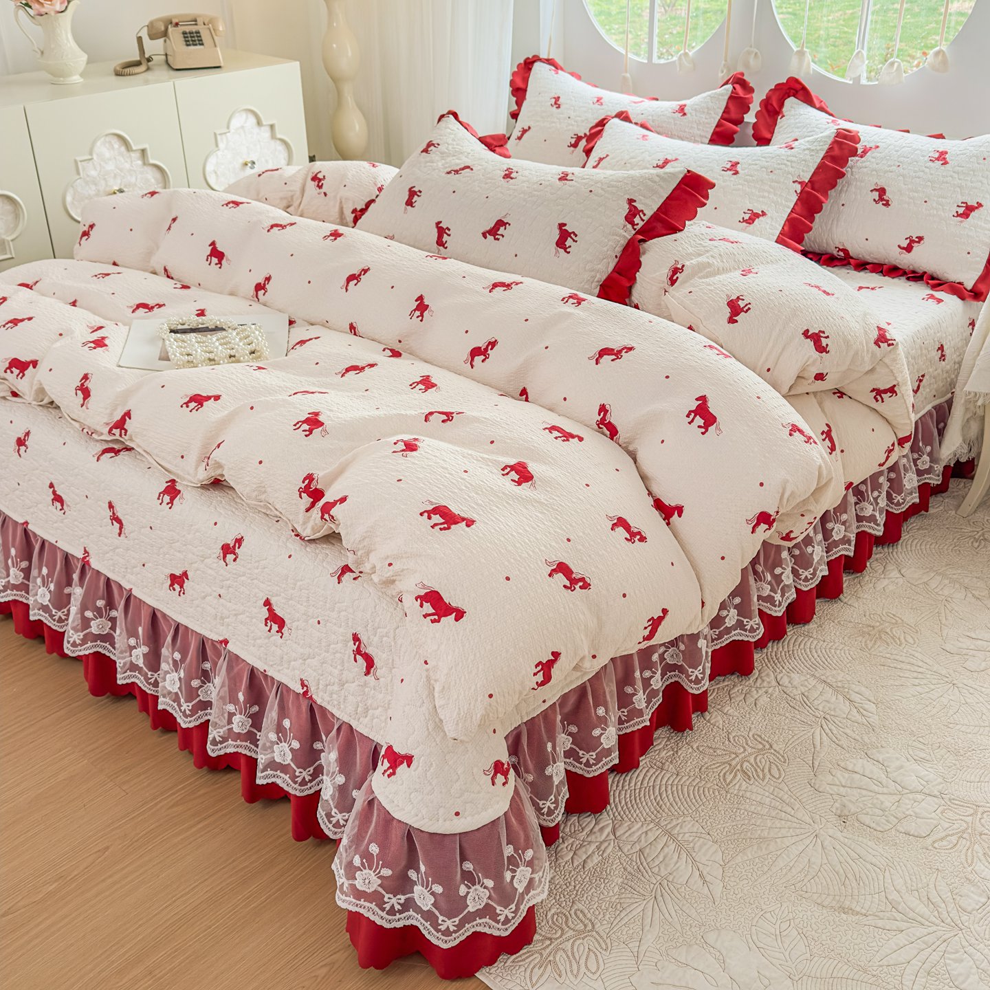 雅眠居 2026直播爆款泡芙棉双层蕾丝花边床盖四件套 红色小马