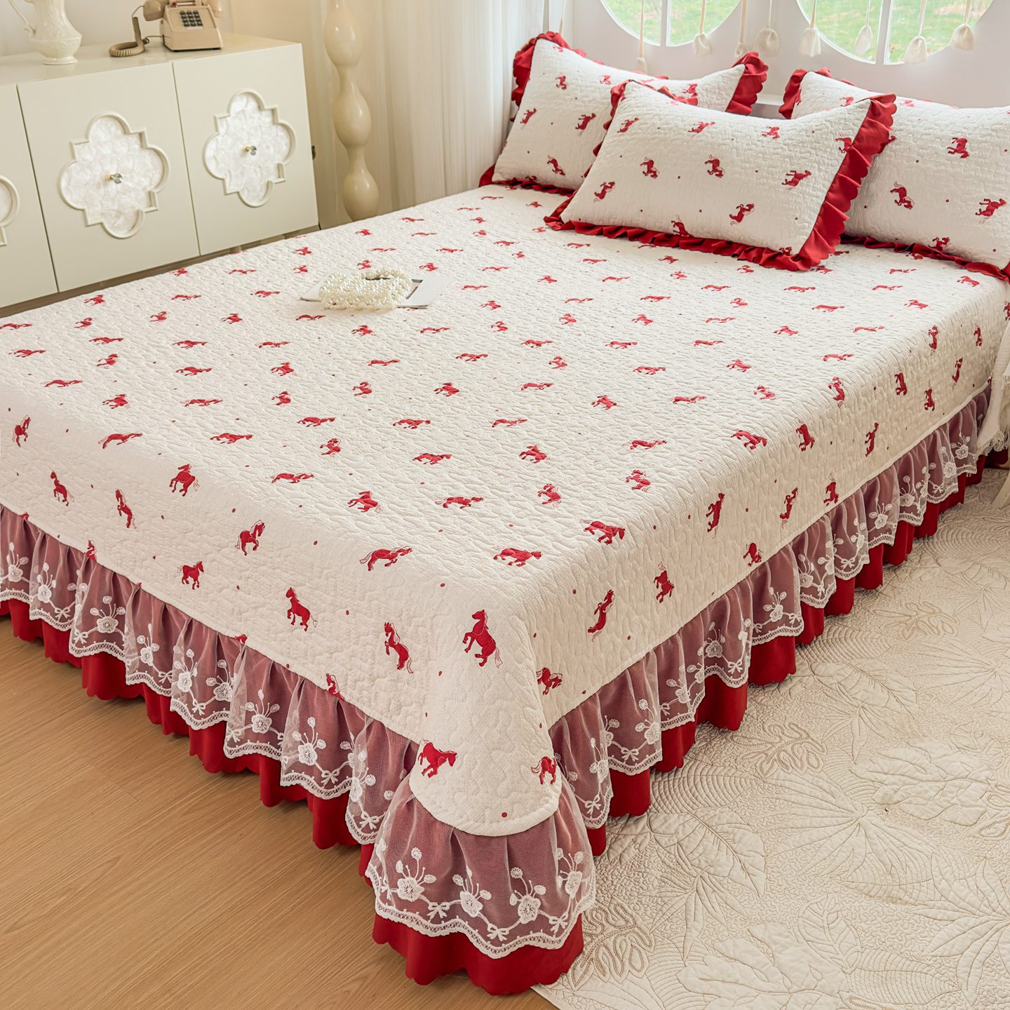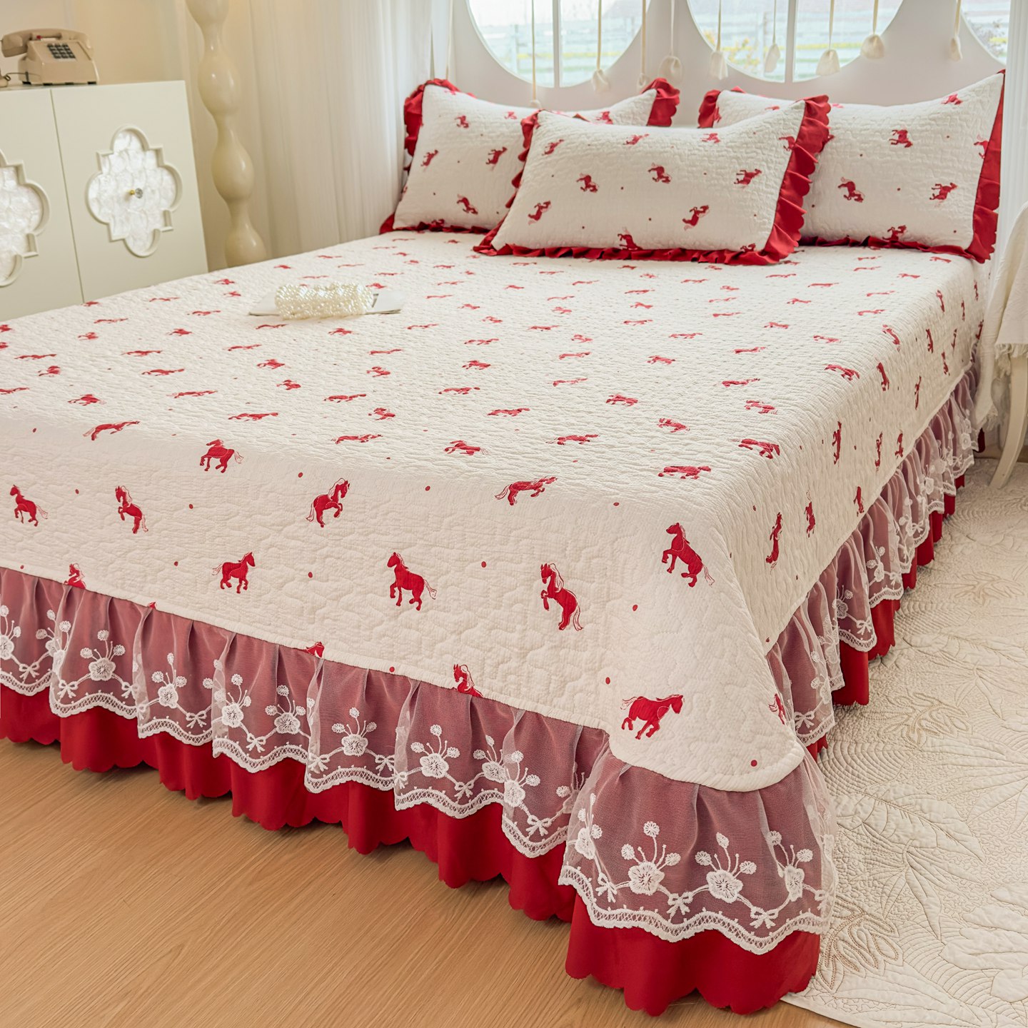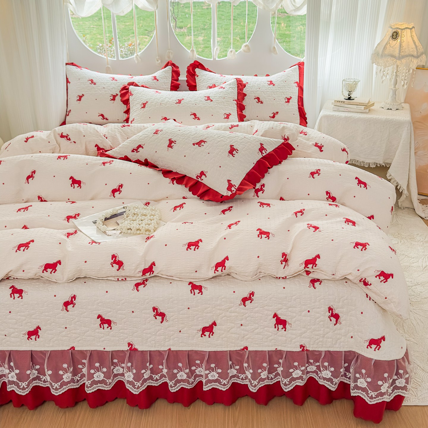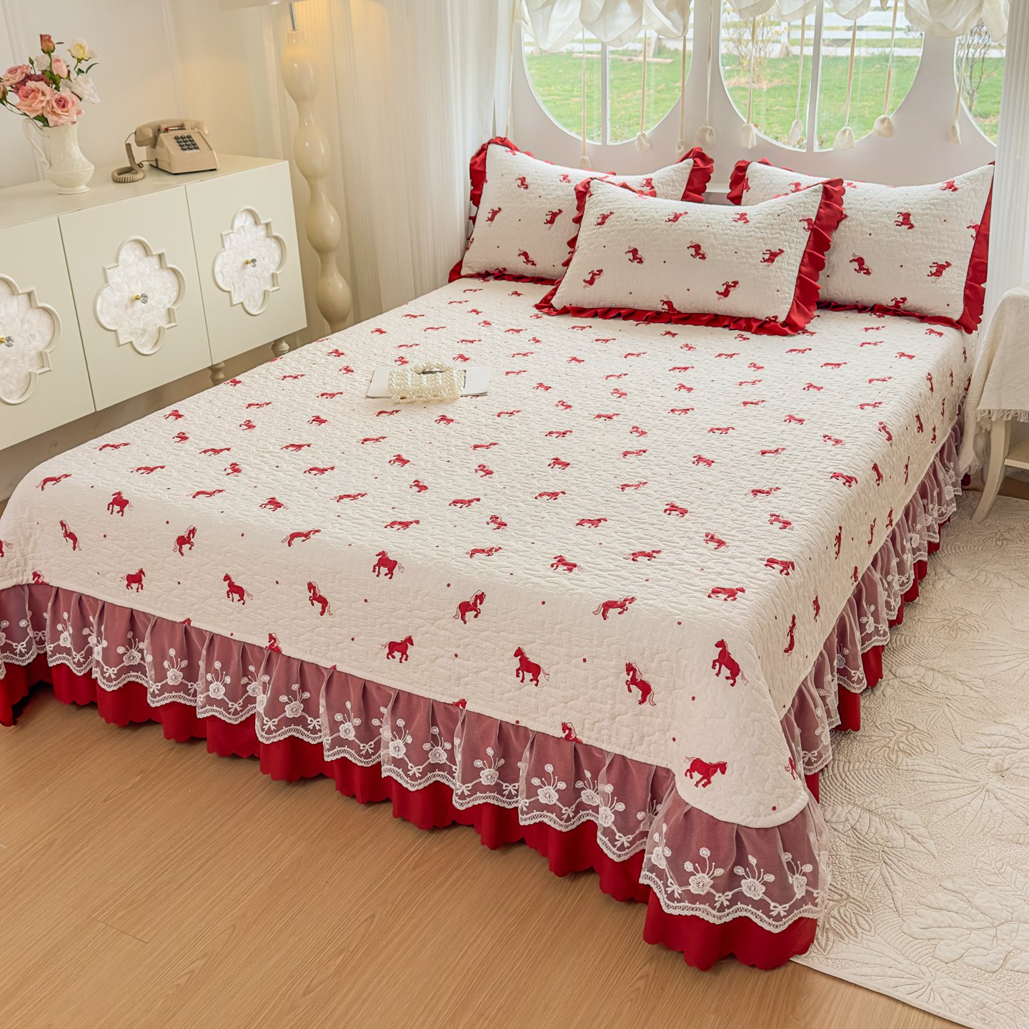 雅眠居 2026直播爆款泡芙棉双层蕾丝花边床盖四件套 红色小马