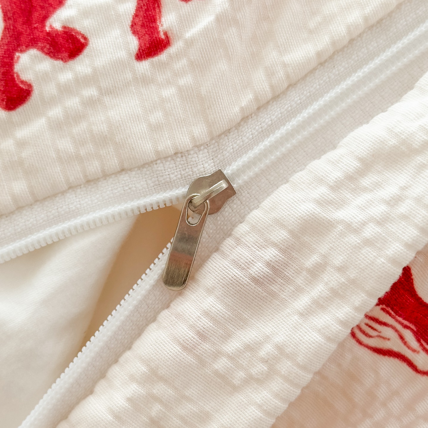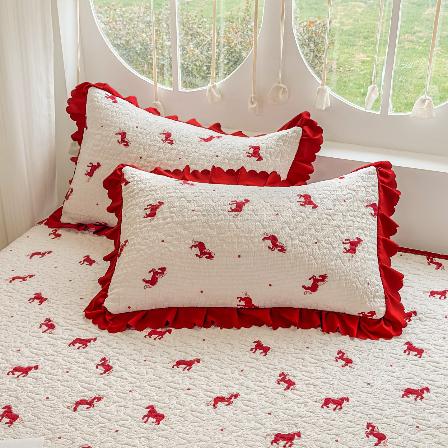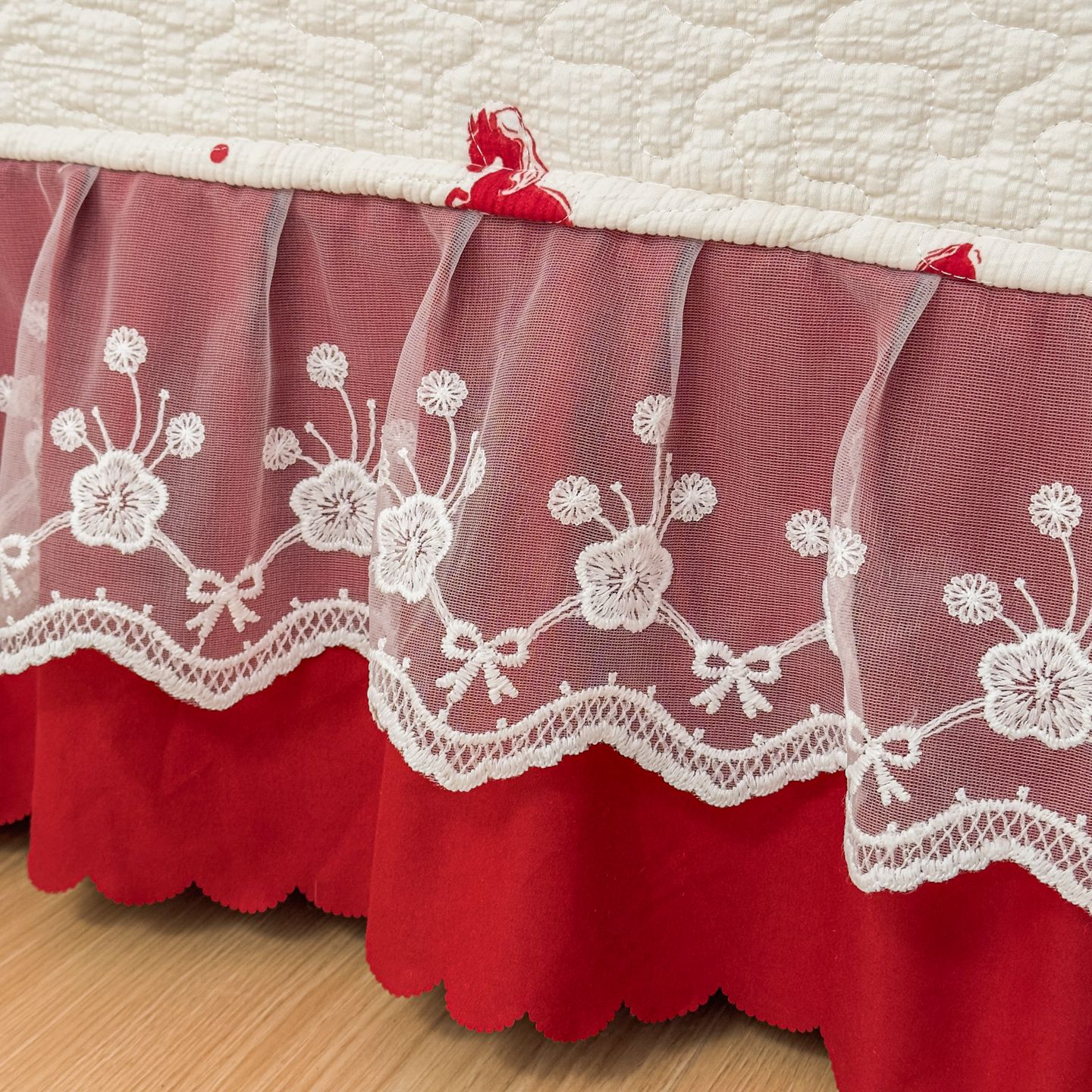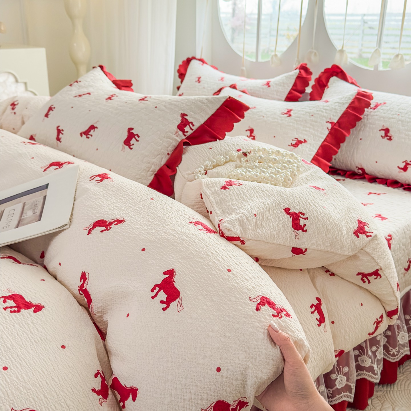 雅眠居 2026直播爆款泡芙棉双层蕾丝花边床盖四件套 红色小马