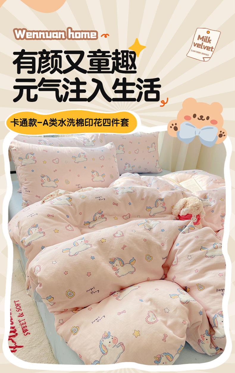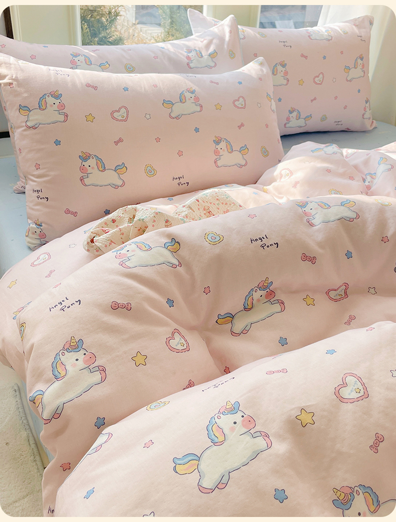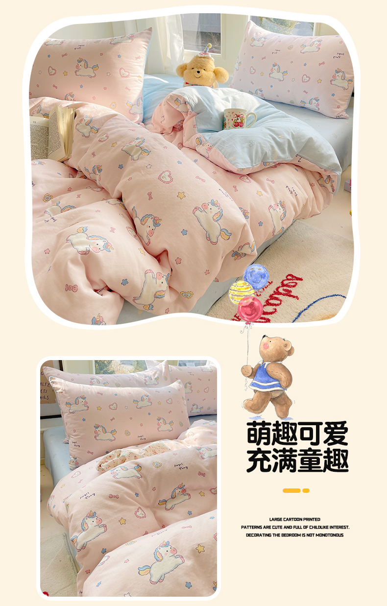 当前位置: 91家纺网 > 商品网购 > 床品套件 > 四件套 > 水洗棉四件套 > 盛秋家纺 2026新款卡通款A类水洗棉印花四件套 天使小马粉+花朵蓝