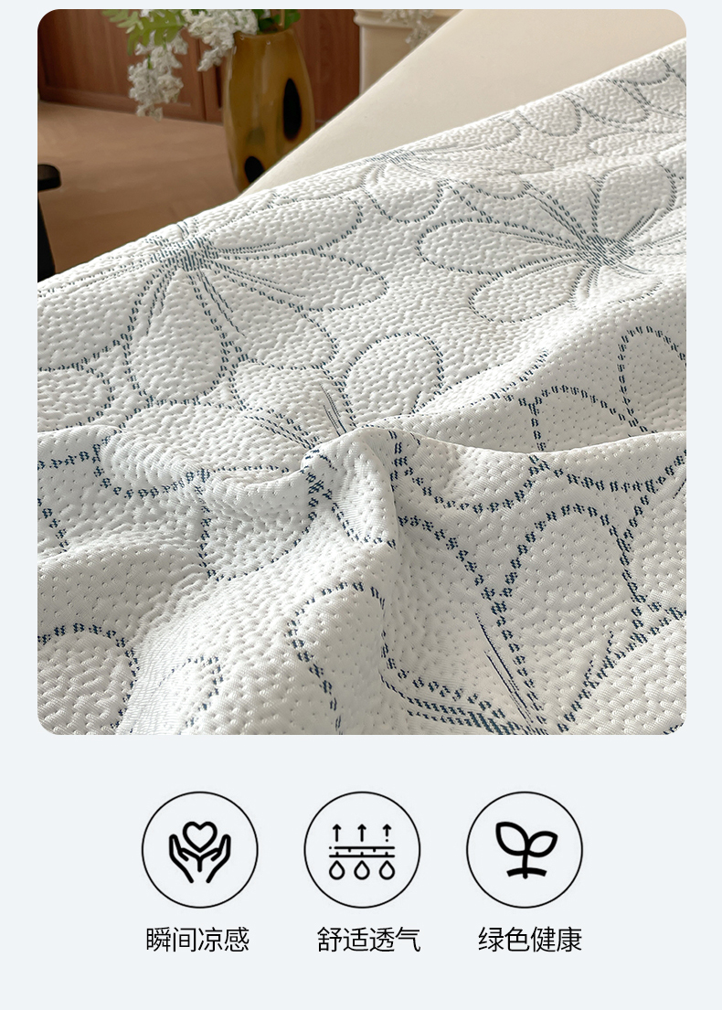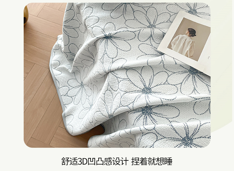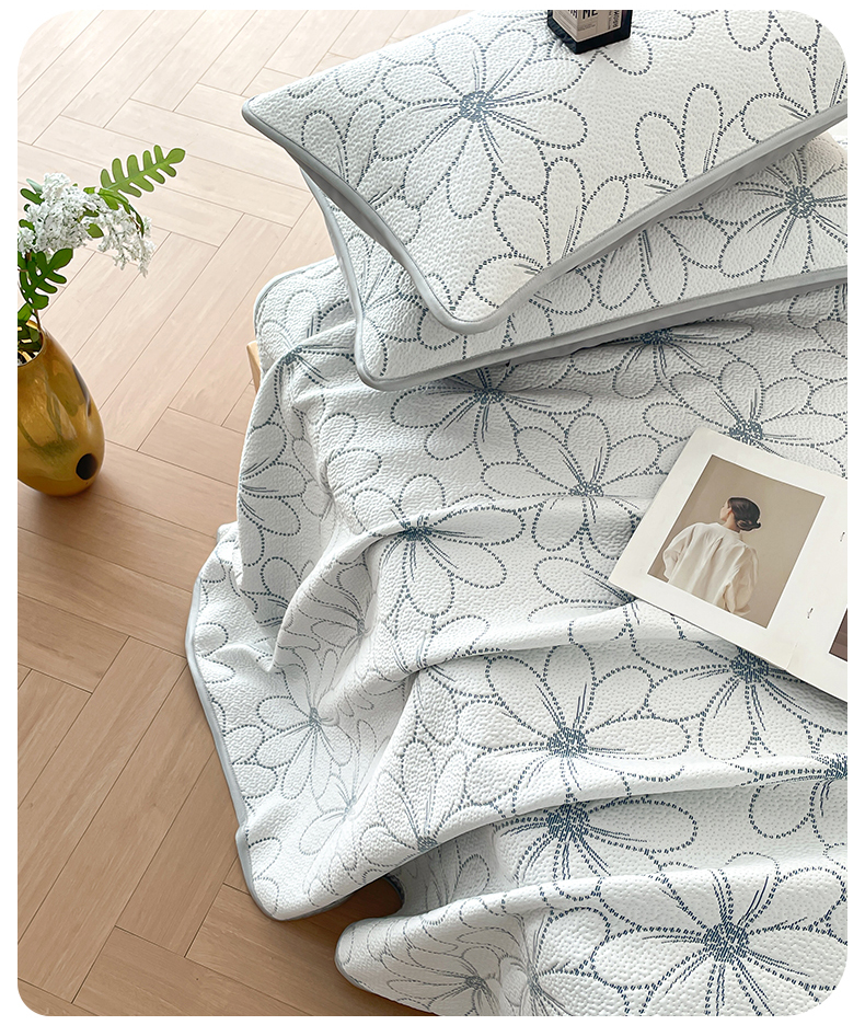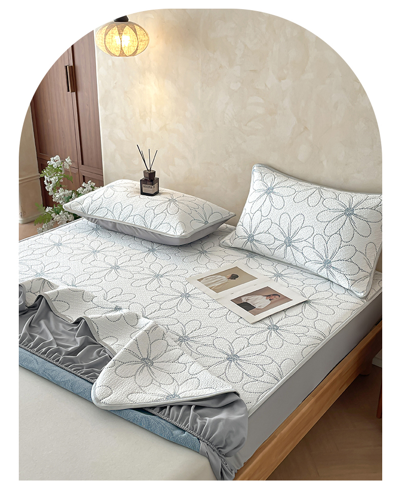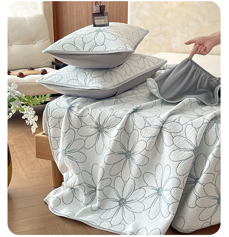 商品名称:羚羊语家纺 2026新款PE提花凉泡泡席床笠款460克冰萃席凉豆豆夏季几何轻奢凉感软席子三件套【配包装】 冰萃席-花沁