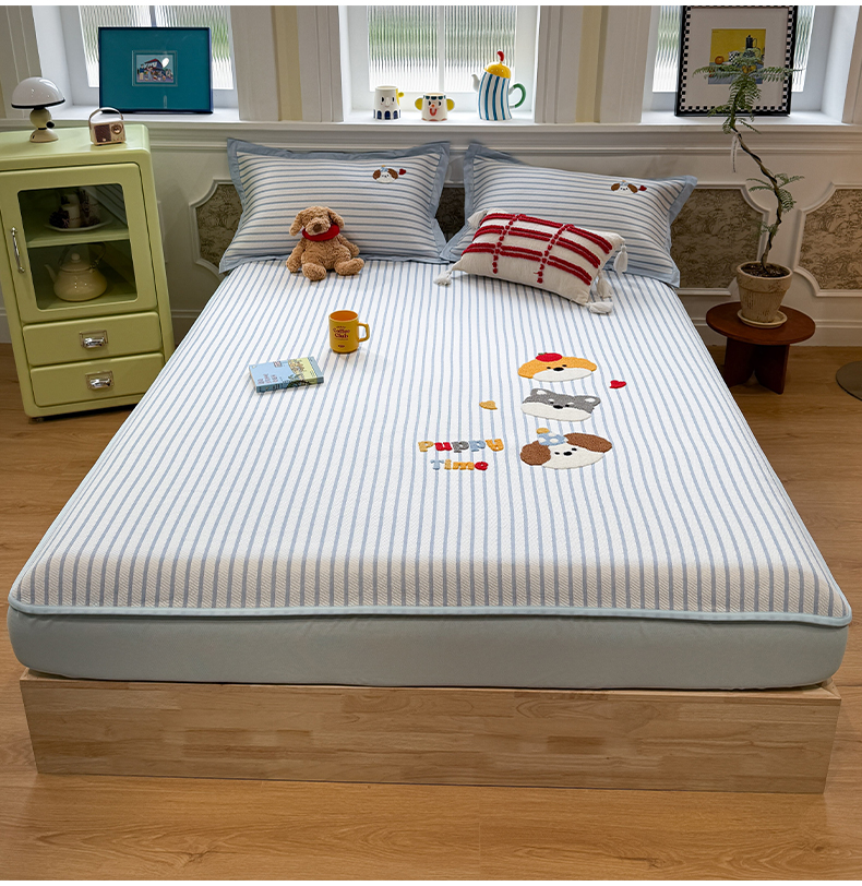 (总)雅居纺家纺 2026新款PE凉感卡通床裙床盖凉席韩版花边加厚三明治底PE凉感席,粉色猫咪家族,粉色星星腊肠狗,萌萌苹安果,汪星人,夏日苹果狗,幸运酷熊