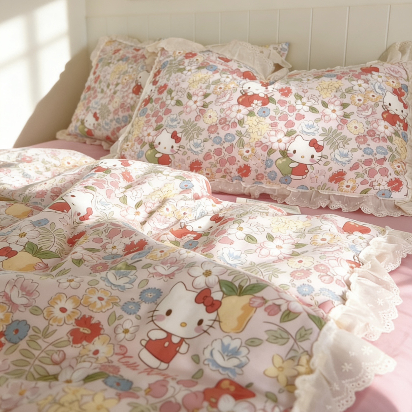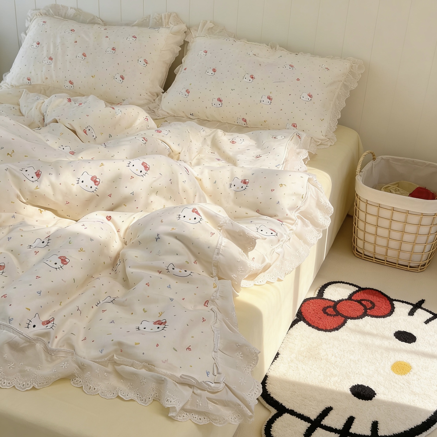 当前位置: 91家纺网 > 商品网购 > 床品套件 > 四件套 > 全棉普通四件套 > (总)荣轩家居 2026新款三丽鸥正版授权重工韩式蕾丝花边全棉纯棉双层纱四件套(铺床版)