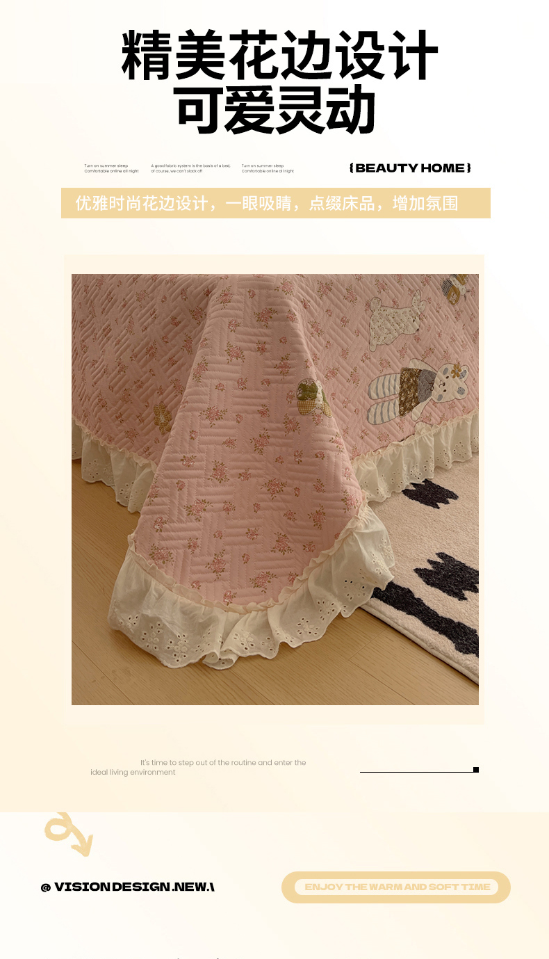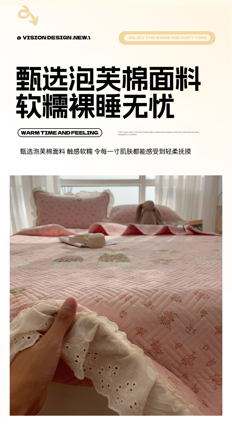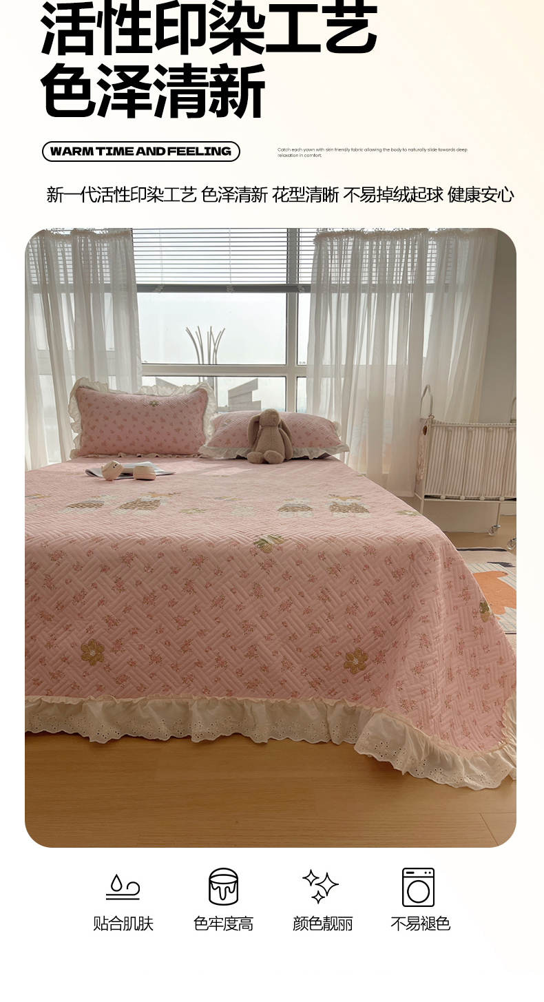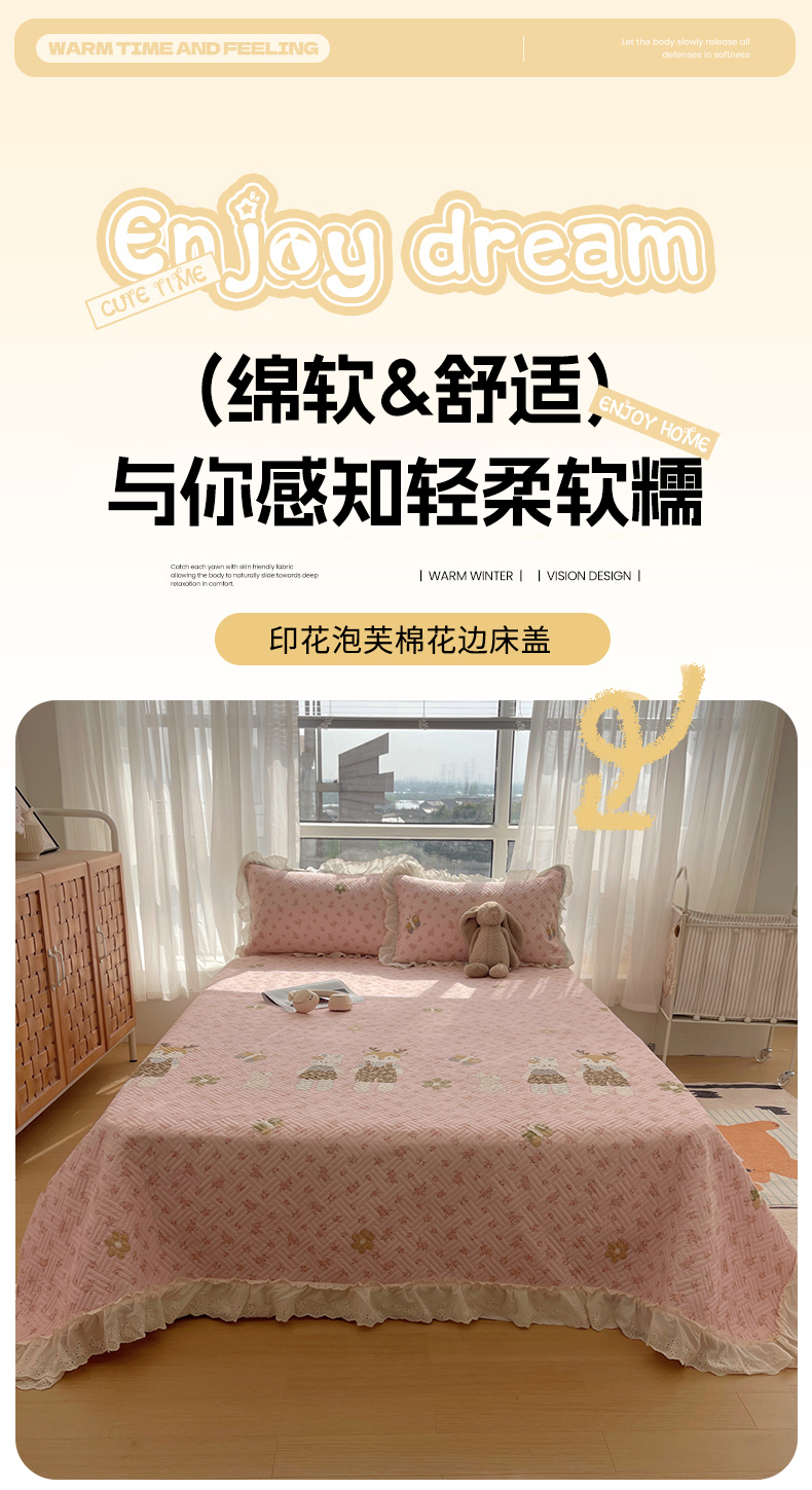 • 91家纺网 家纺一手货源 找家纺 爱彼家纺 2026新款印花泡芙棉花边床盖三件套-泡芙床盖 花边-温馨时光