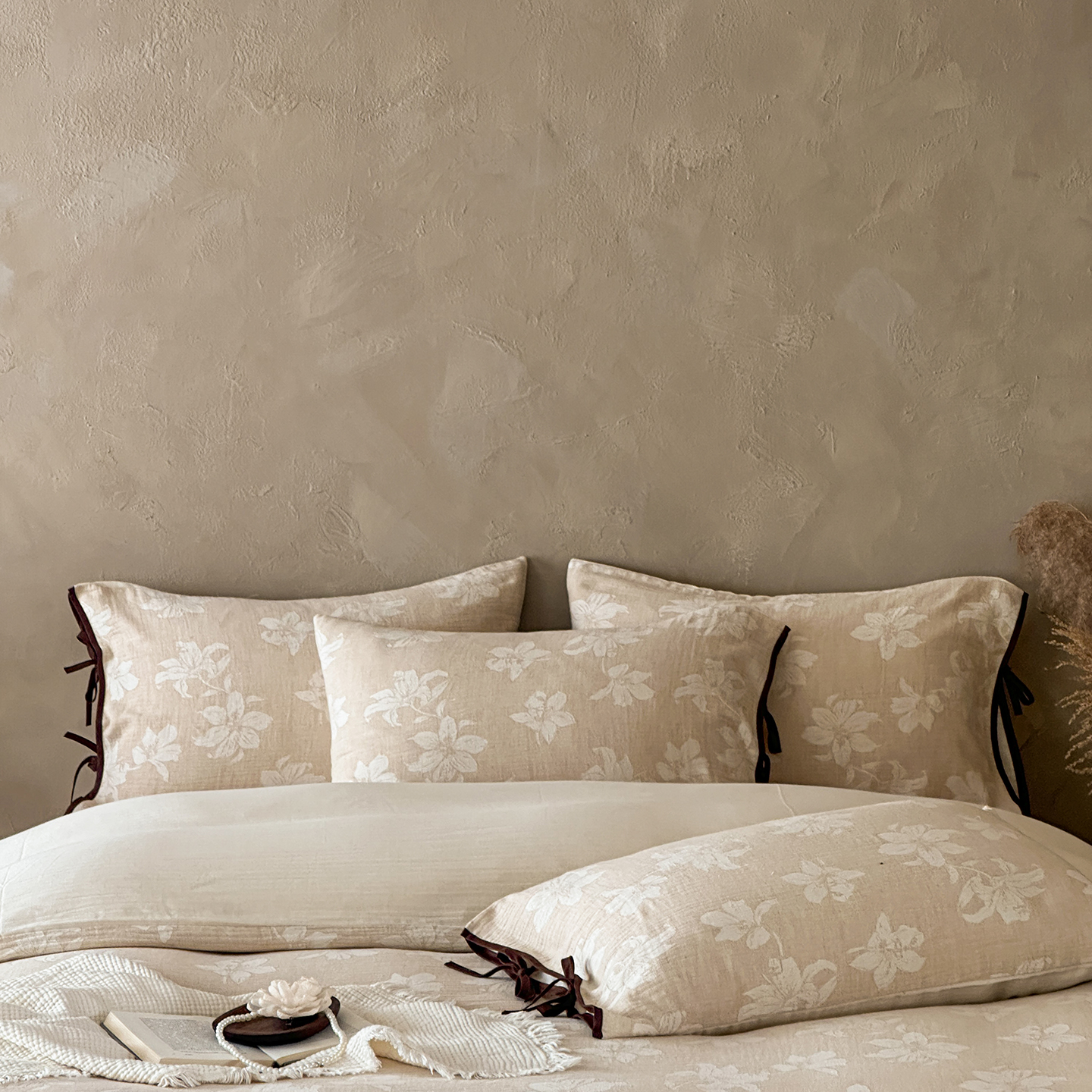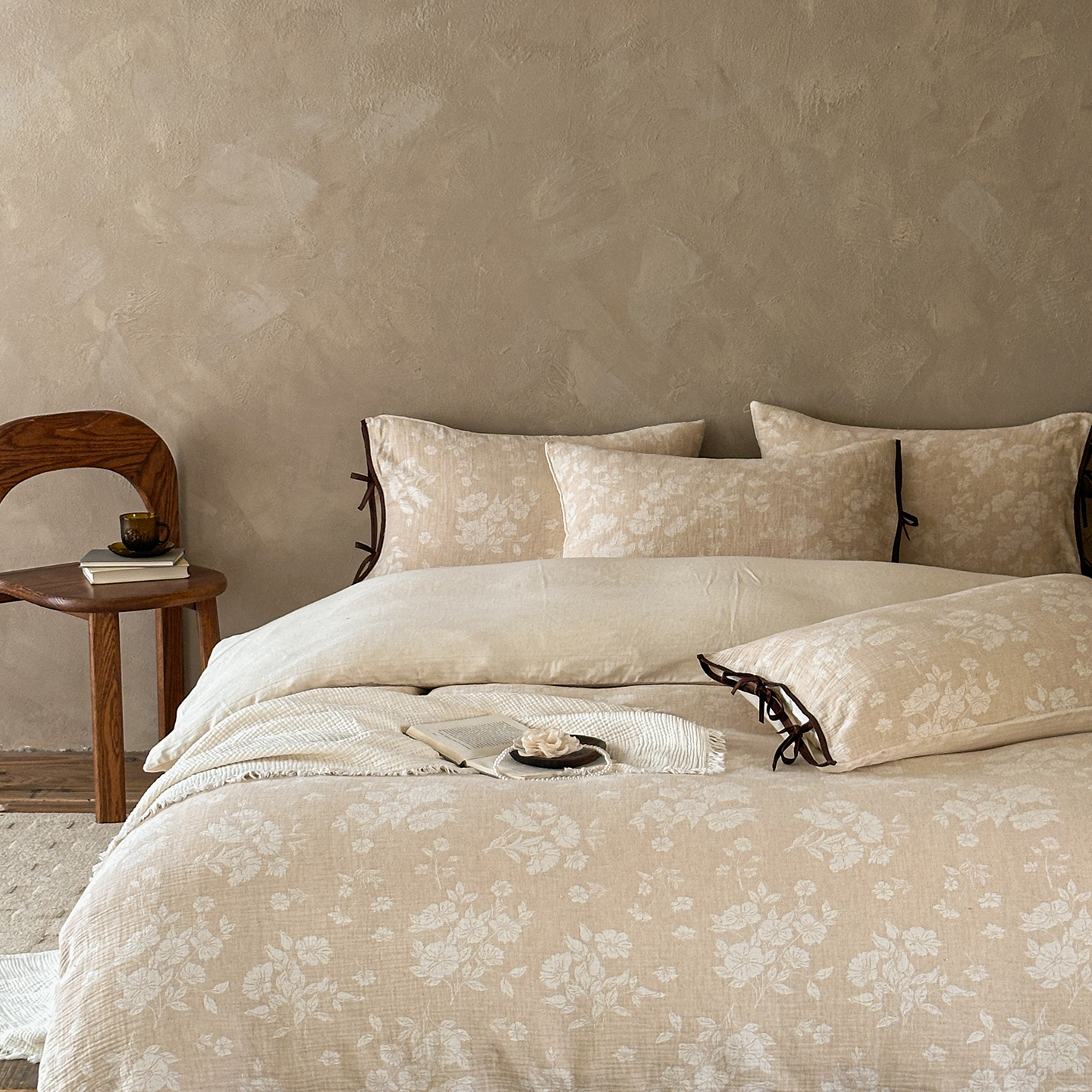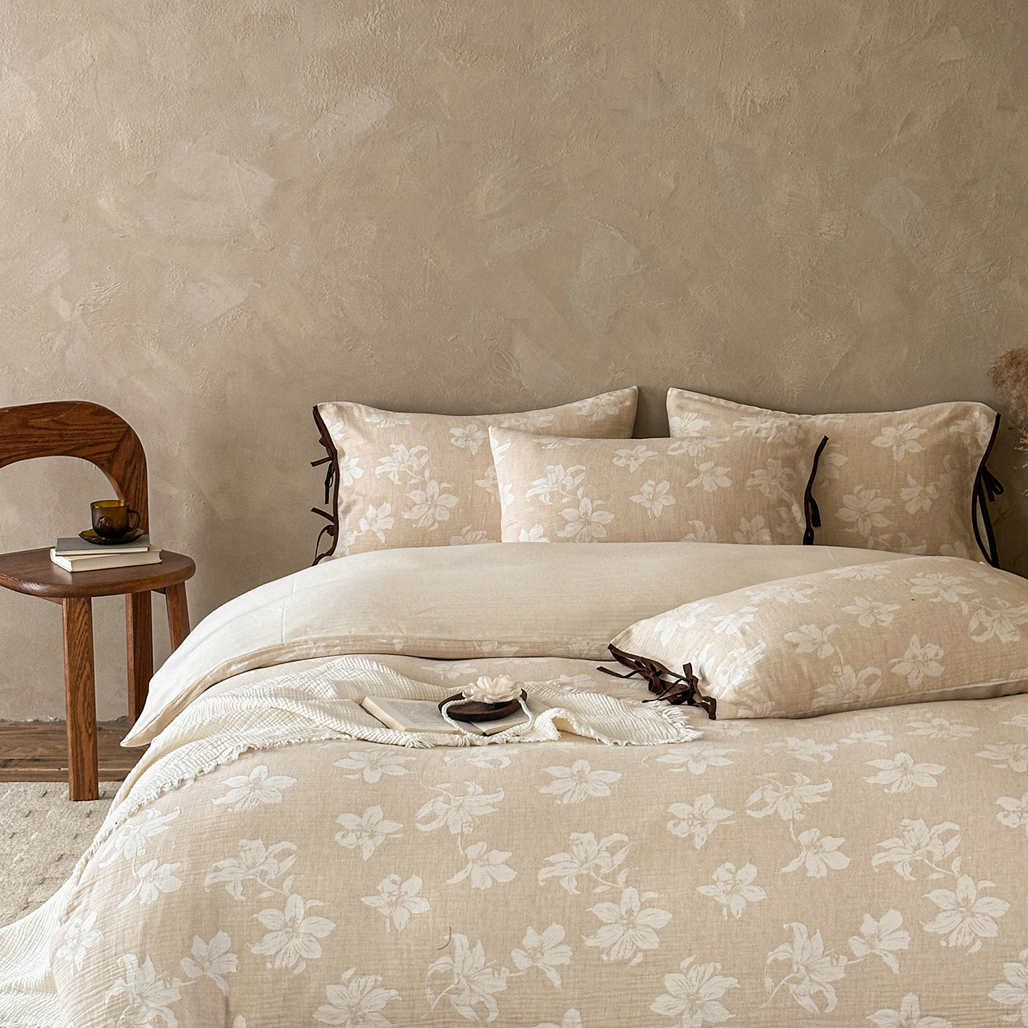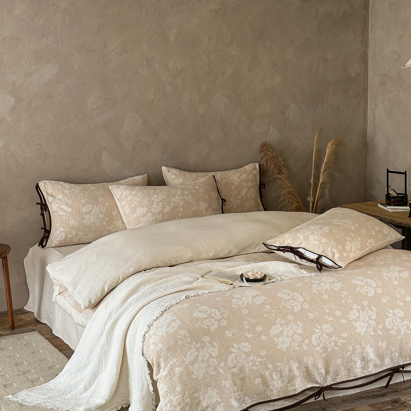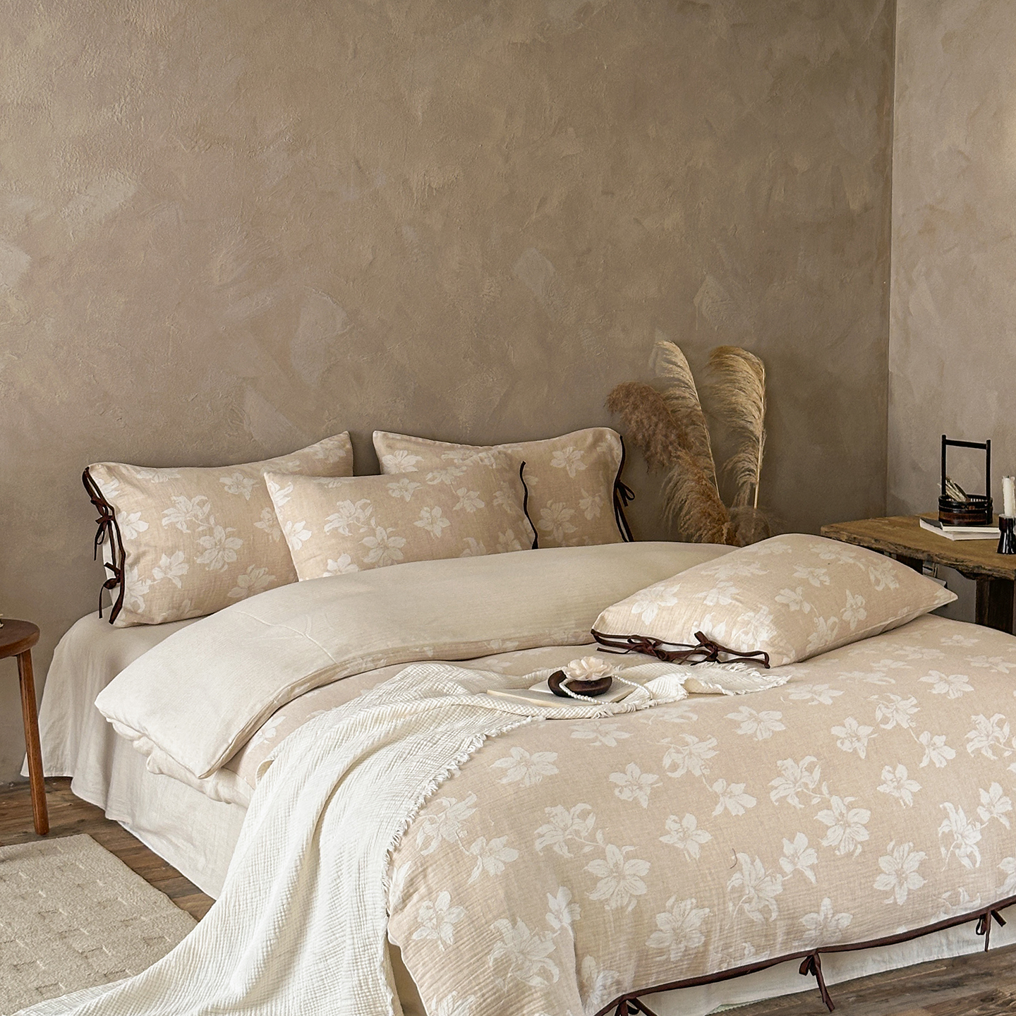 (总)爱丽丝 2026新款棉麻双层纱四件套-素枝木兮花边款,素枝木兮花边款